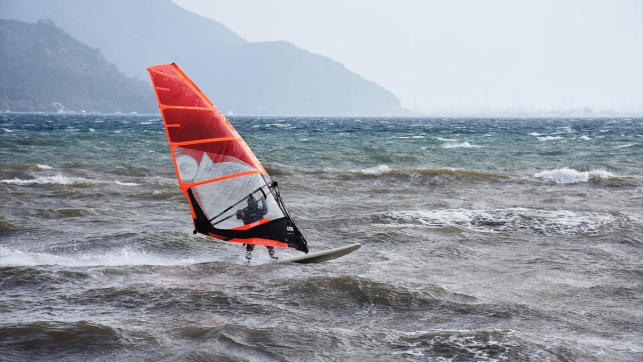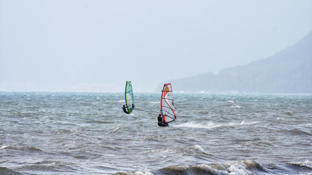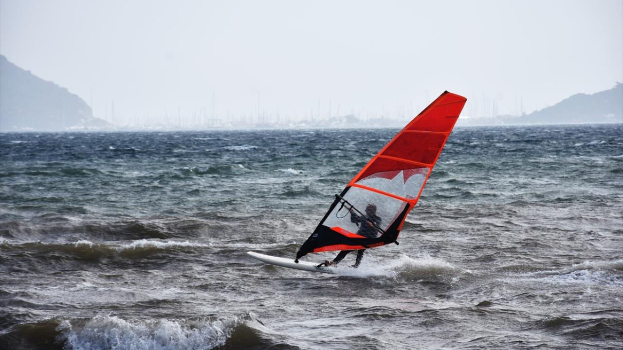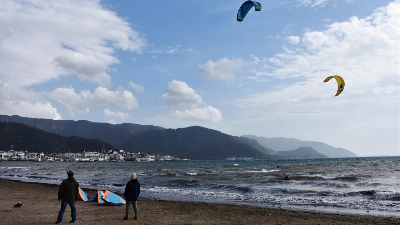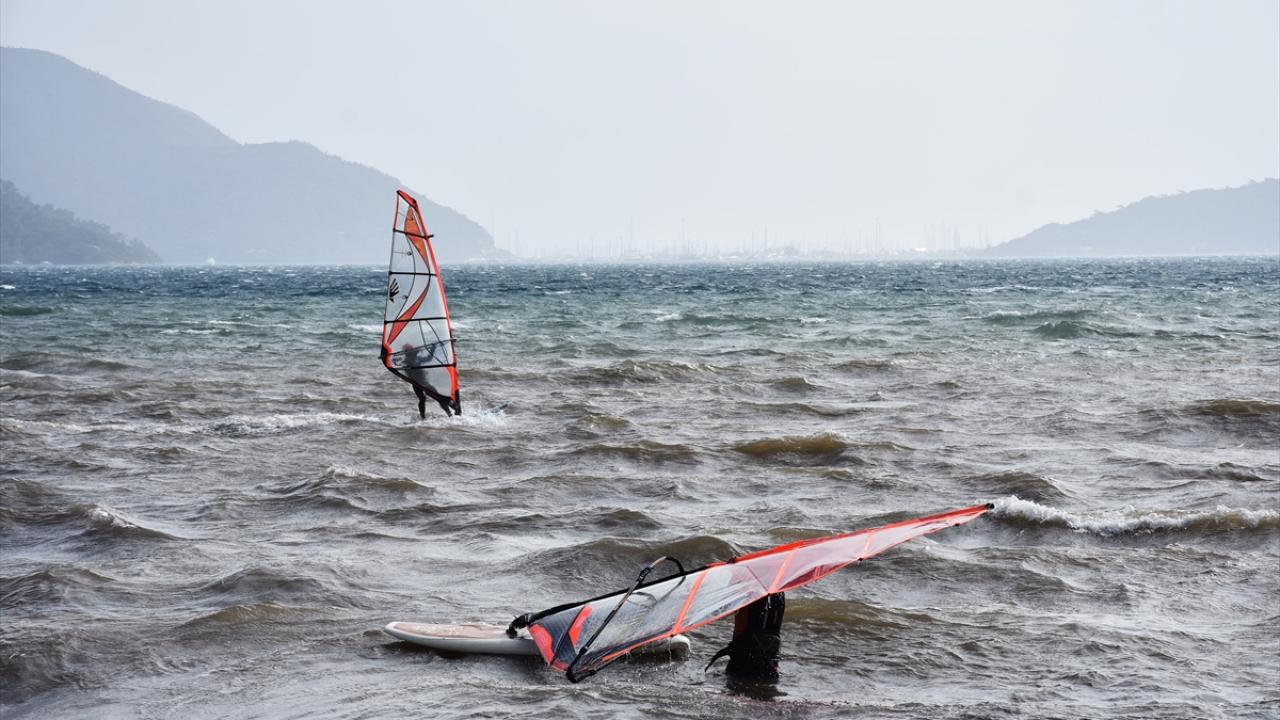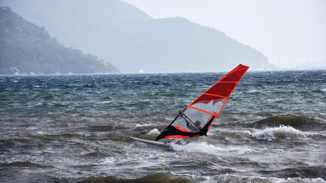 Muğla'nın Marmaris ilçesinde saatte 63 kilometre hızla güneyden esen kıbleyi fırsata çeviren adrenalin tutkunları, denizde rüzgar ve uçurtma sörfü yaptı.