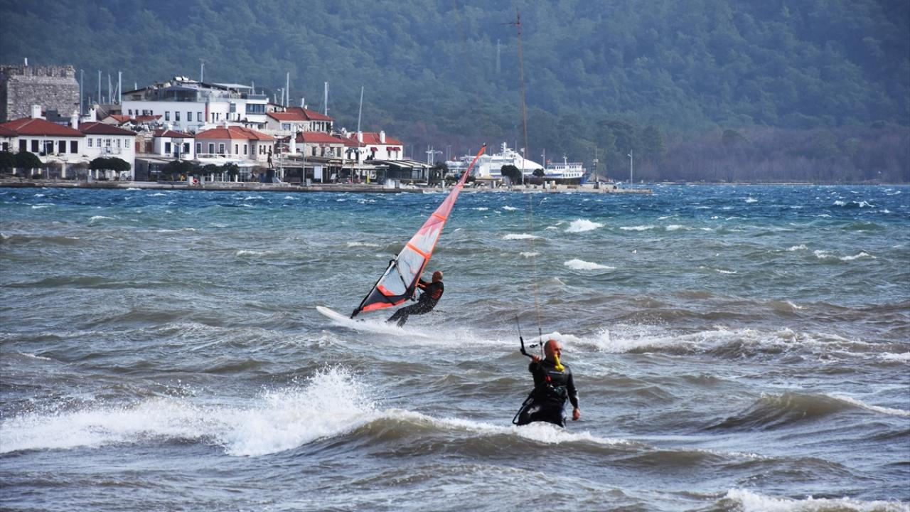 Dalgalar arasında rüzgar ve uçurtma sörfü yapanlar, renkli görüntüler oluştururken, sörfçüleri kıyıdaki vatandaşlar da ilgiyle izledi.