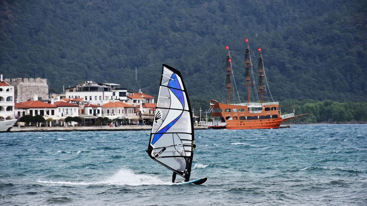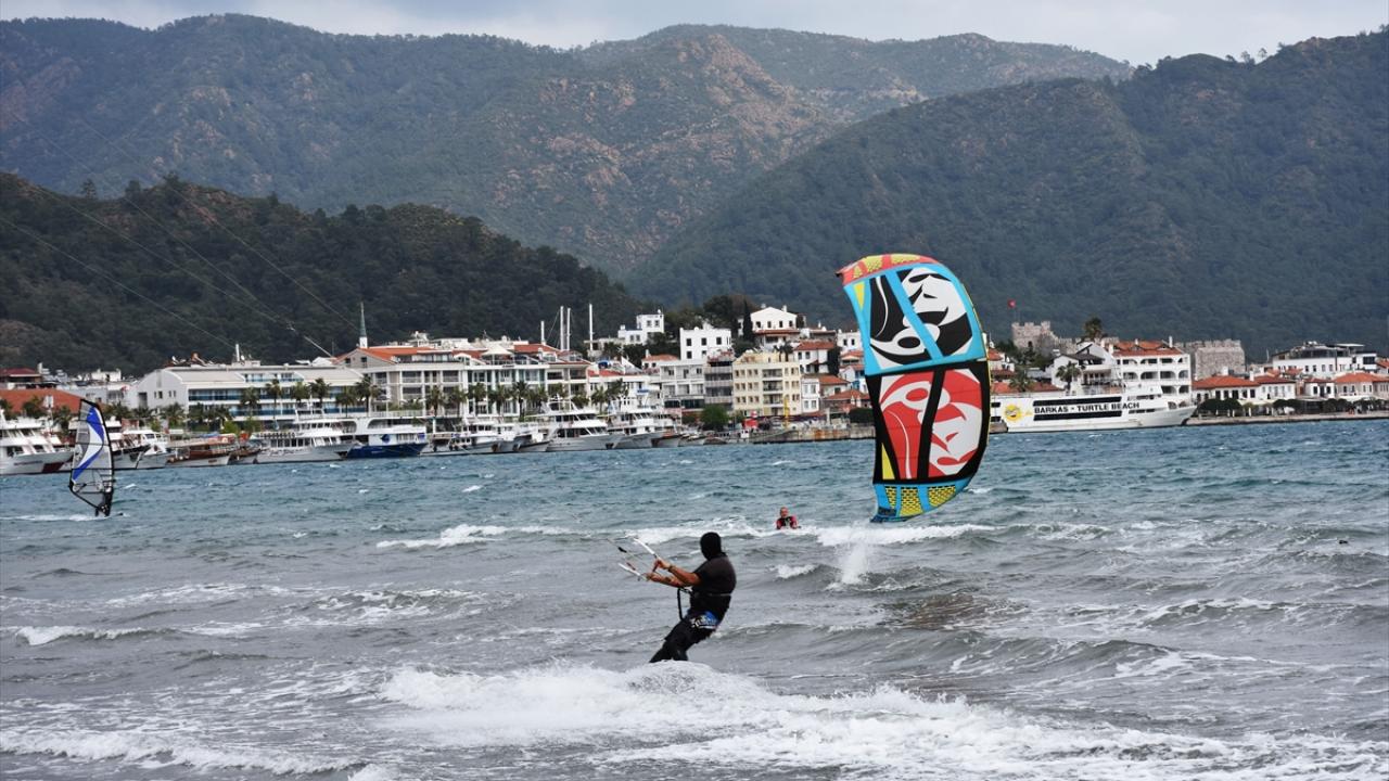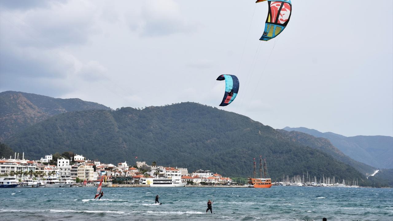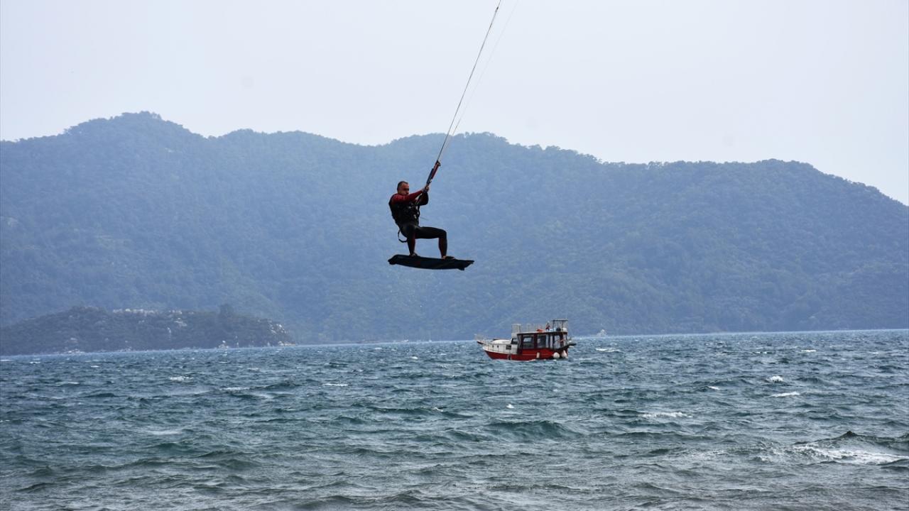 Muğla'nın Marmaris ilçesinde saatte 35 kilometre hızla esen keşişlemeyi fırsata çeviren adrenalin tutkunları, denizde rüzgar ve uçurtma sörfü yaptı.