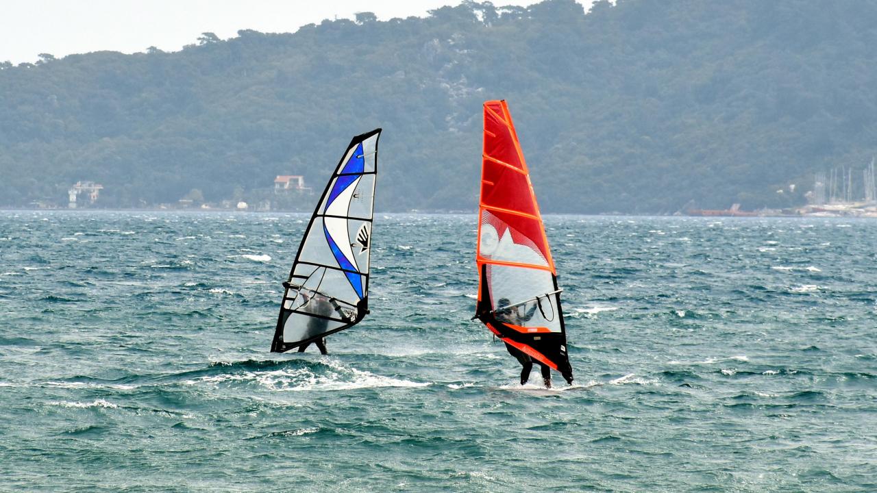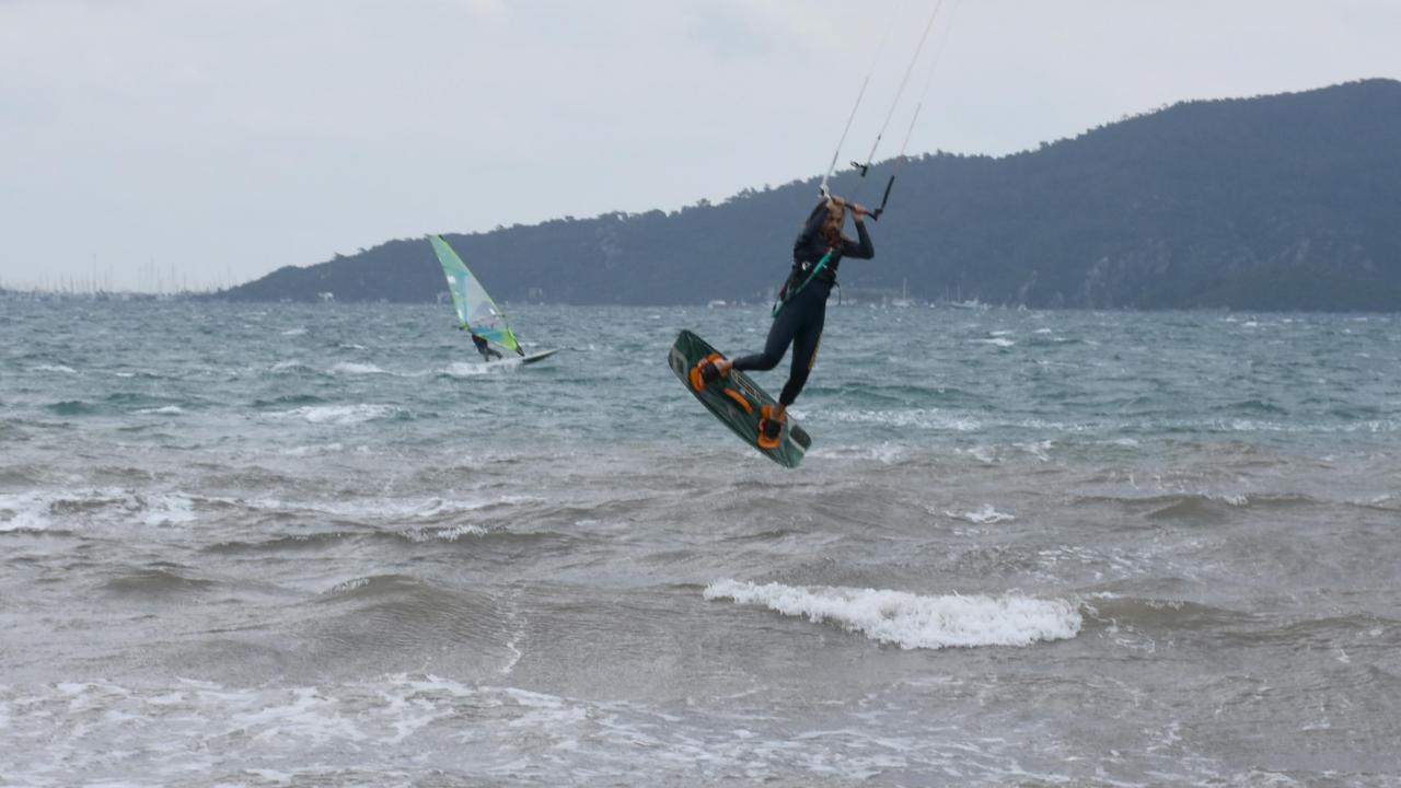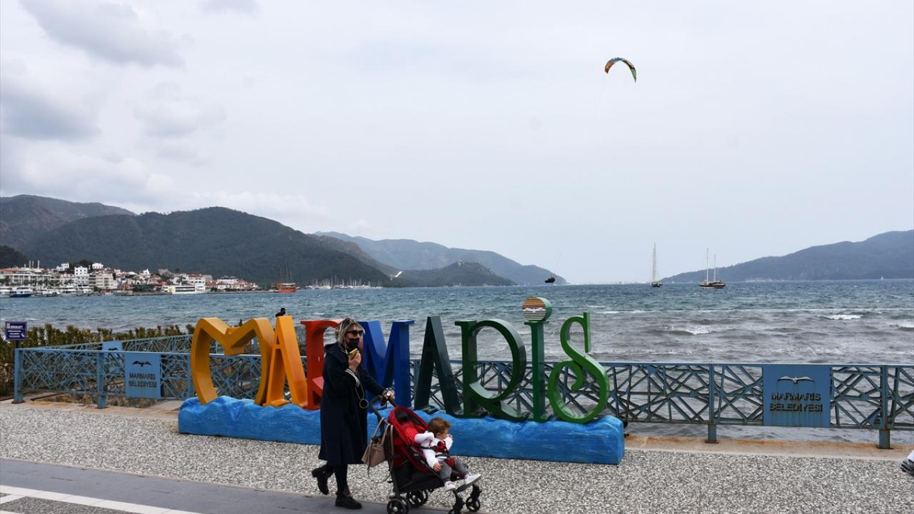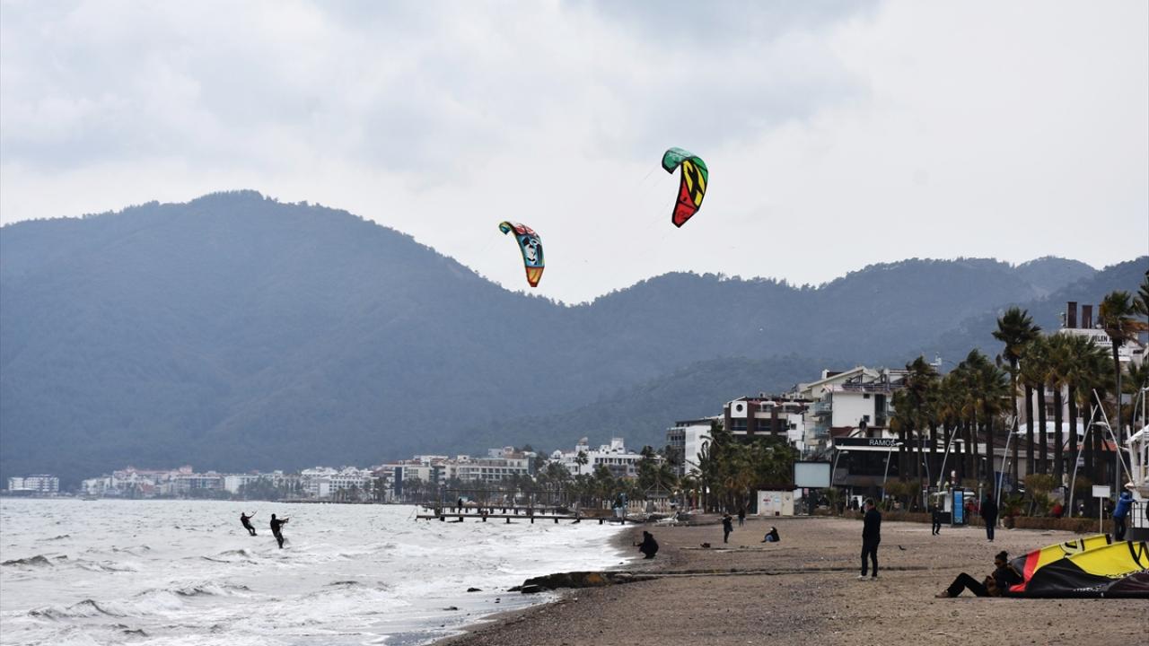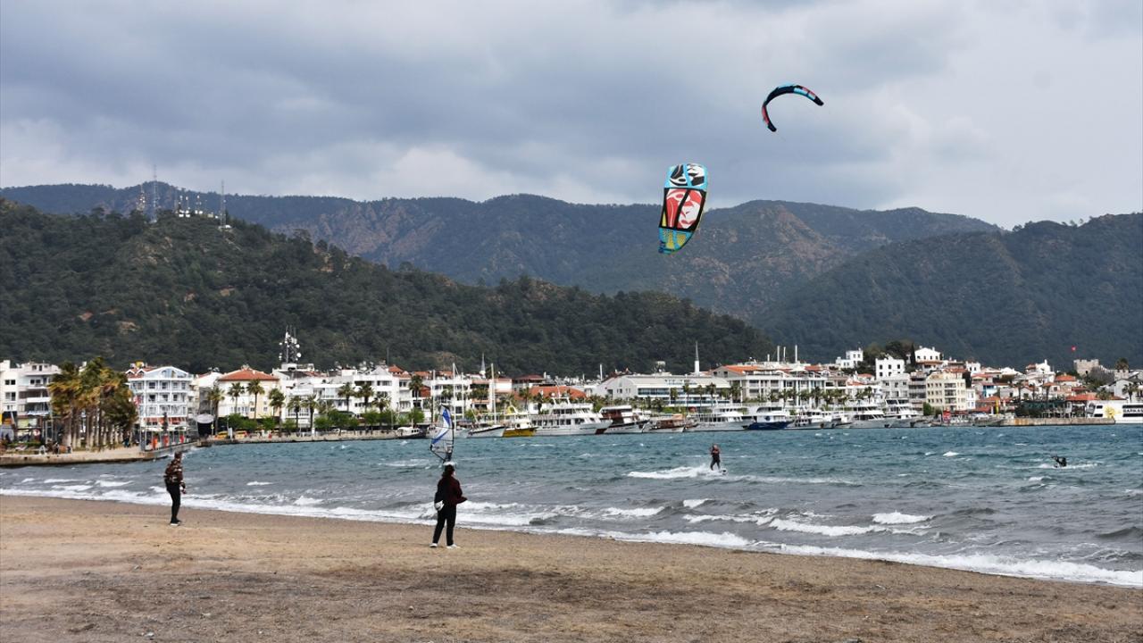Muğla'nın Marmaris ilçesinde saatte 35 kilometre hızla esen keşişlemeyi fırsata çeviren adrenalin tutkunları, denizde rüzgar ve uçurtma sörfü yaptı.
