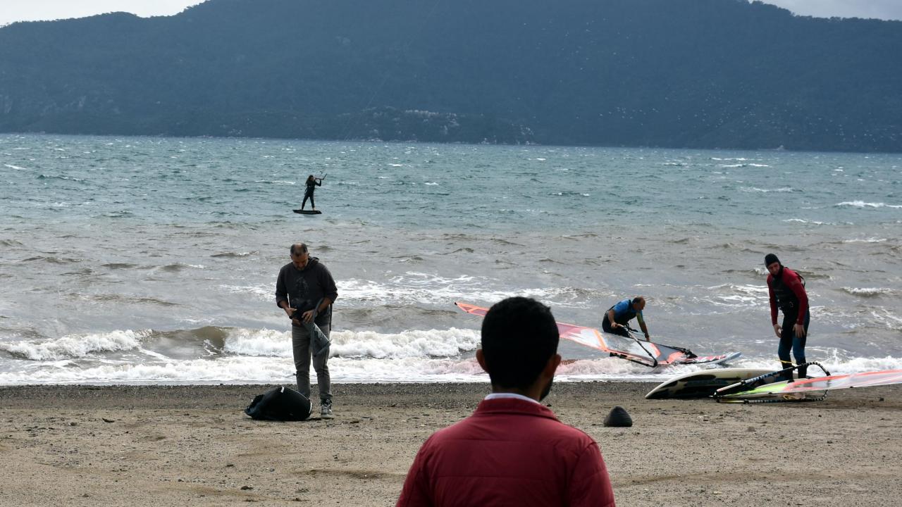 Uçurtma sörfü yapan iş adamı Ferhat Turan, "Uzun zamandır uçurtma sörfü yapıyorum. Pandemi nedeniyle ara vermiştim. Bugün rüzgarlı havayı görünce sahile gelip anın keyfini çıkarmak istedim. Stresimi uçurtma sörfü ile atıyorum" dedi.