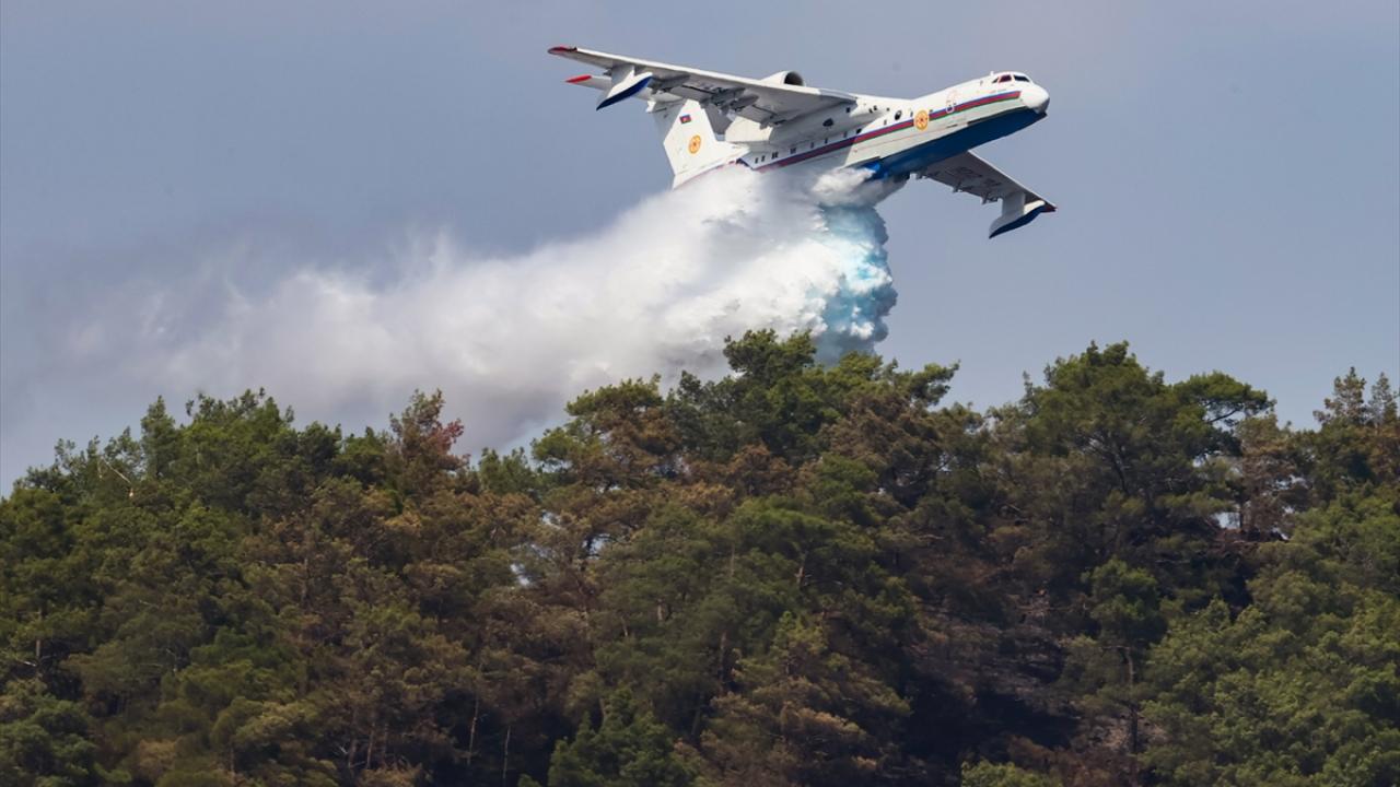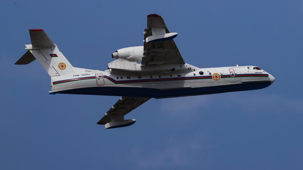 Azerbaycan Acil Durumlar Bakanlığı tarafından yangın bölgesine gönderilen "BE-200CS" amfibi uçağı, 12 ton su taşıma kapasitesiyle de yangının yayılmaması için büyük çaba harcıyor.