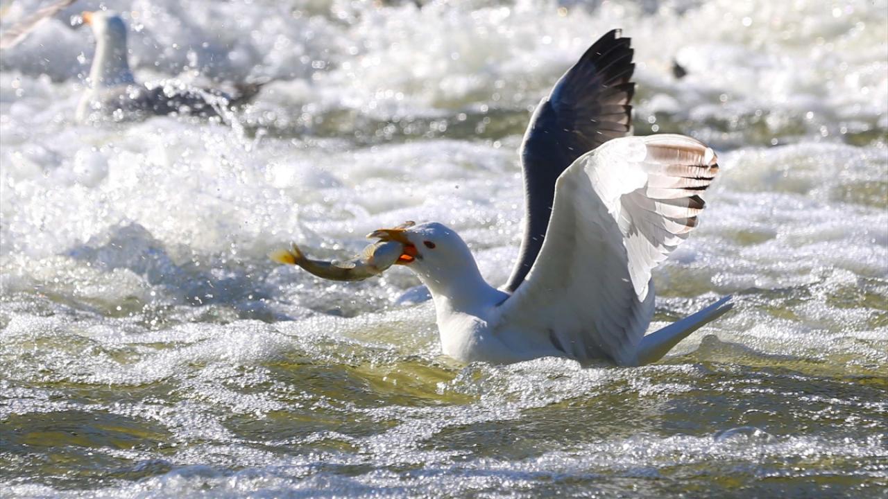 Balık göçünün yoğun yaşandığı Erciş ilçesindeki akarsulara akın eden martılar, inci kefallerini avlayarak besleniyor.