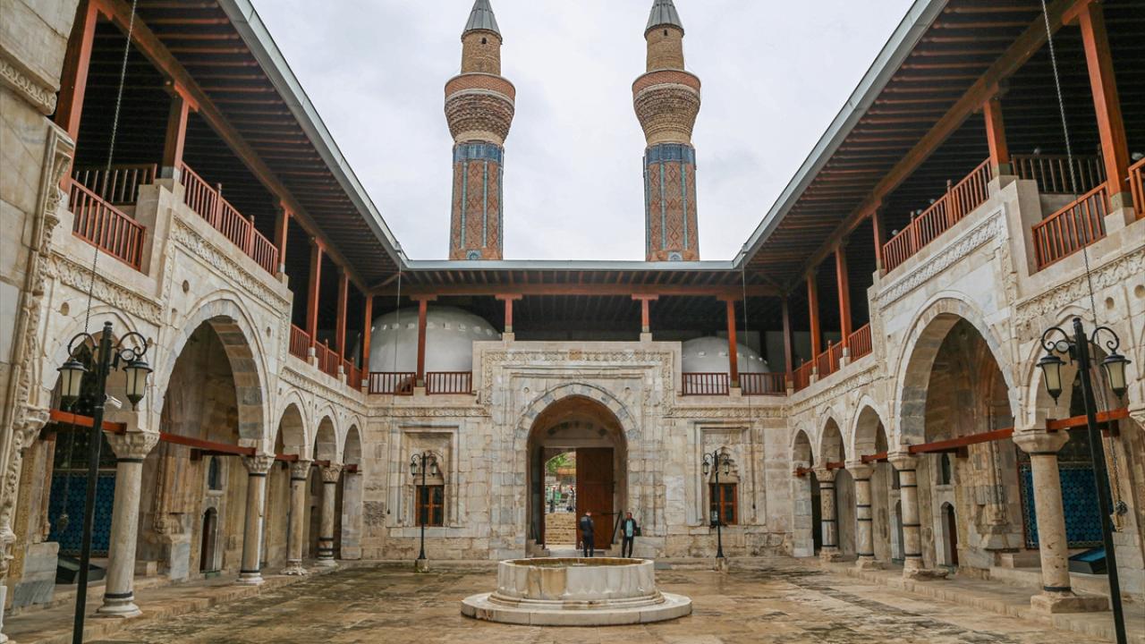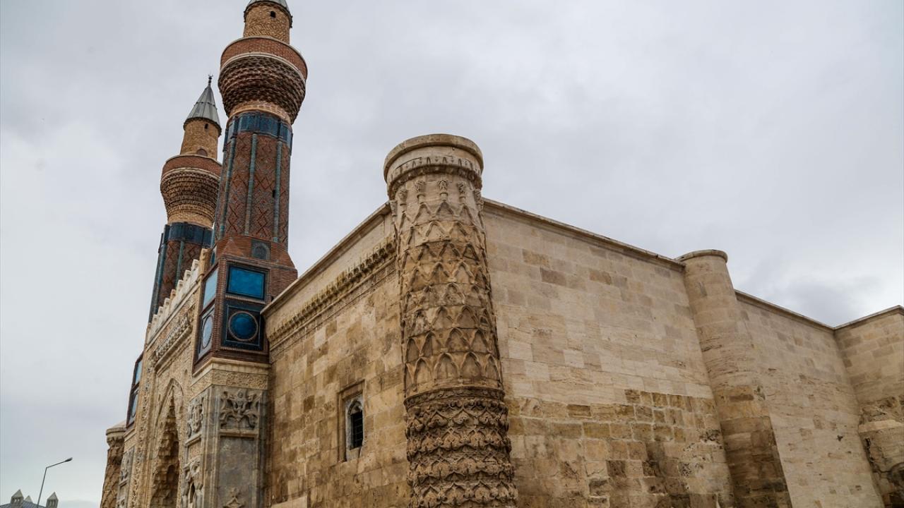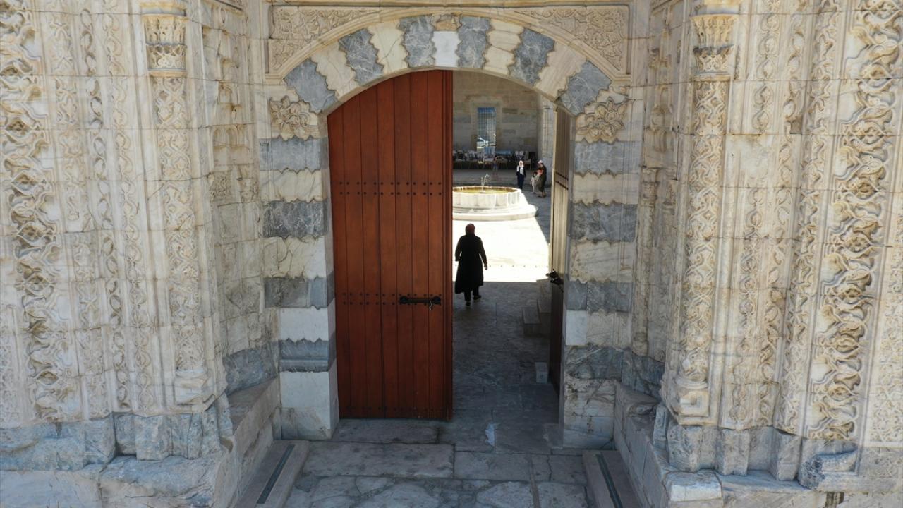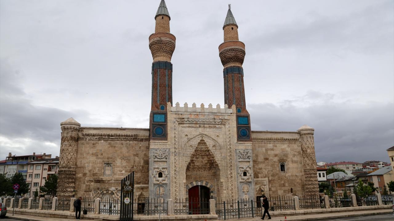 Sivas'ta, Selçuklu Veziri Sahip Ata Fahreddin Ali tarafından 1271 yılında mimar Konyalı Kaluyan'a yaptırılan, üzerindeki gök mavisi çinilerden dolayı "Mavi Medrese" olarak da anılan Gök Medrese, FPV dron ile görüntülendi.