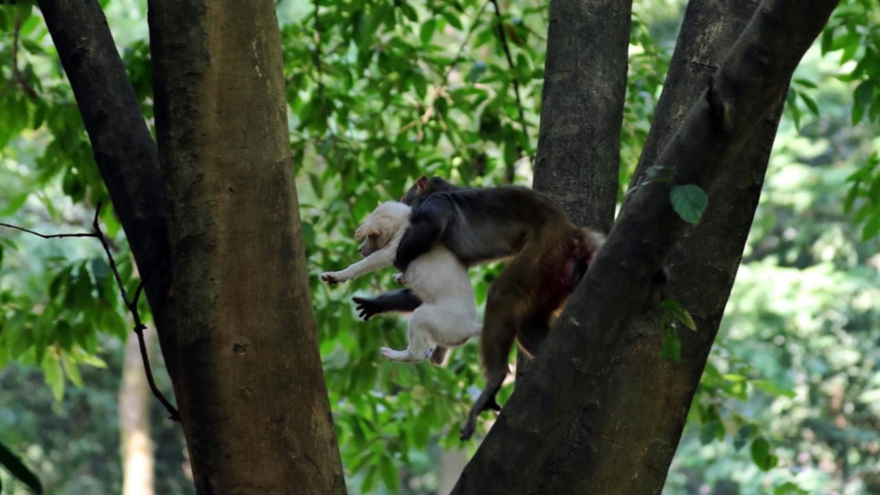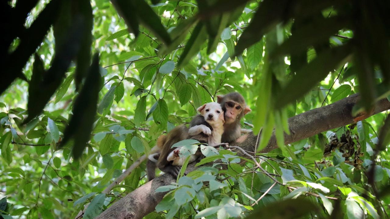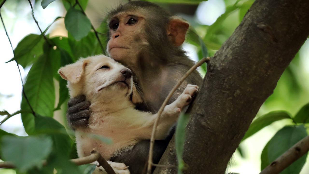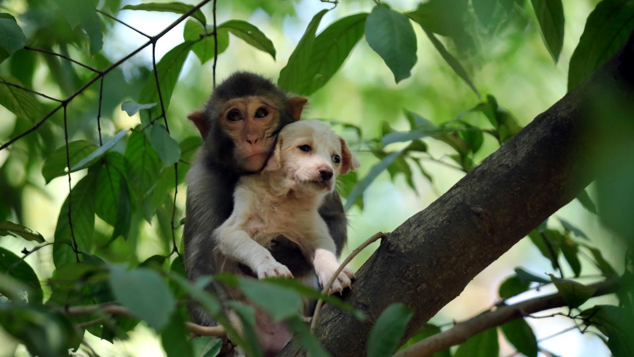 Bangladeş'in başkenti Dakka'da, bir maymun ile yavru köpeğin dostluğu görüntülendi. Maymun, yavru köpeği yanından hiç ayırmıyor. Kucağında taşıyıp, ağaçtan ağaca atlayarak bir parkta yaşamını sürdürüyor.