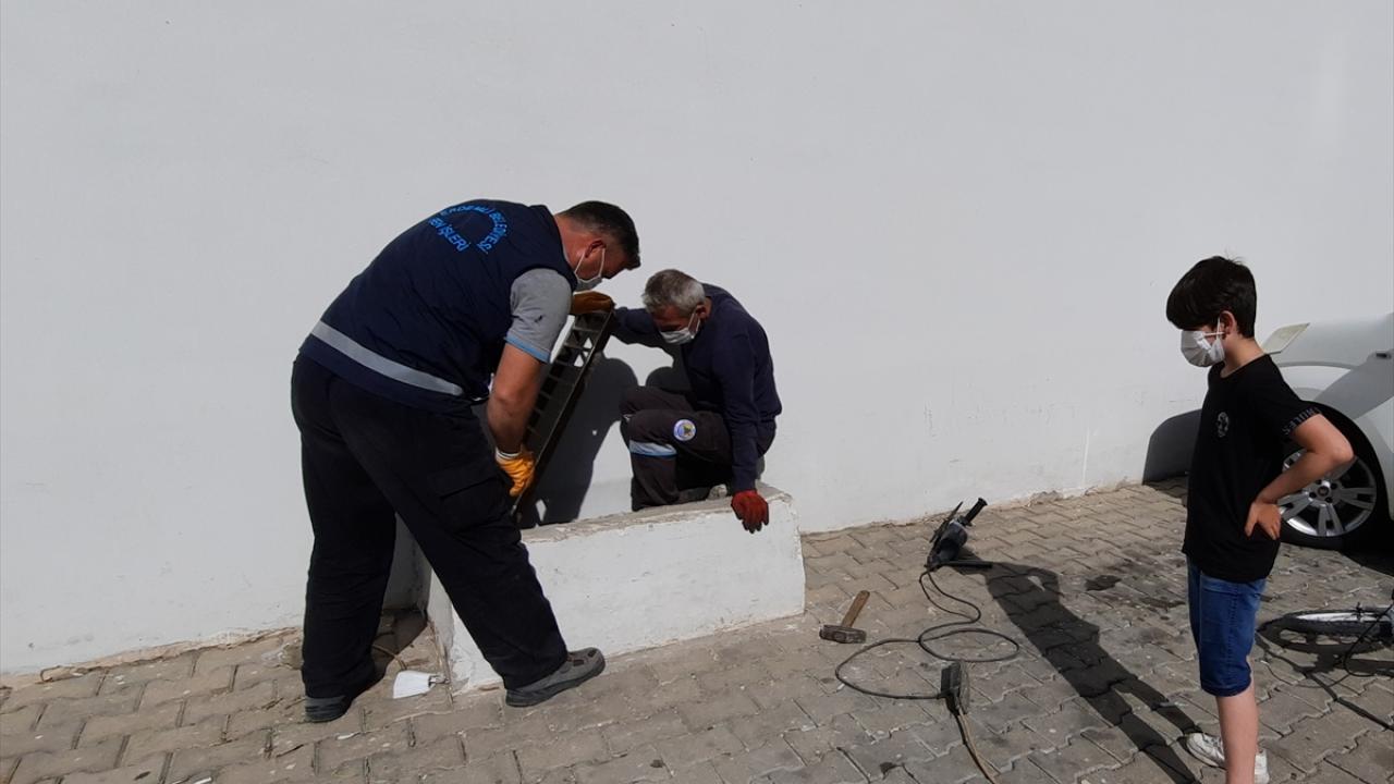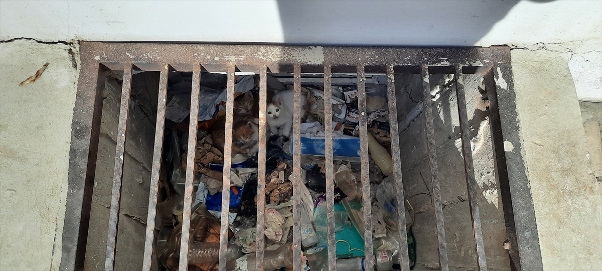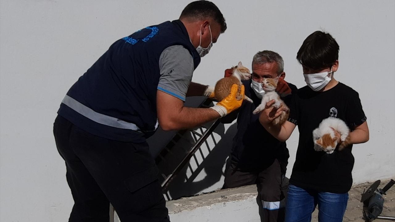 Veterinerin de başvurmasıyla olay yerine sevk edilen Erdemli Belediyesi Fen İşleri Müdürlüğü ekipleri, mazgal demirini keserek kedi yavrularını kurtardı.