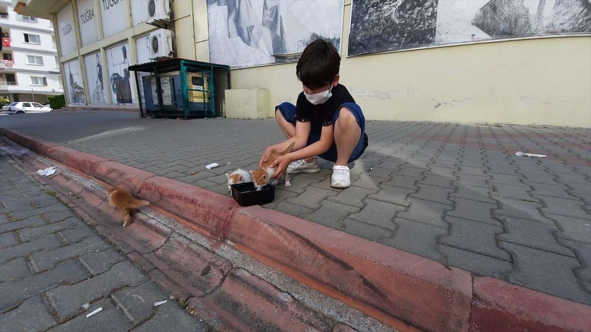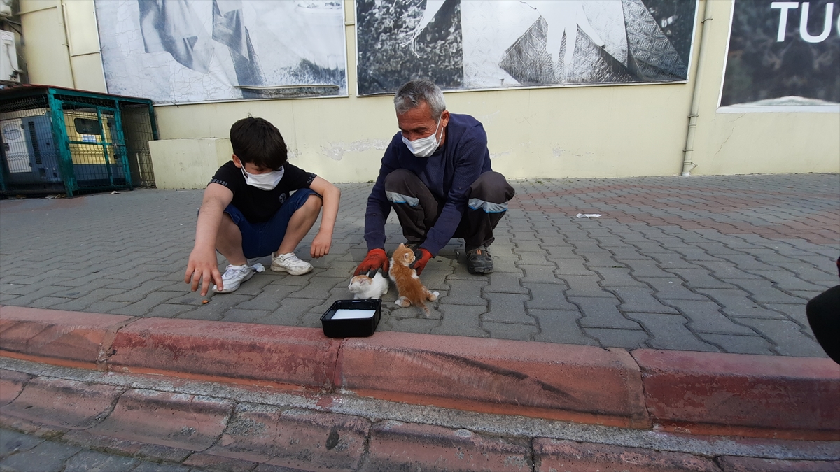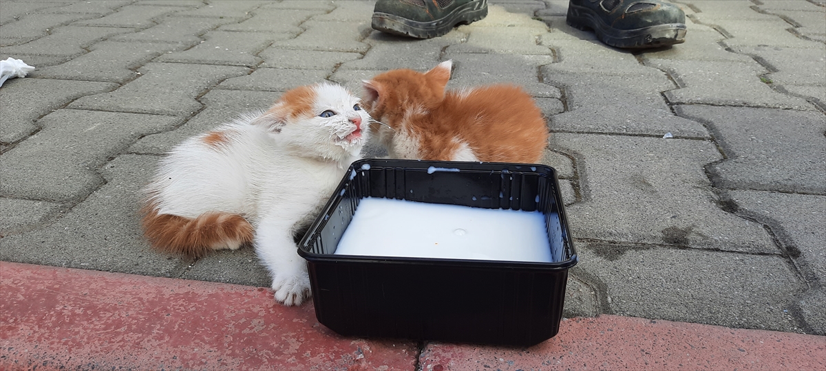 Hayvanlara ekiplerin süt verdiği sırada gelen kedilerin annesi de yavrularını yuvasına taşıdı.
