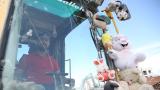 Kaldırdığı enkazlardan çıkardığı oyuncakları kepçesine asıp çalışıyor