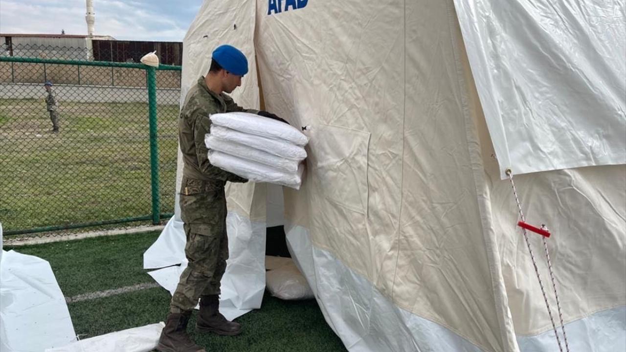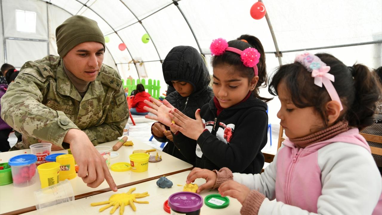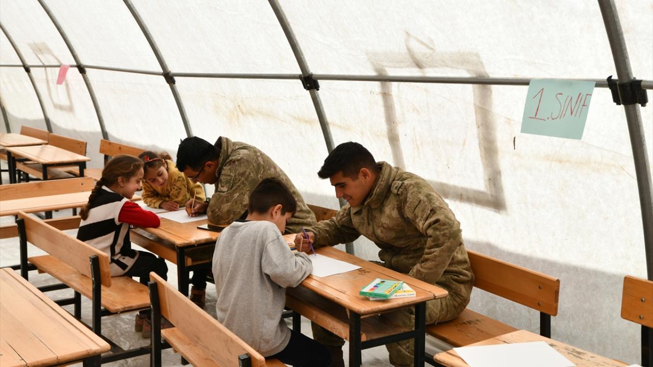 Kahramanmaraş merkezli depremlerden etkilenen Gaziantep`in İslahiye ilçesinde Mehmetçiğin kurduğu çadırlarda çocuklar, resim, boyama ve zeka oyunları gibi çeşitli etkinliklere katılıyor. Kıbrıs Türk Barış Kuvvetleri Komutanlığı 14. Zırhlı Tugay Komutanlığınca İslahiye ilçe merkezinde okul olarak kullanılmak üzere 3 büyük çadır kurdu. (Arşiv)