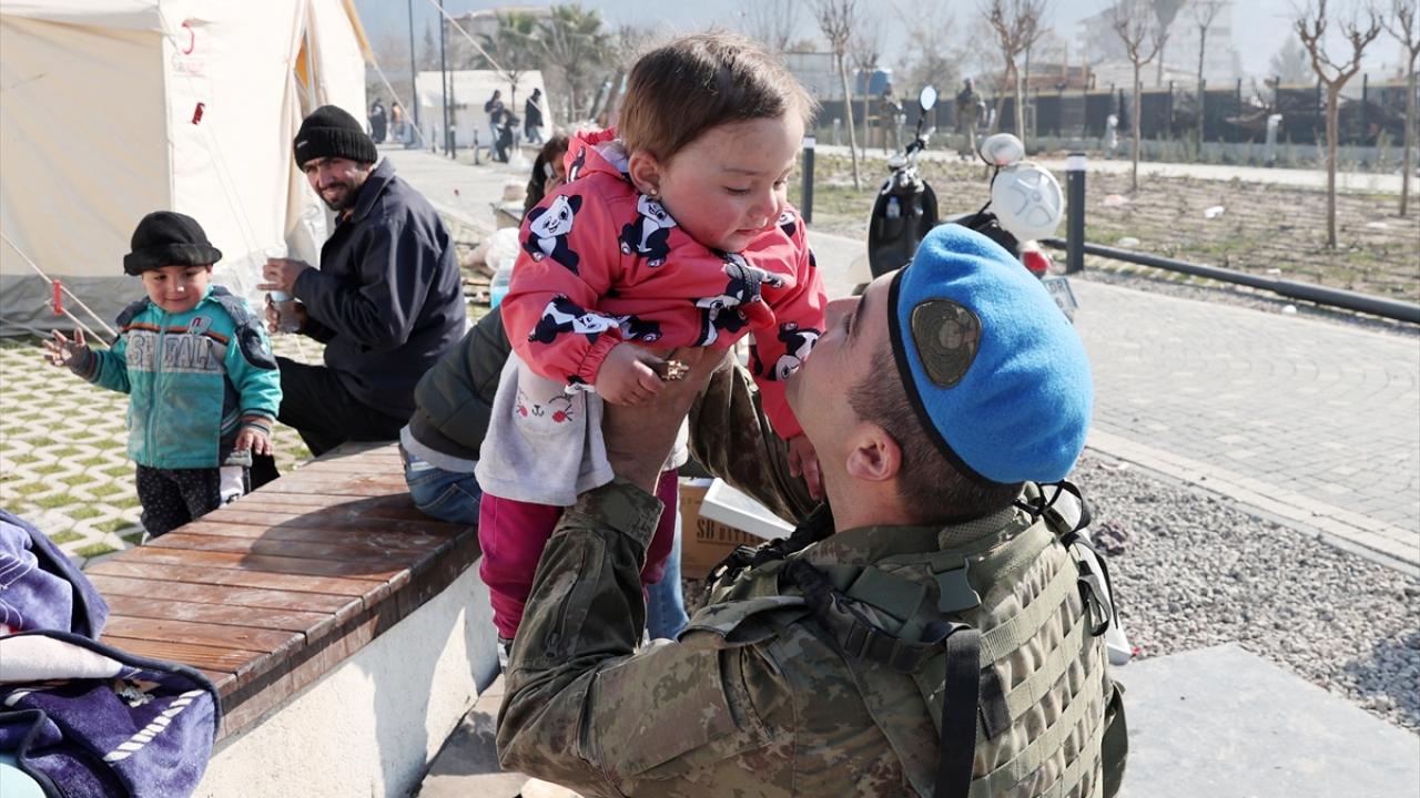 Hatay`ın Antakya ilçesindeki Antakya Millet Bahçesi`nde kurulan çadırların güvenliği sağlayan askerler, depremzede çocuklarla ilgilendi. (Arşiv)