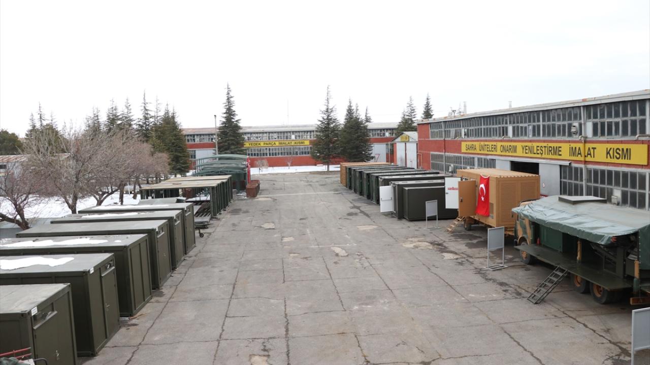 Niğde`nin Bor ilçesinde, Milli Savunma Bakanlığı Askeri Fabrikalar Genel Müdürlüğü bünyesindeki 7`nci Ana Bakım Fabrika Müdürlüğünde üretilen mobil sahra üniteleri sayesinde Kahramanmaraş merkezli depremlerden etkilenen illerde yaralar sarılıyor. Fabrikada, mobil mutfak, fırın, çamaşır, banyo, soğuk hava, yaşam, tuvalet ve banyo konteynerlerini içeren seyyar sahra üniteleri ile soğuk iklim çadırı gibi nitelikli ürünler üretiliyor. (Arşiv)