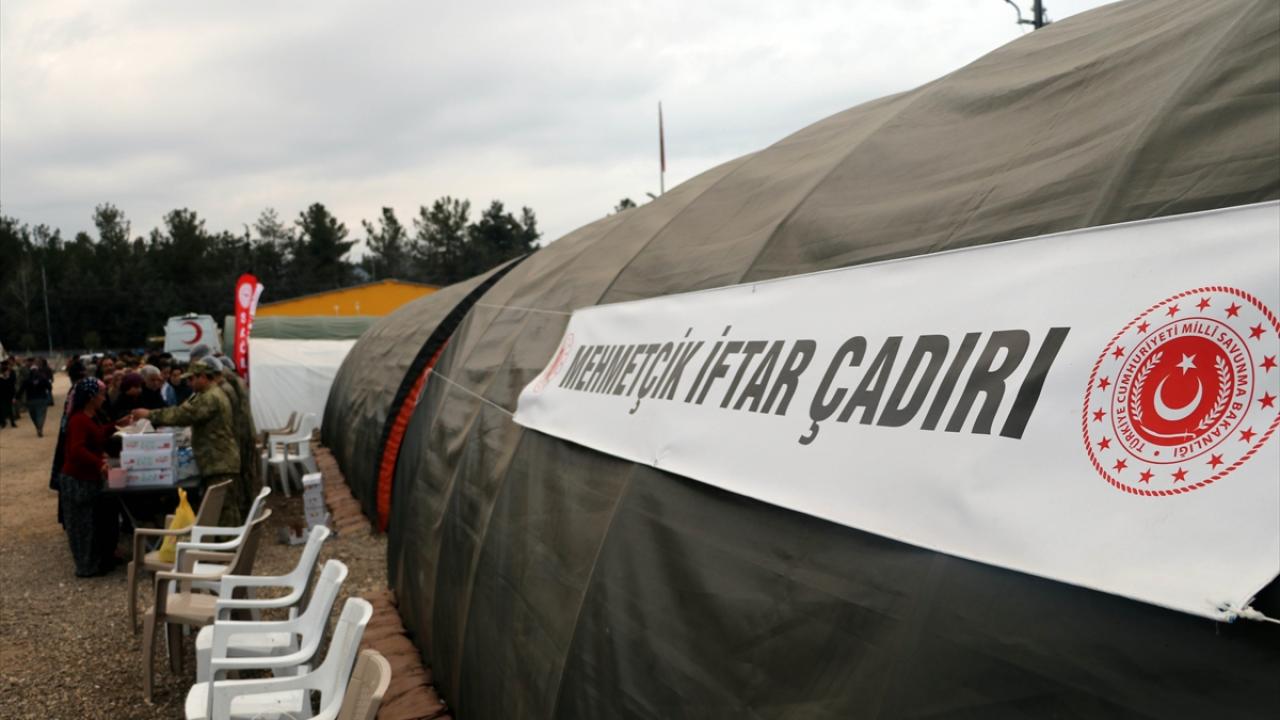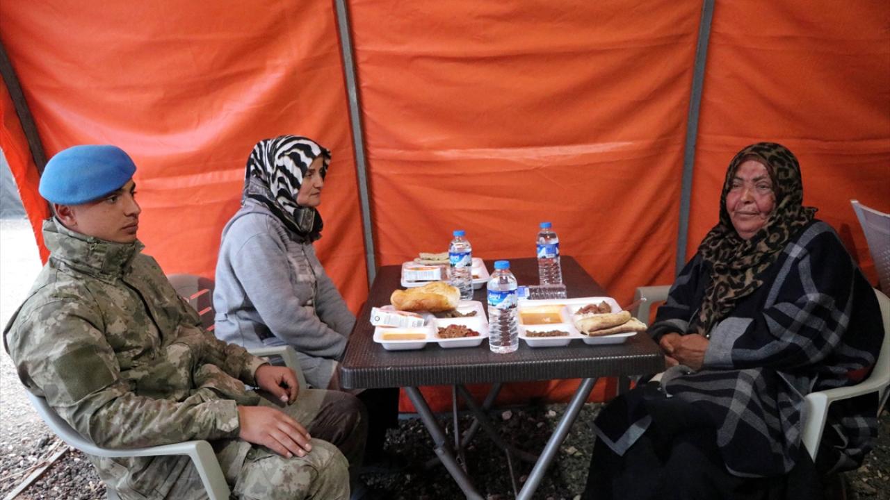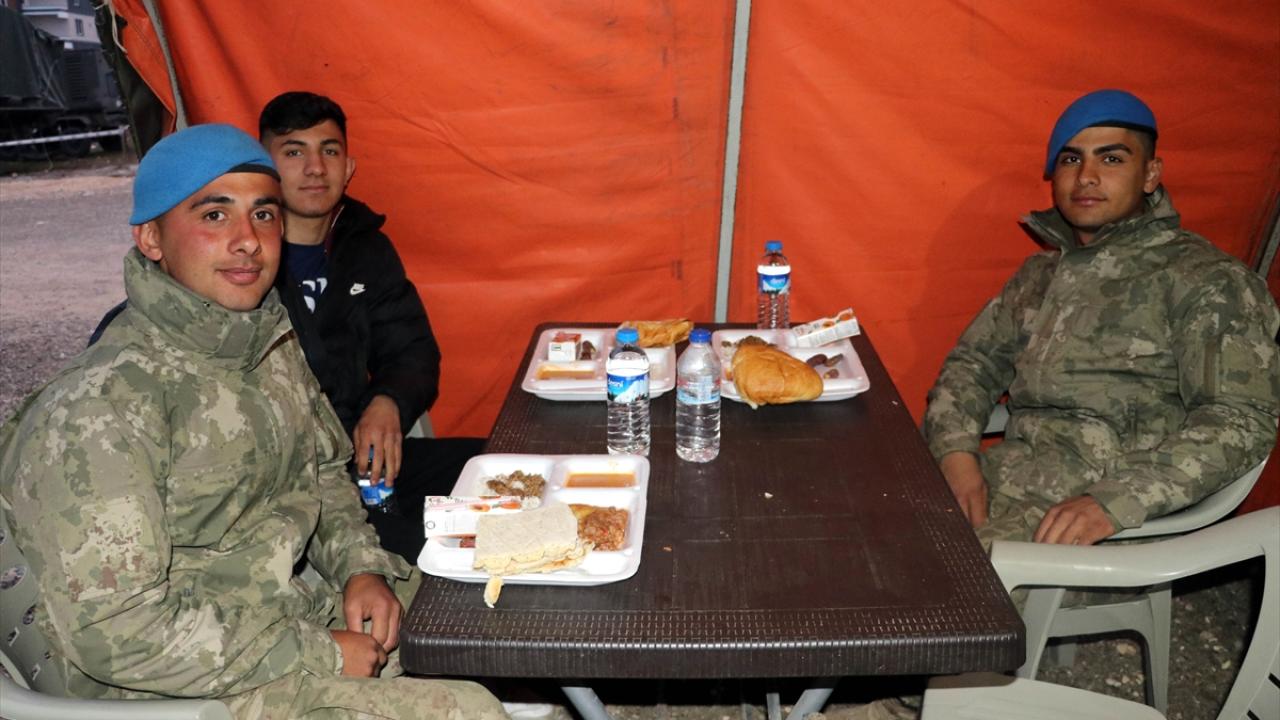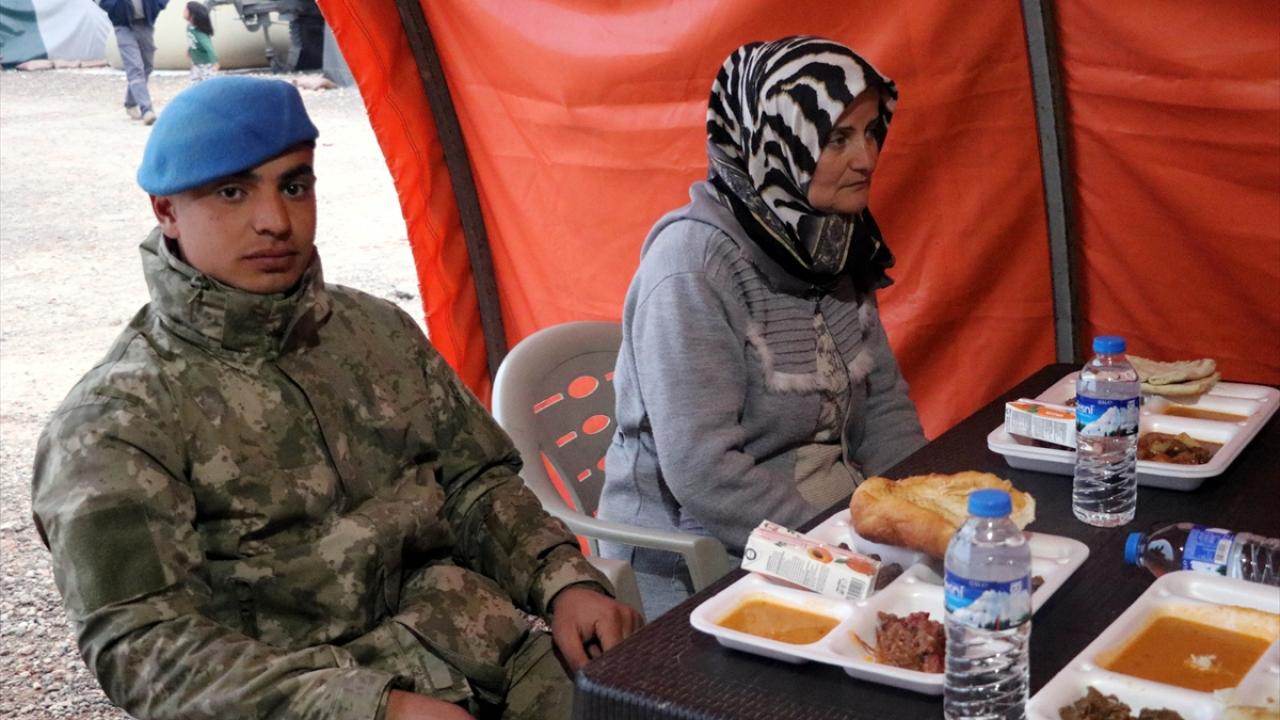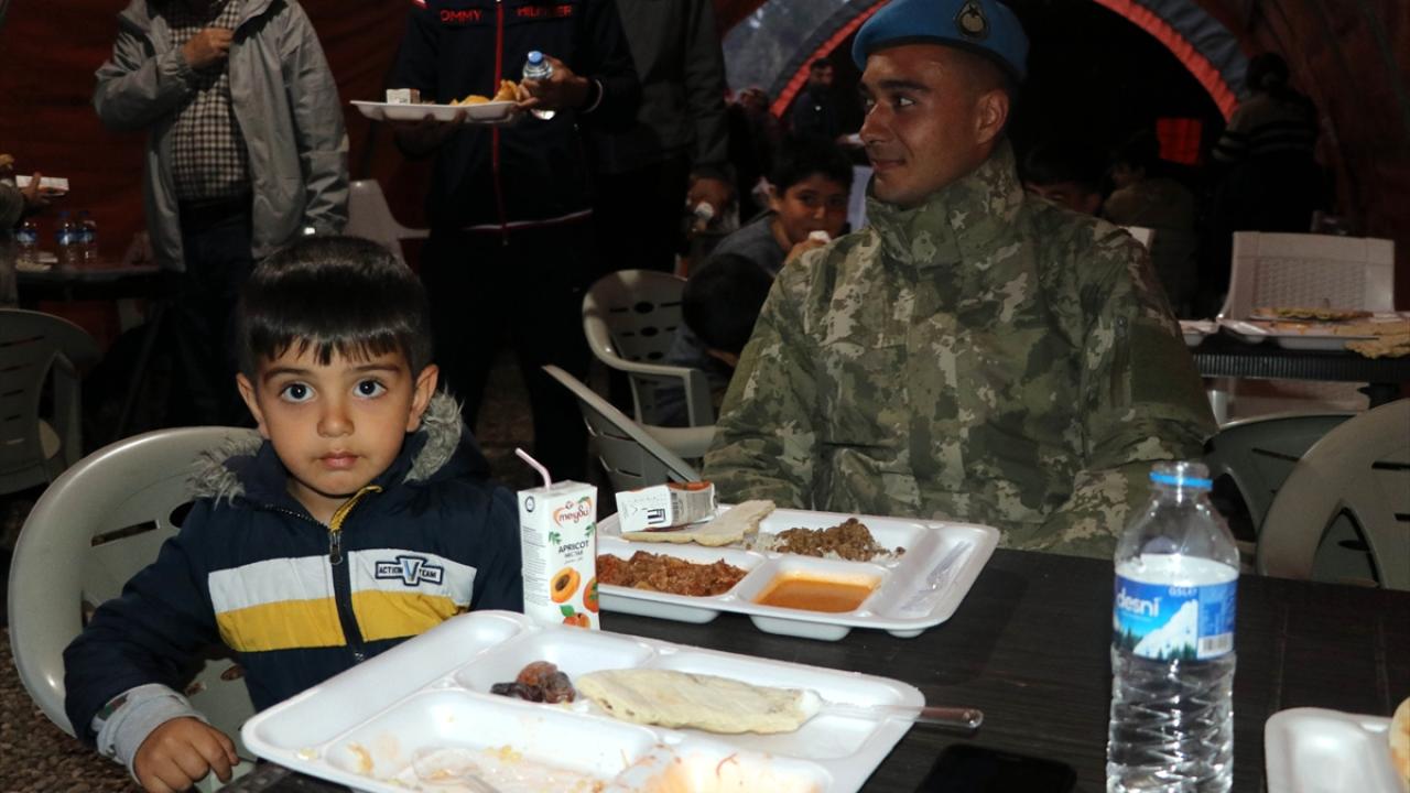 Çadır kentte depremzedeler, Mehmetçiklerle birlikte sahur ve iftar sofrasını paylaşıyor.