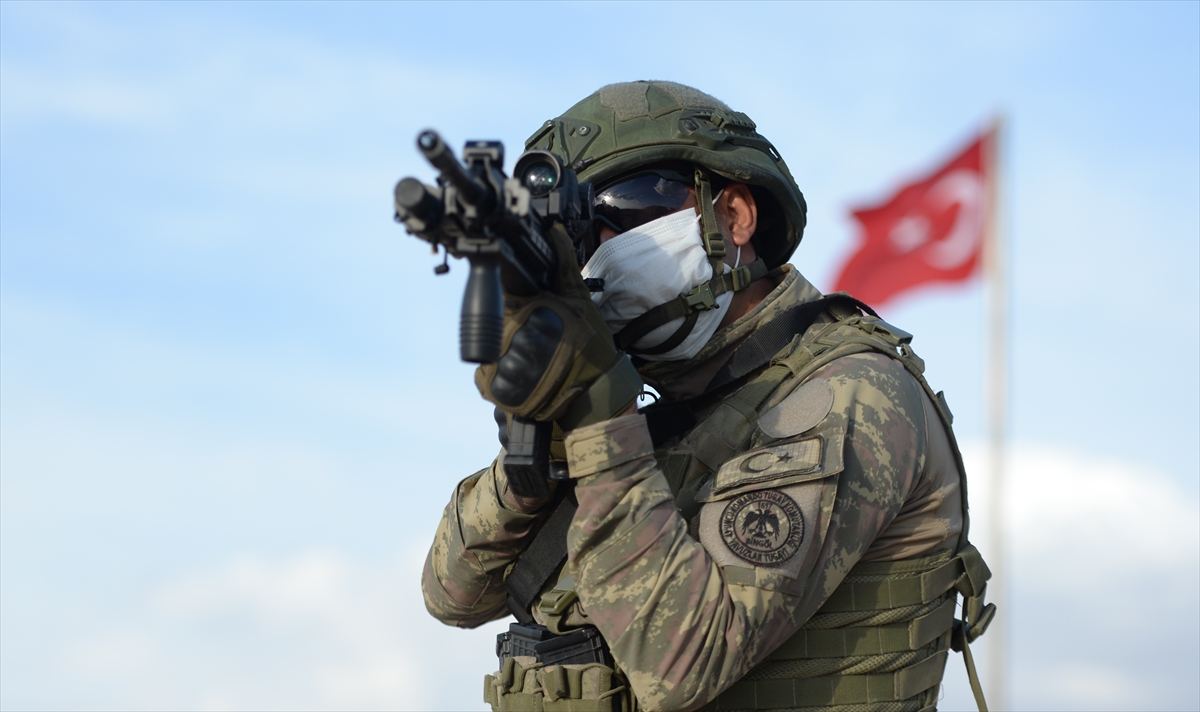 Noktada 49. Komando Tugay Komutanlığına bağlı 5. Komando Tabur Komutanlığı`nda görevli askerler, yeni tip koronavirüs (Kovid-19) tedbirleri kapsamında bölgenin huzurunu sağlamak için 24 saat esaslı görev yapıyor.