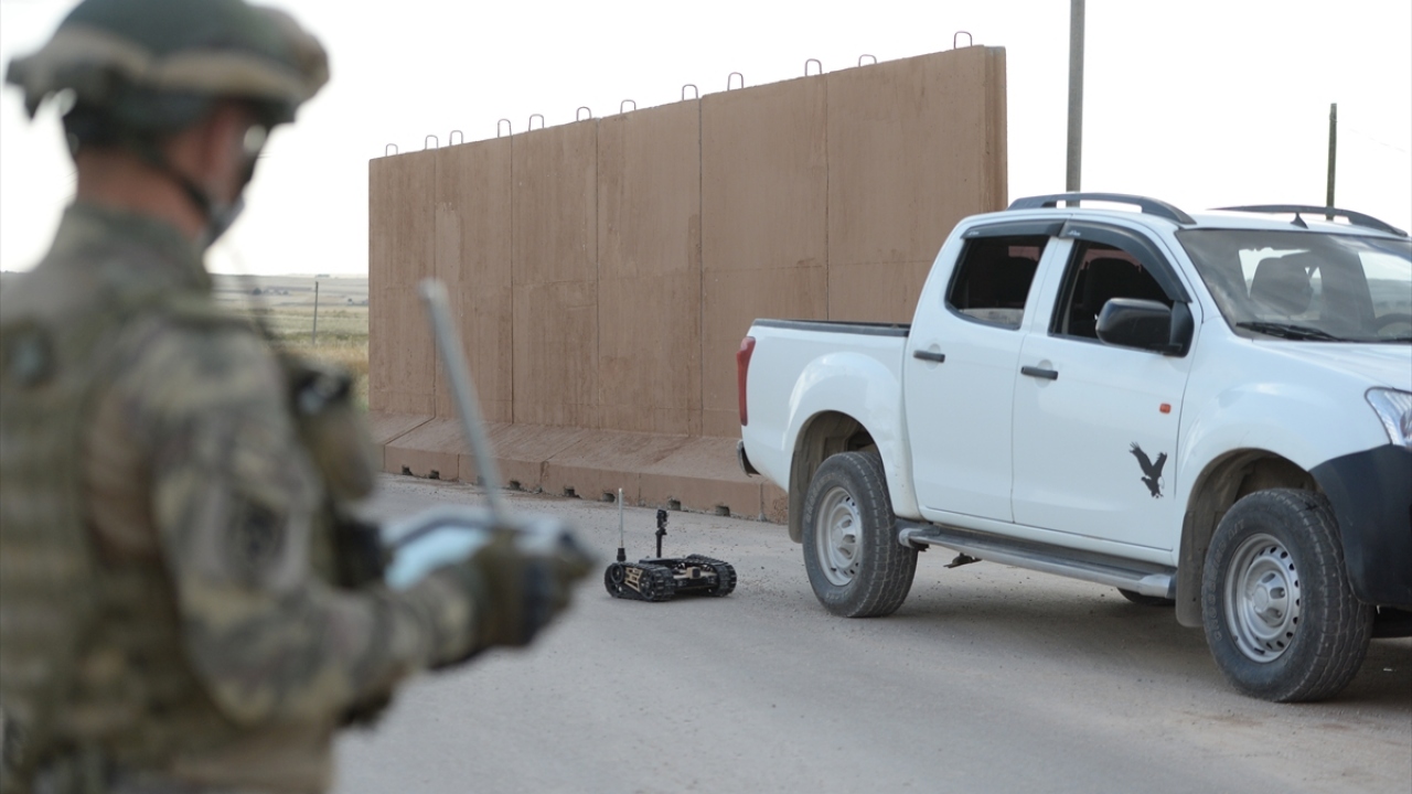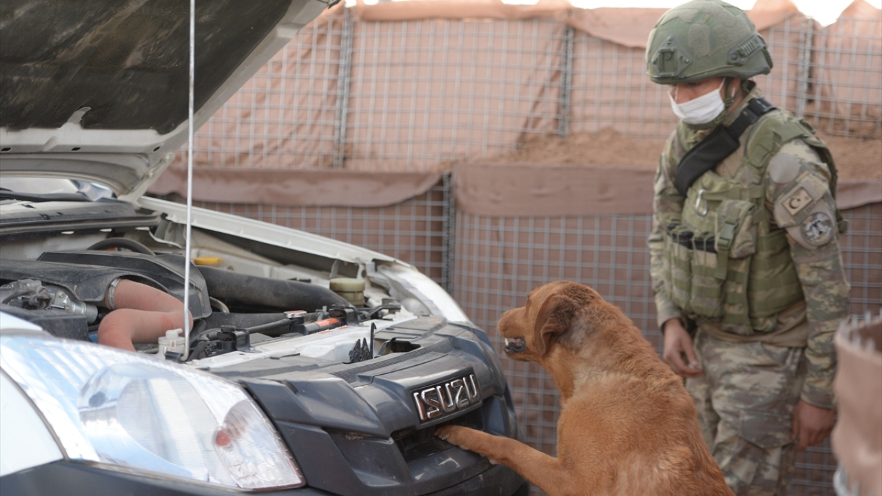 Araçların altı, Zafer Bomba Tespit ve İmha Robotu ile arandıktan sonra, içi de hassas burunlu dedektör bomba arama köpeklerince kontrol ediliyor.
