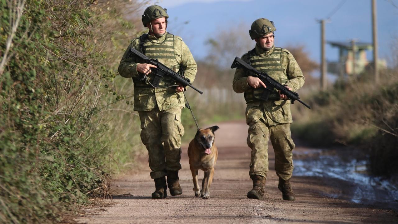 Birlikteki biri Anadolu çoban, diğeri maniconis cinsi köpekler, birliğin dış kuşak emniyetinde sürdürülen devriye görevlerinde askere büyük destek veriyor.