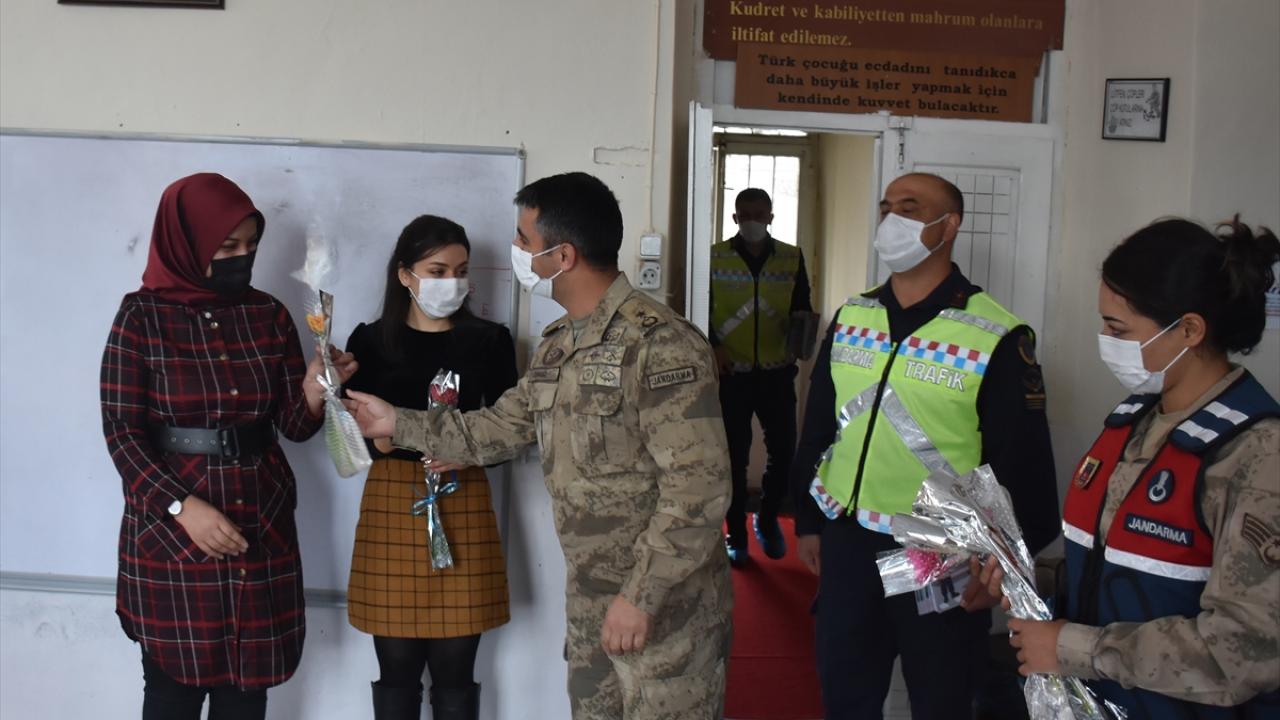Askerler öğretmenlere çiçek vererek, 24 Kasım Öğretmenler Günü`nü kutladı.