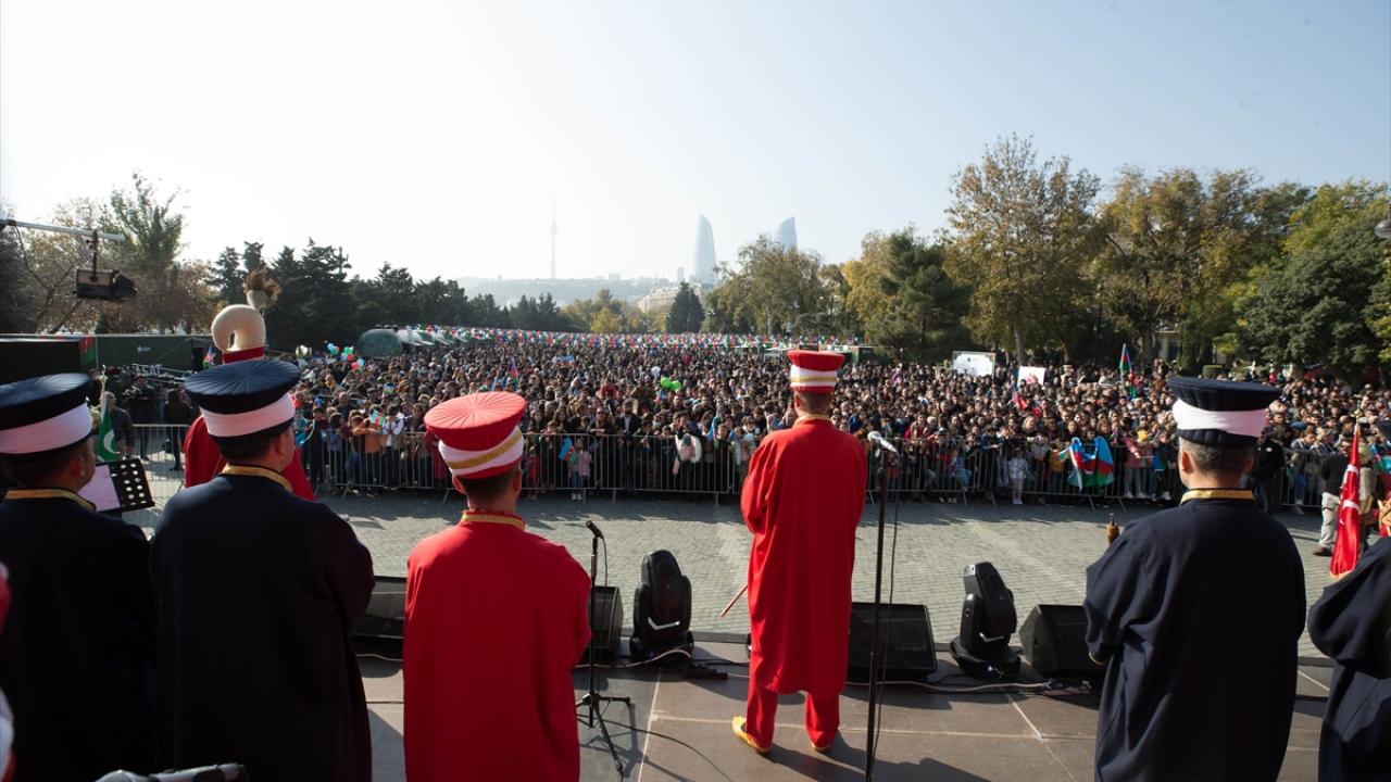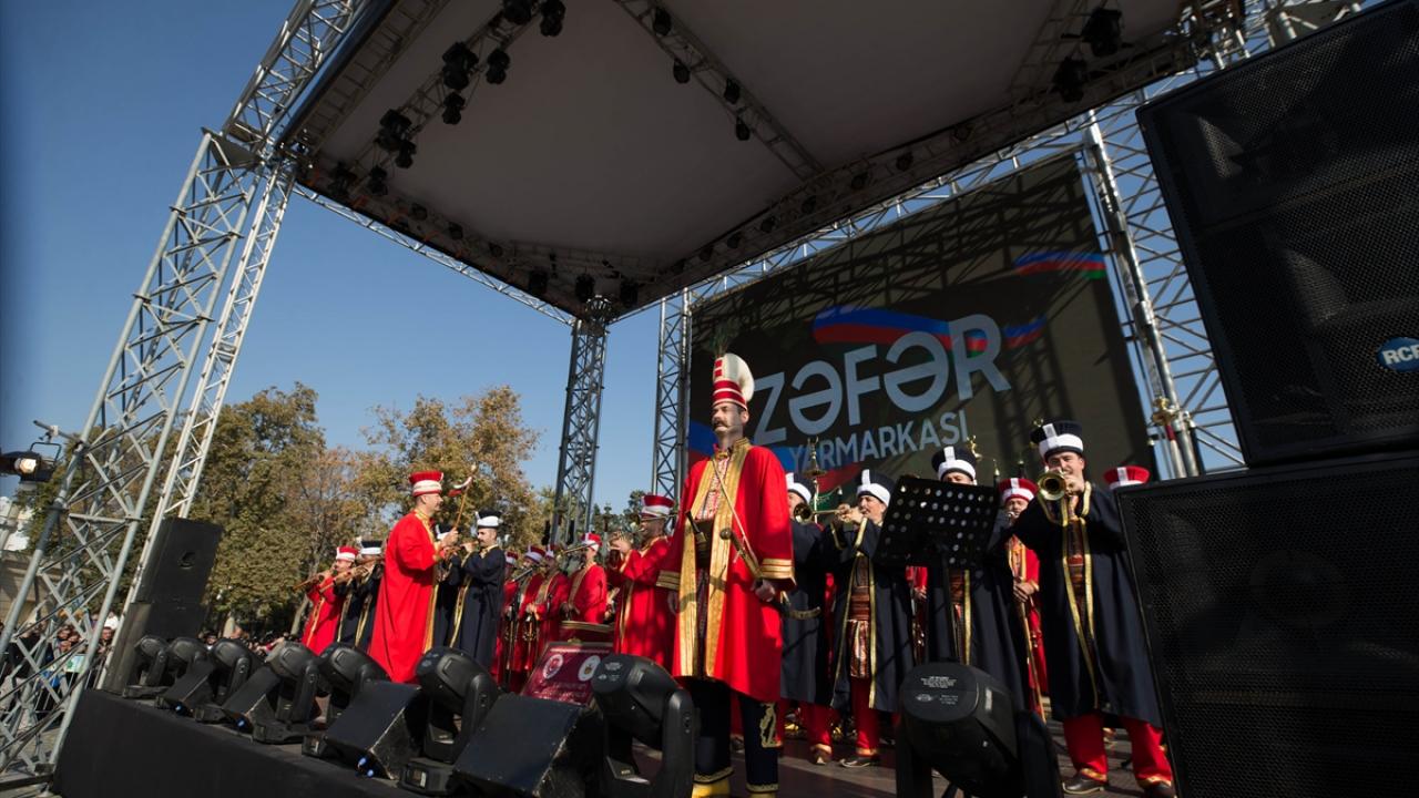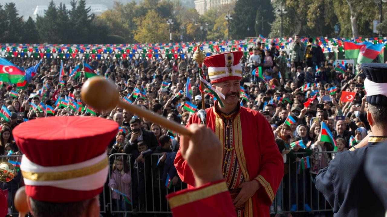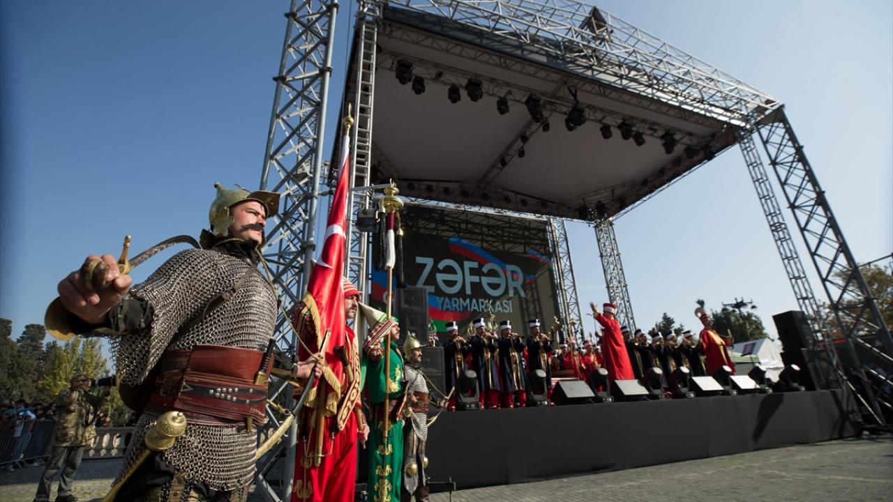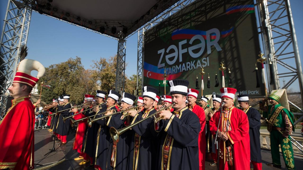 Panayır alanında bulunan binlerce kişi, ellerinde Azerbaycan ve Türk bayraklarıyla Mehteran Birliğinin seslendirdiği marşlara eşlik etti.