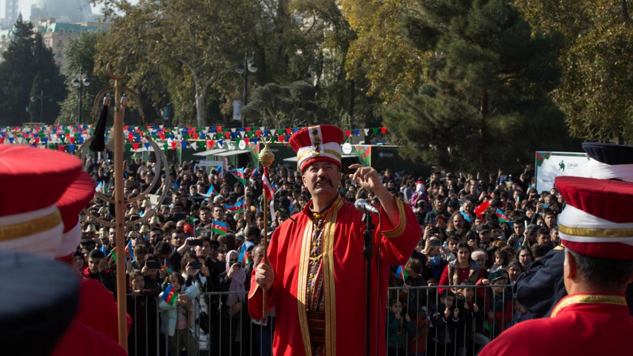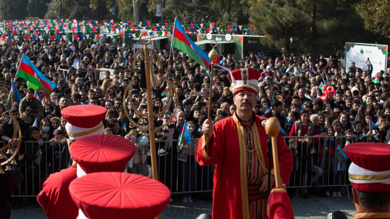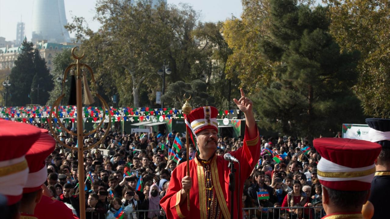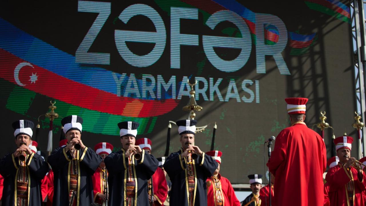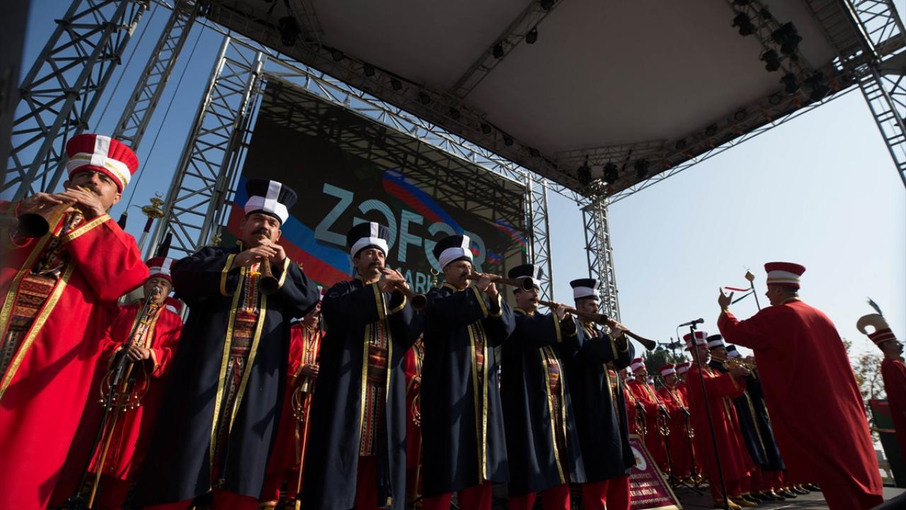 Panayır alanında bulunan binlerce kişi, ellerinde Azerbaycan ve Türk bayraklarıyla Mehteran Birliğinin seslendirdiği marşlara eşlik etti.