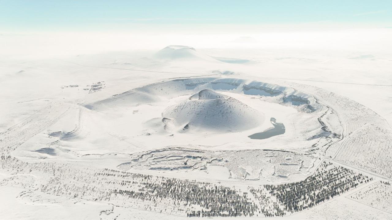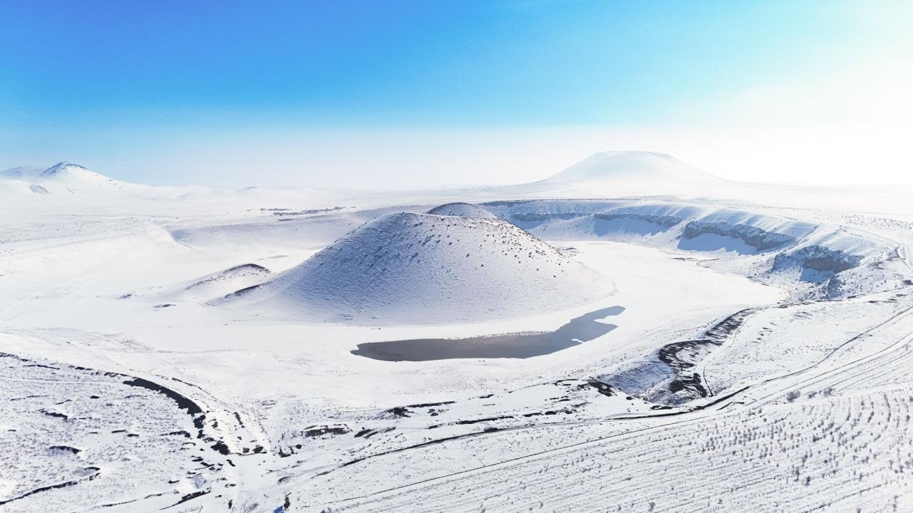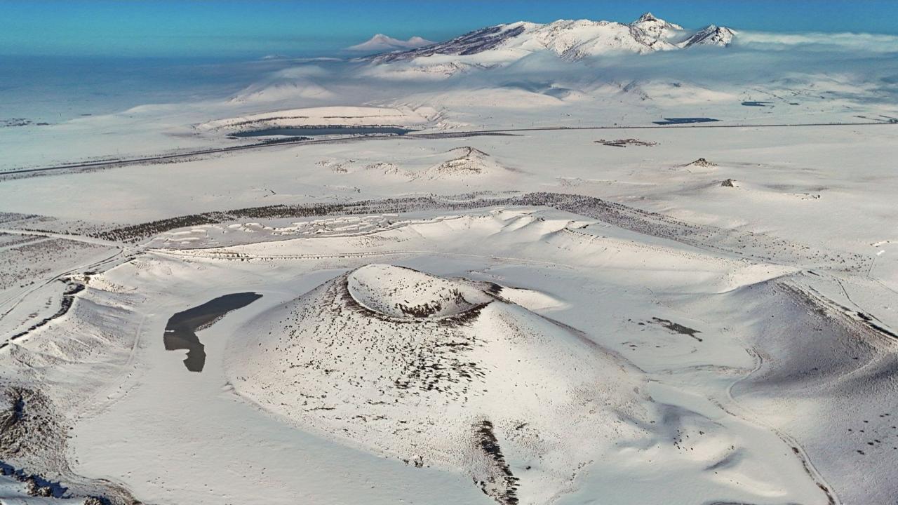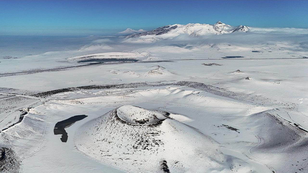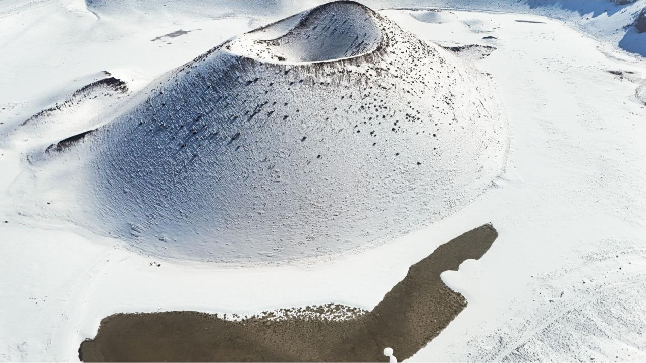 Konya'nın Karapınar ilçesinde, jeolojik miras niteliğindeki Meke Gölü, kar yağışının ardından beyaz örtüyle kaplandı.