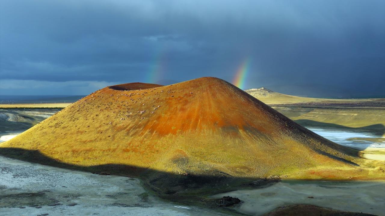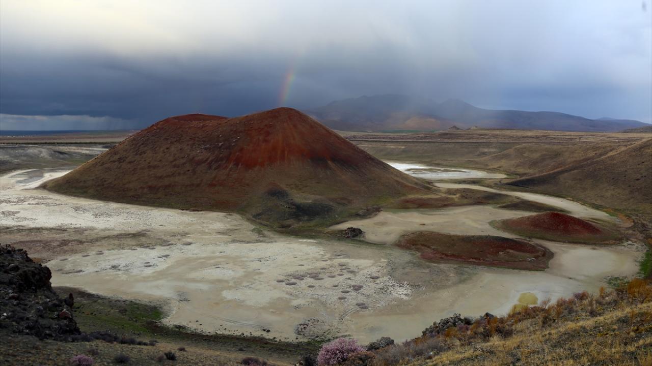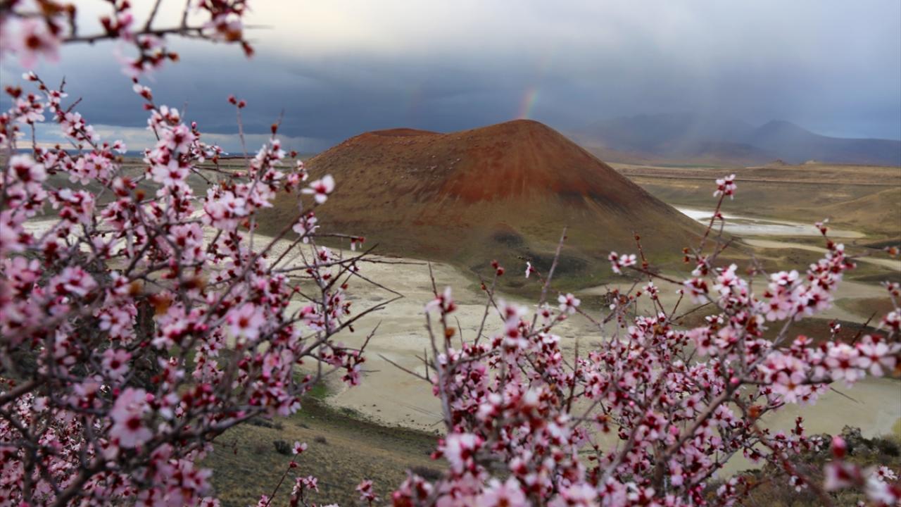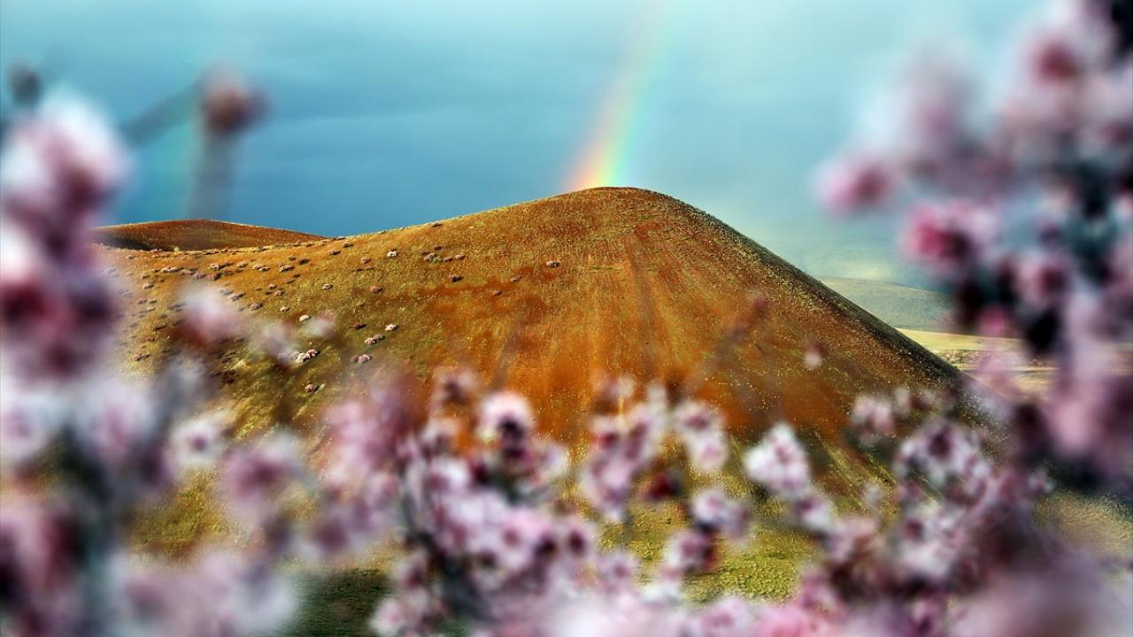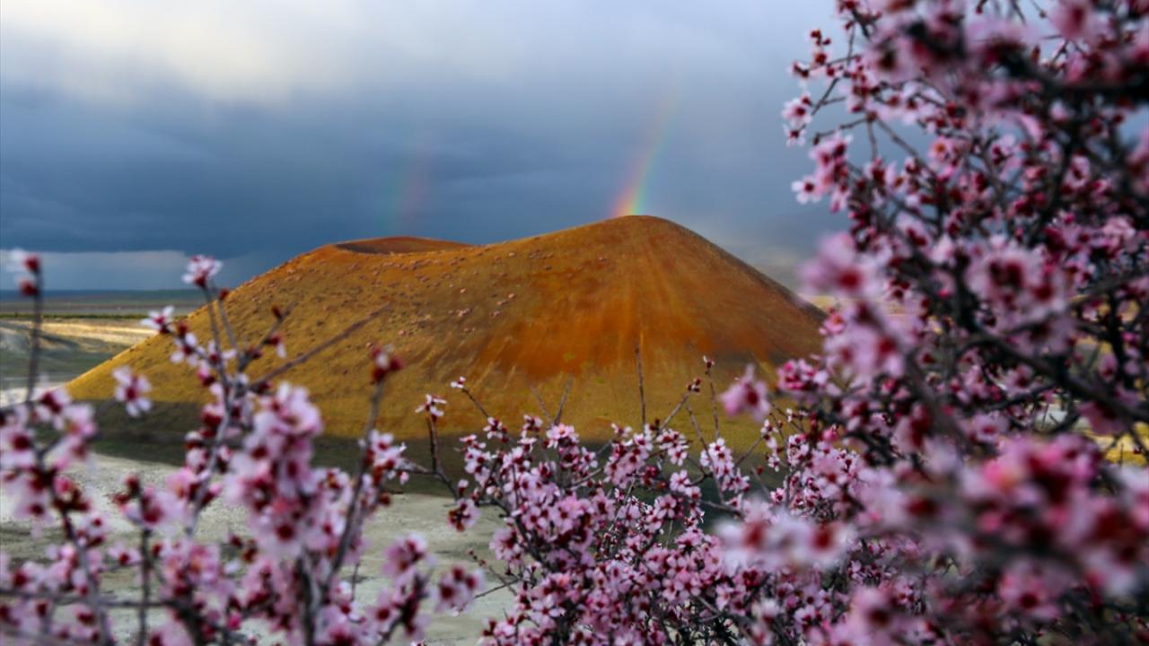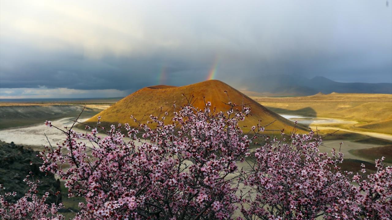 Konya’nın Karapınar ilçesinde bulunan ve ‘dünyanın nazar boncuğu’ olarak bilinen Meke Krater Gölü, baharın gelmesiyle birlikte çiçek açan ağaçlar ve gökkuşağı eşliğinde güzel görüntüler oluşturdu.
