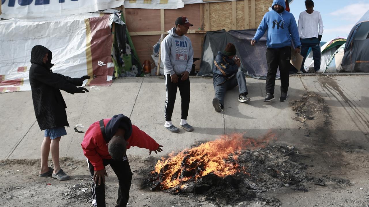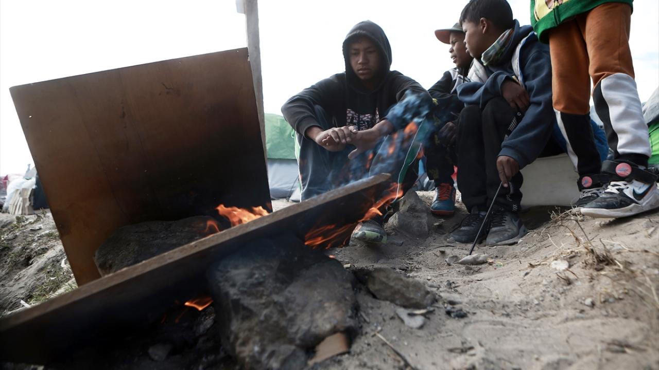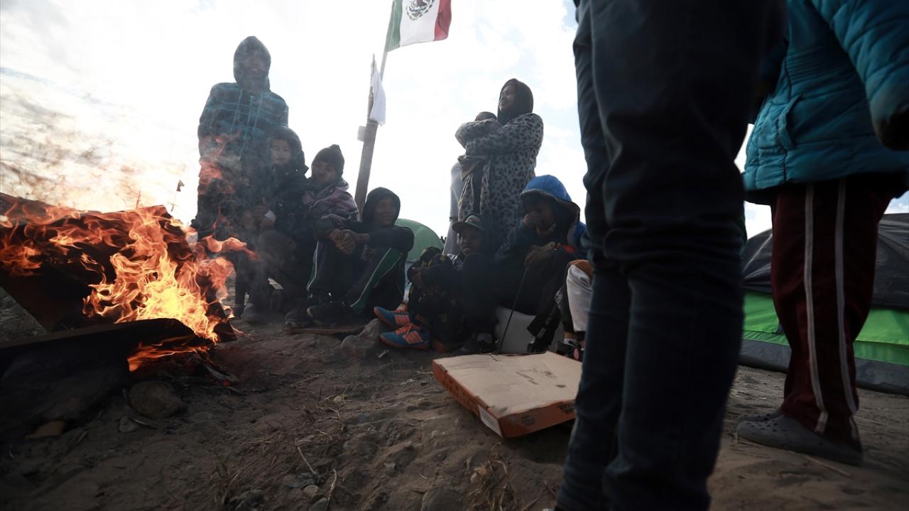 ABD sınırını geçmeyi bekleyen Venezuelalı göçmenler, Meksika'nın Ciudad Juarez kentindeki Rio Bravo nehri kıyısına kurdukları kamp alanında karton ve tahta parçalarını yakarak ısınmaya çalışıyor.