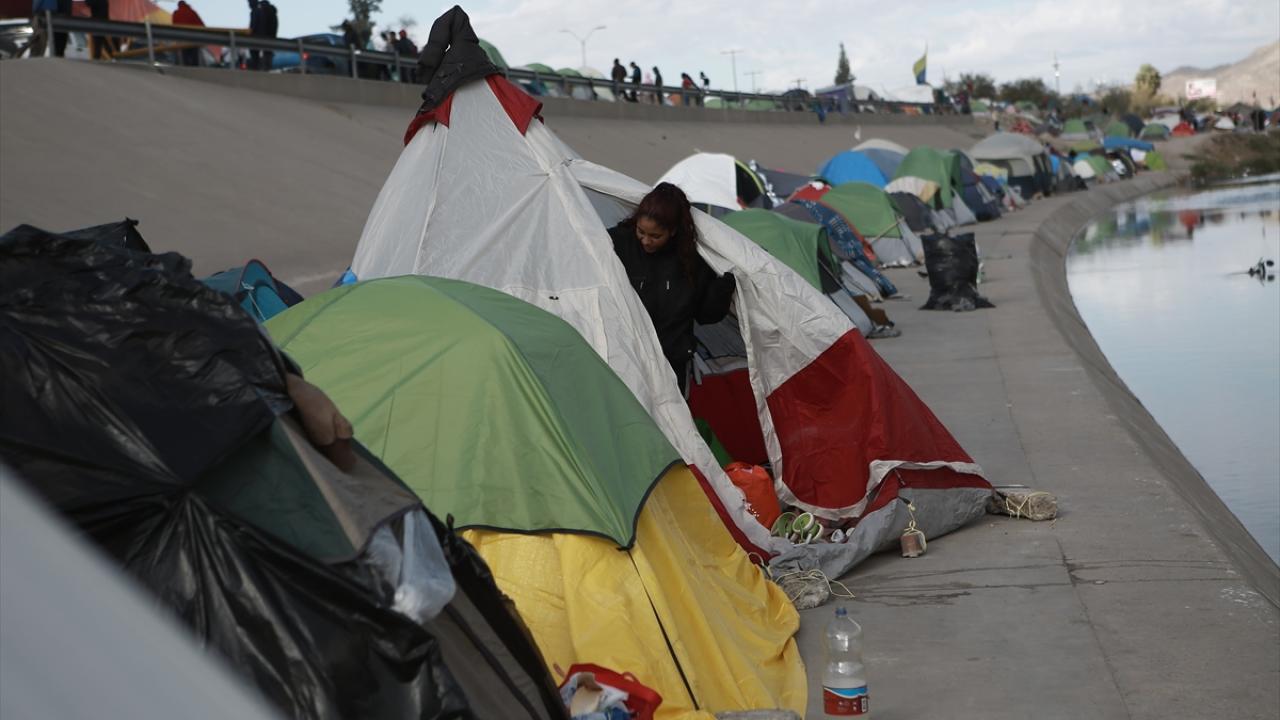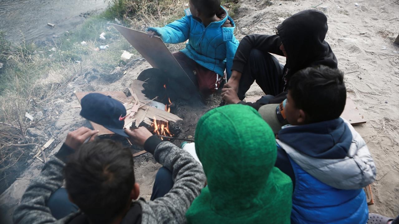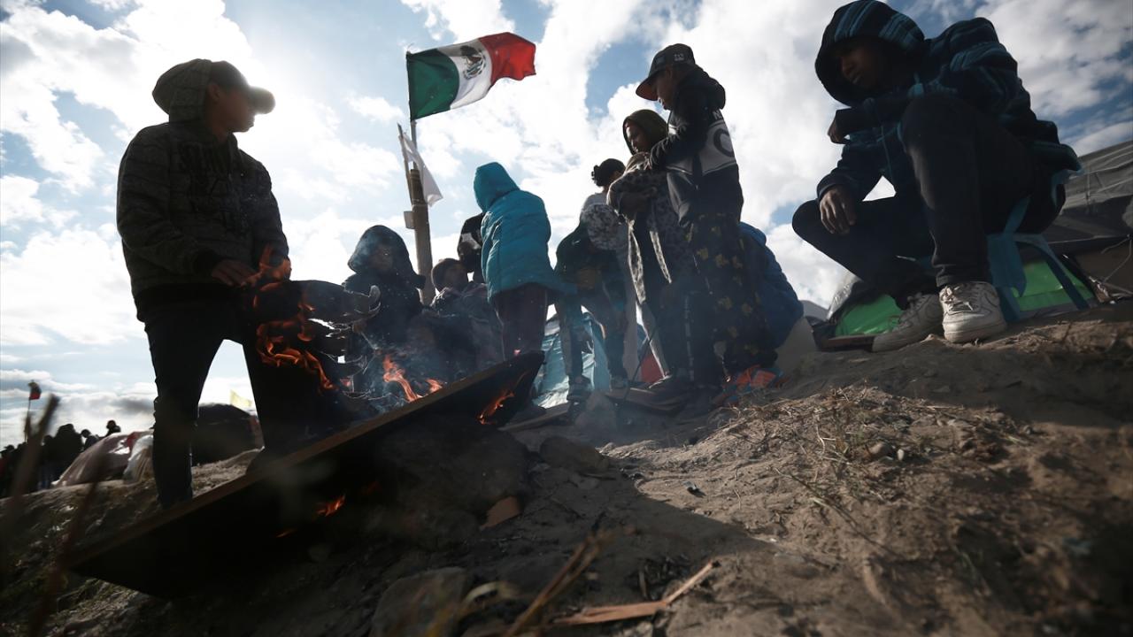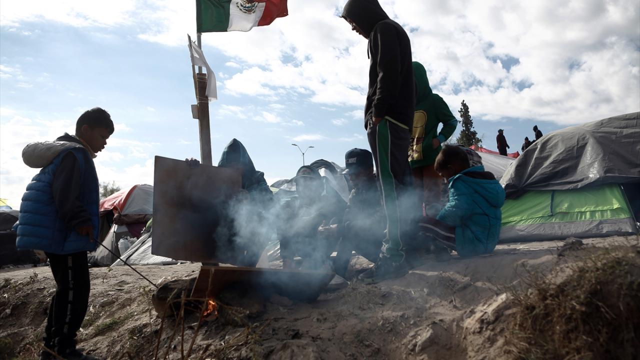 ABD sınırını geçmeyi bekleyen Venezuelalı göçmenler, Meksika'nın Ciudad Juarez kentindeki Rio Bravo nehri kıyısına kurdukları kamp alanında karton ve tahta parçalarını yakarak ısınmaya çalışıyor.