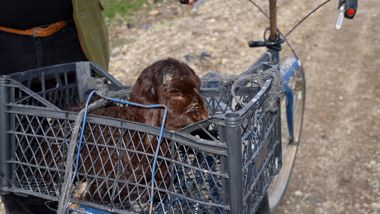 Karslı besici Ahmet Sarıtaş, Sarıkamış ilçesi kırsalındaki merada dünyaya gelen kuzuyu, daha iyi bakabilmek için bisikletinin arkasına bağladığı sepetle evine götürdü.