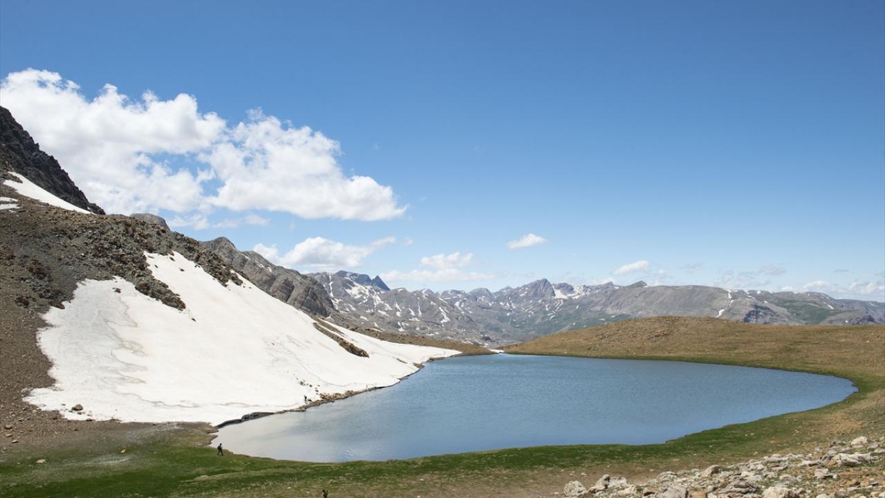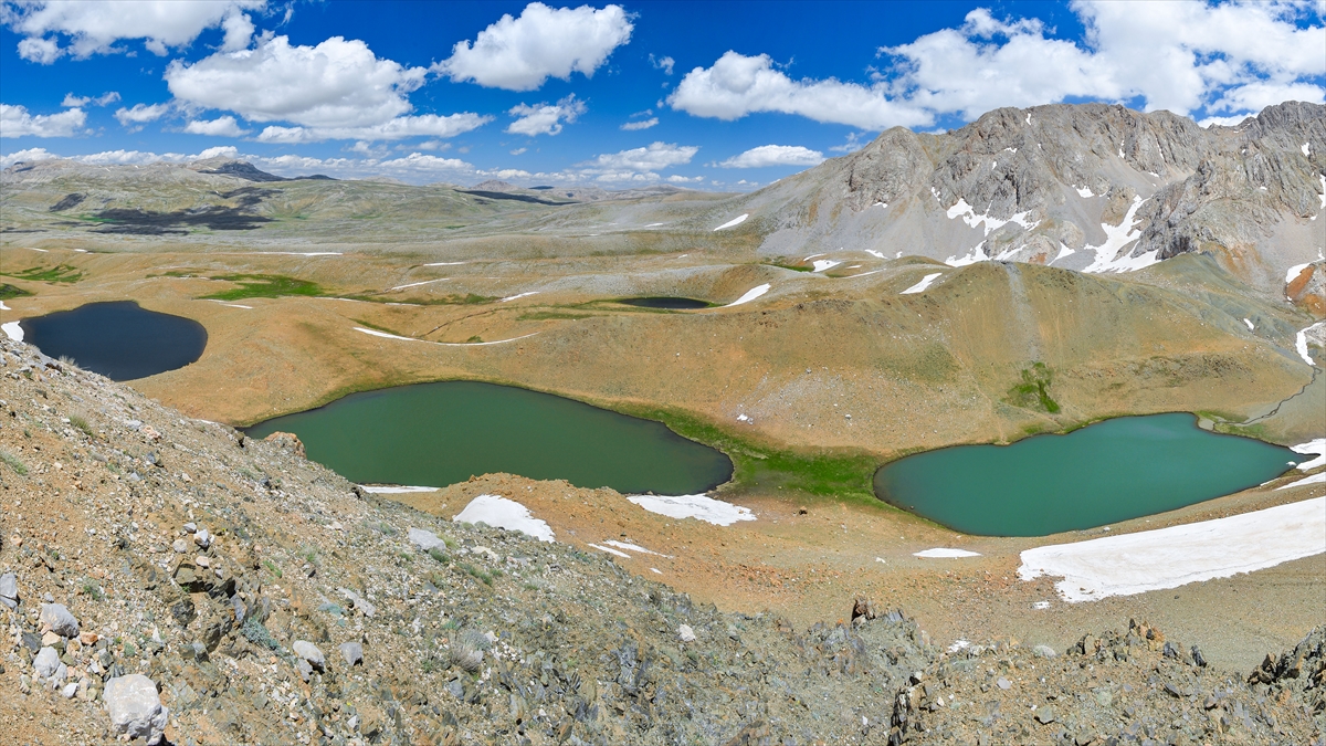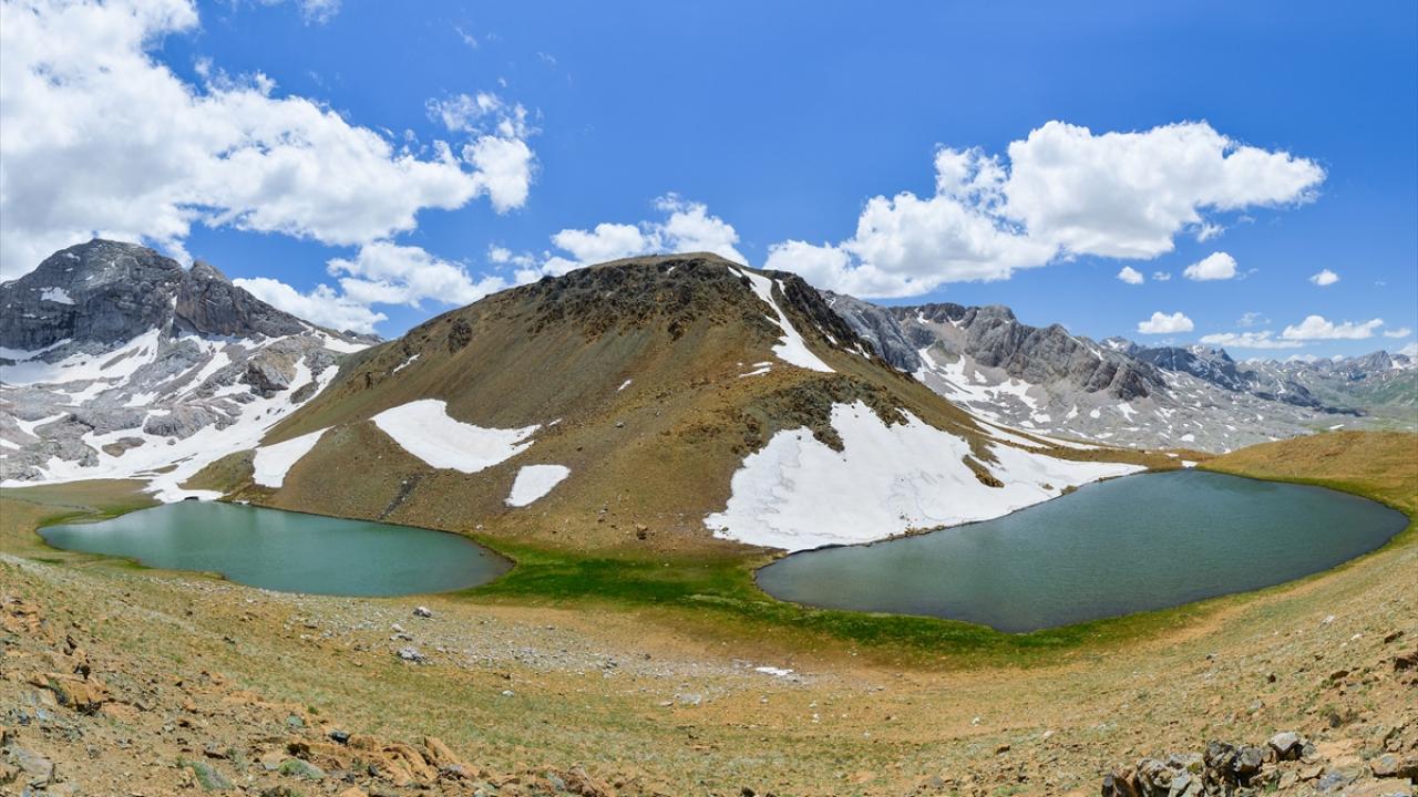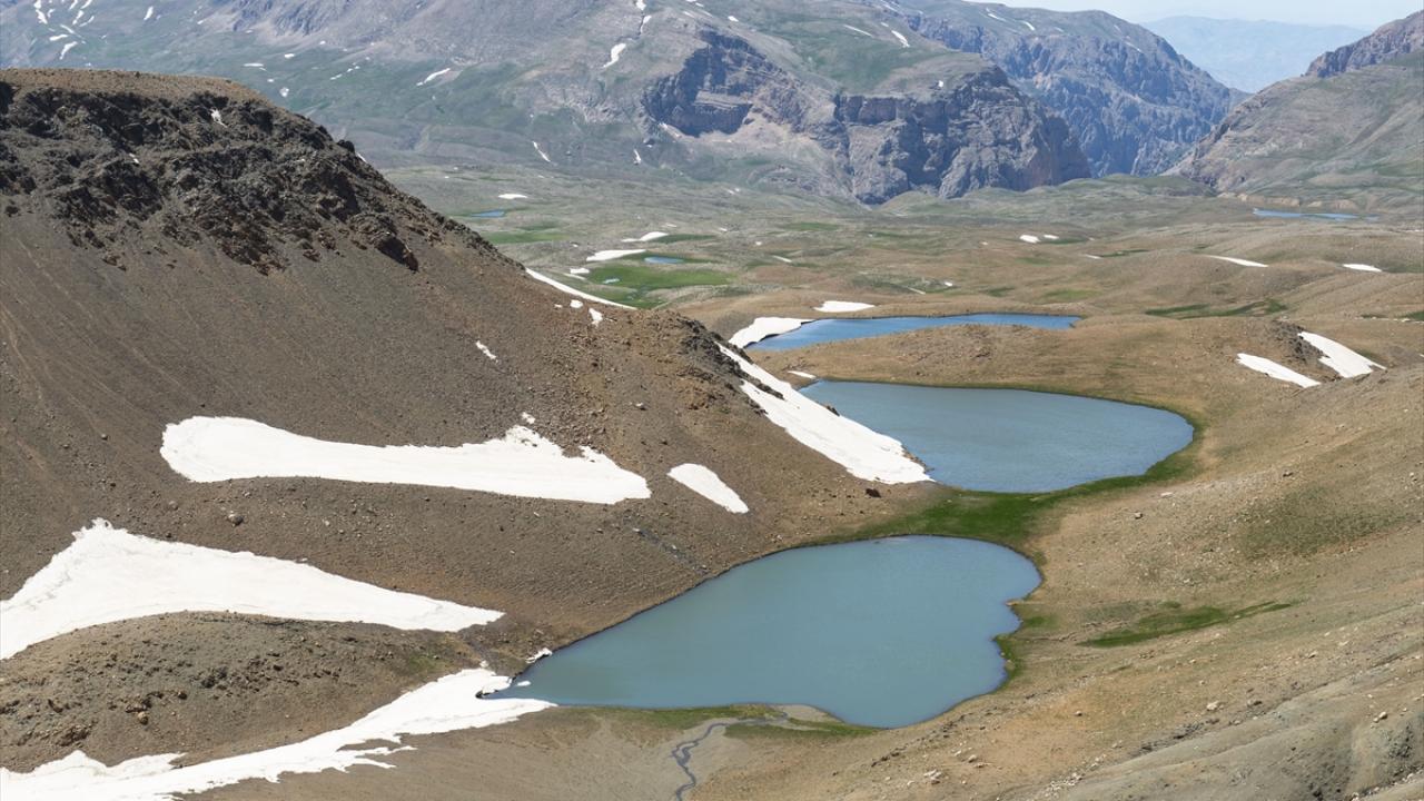 Dört mevsim zengin florası, endemik türleri, tarihi mekanları ve yaban hayatıyla ziyaretçilerini cezbeden ilçedeki, yaklaşık 3 bin rakımlı Mercan Dağları`nda yer alan Katır Gölleri de karların erimesiyle ayrı güzelliğe büründü.