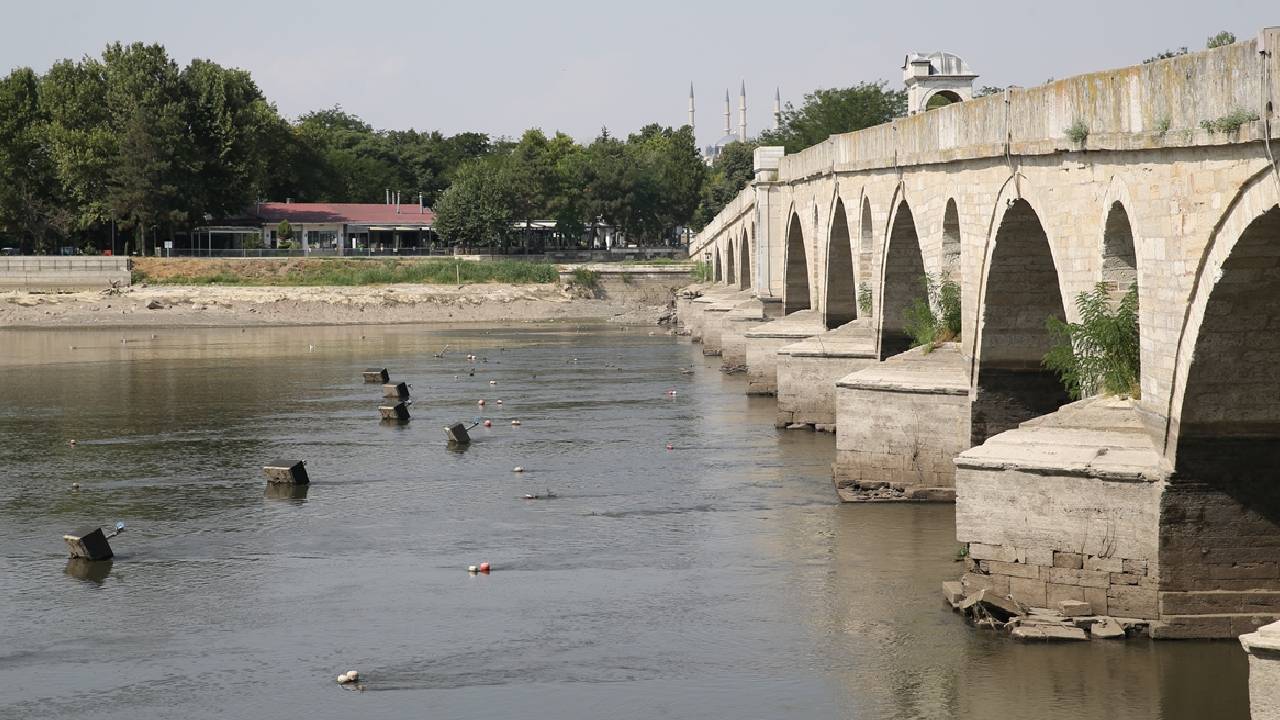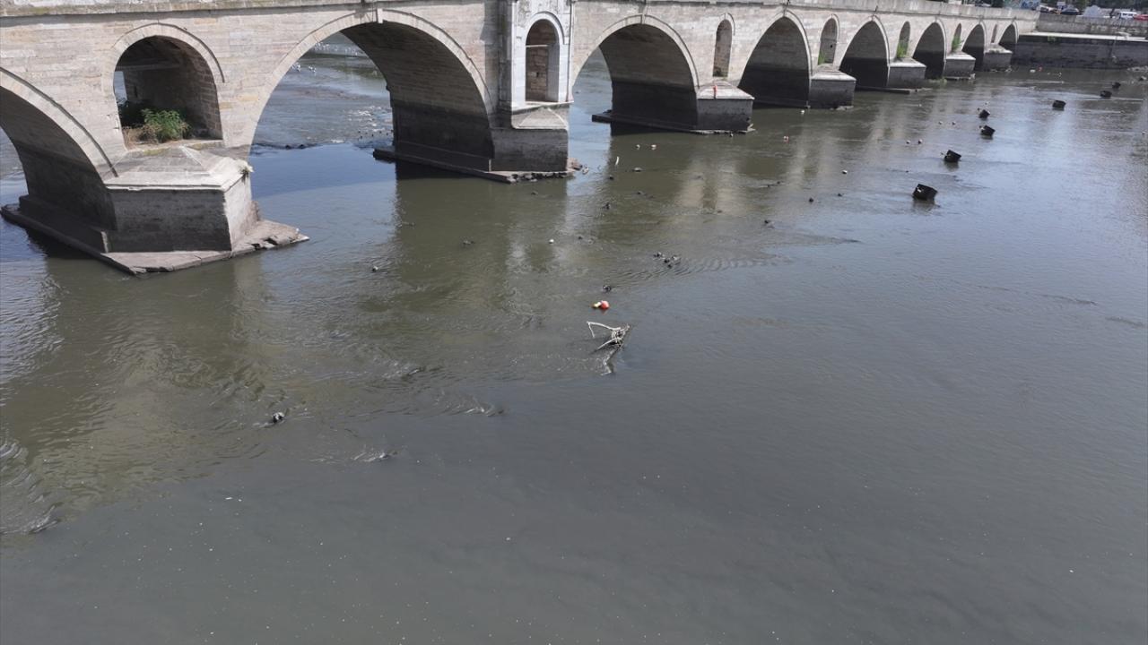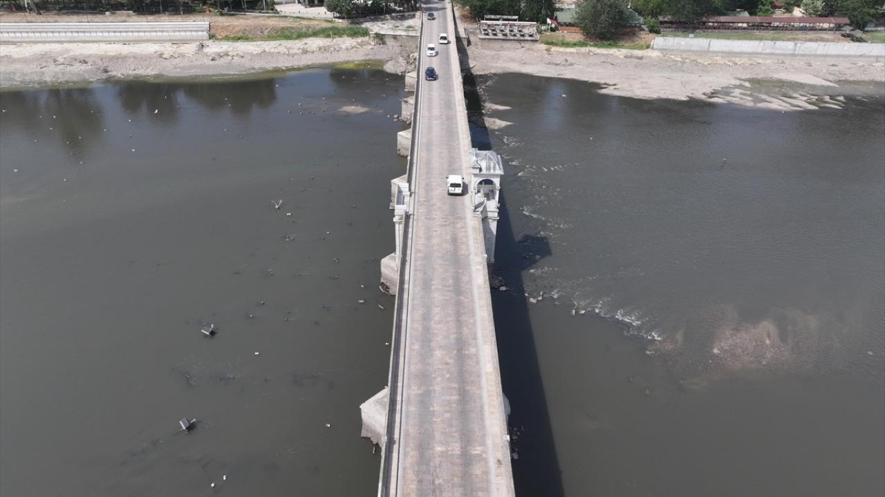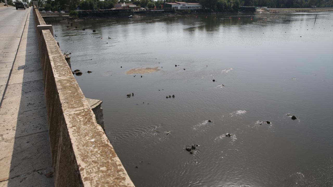 Edirne'de aşırı sıcaklara bağlı buharlaşma nedeniyle su seviyesi azalan Meriç Nehri'nde, asırlar öncesinden kalan ahşap köprünün ayakları görünür hale geldi.