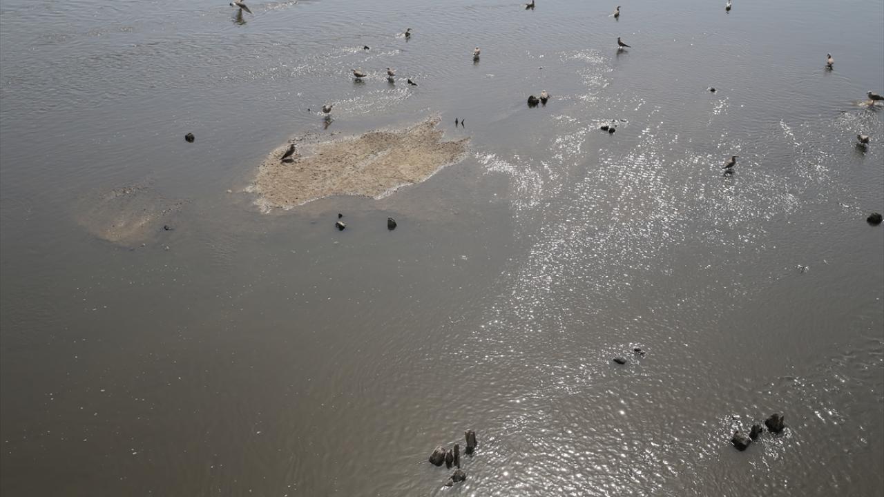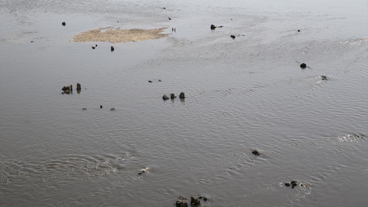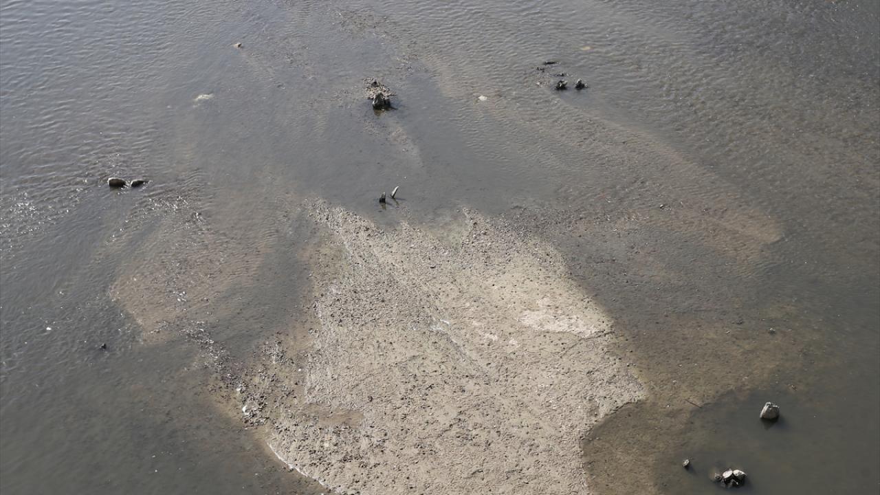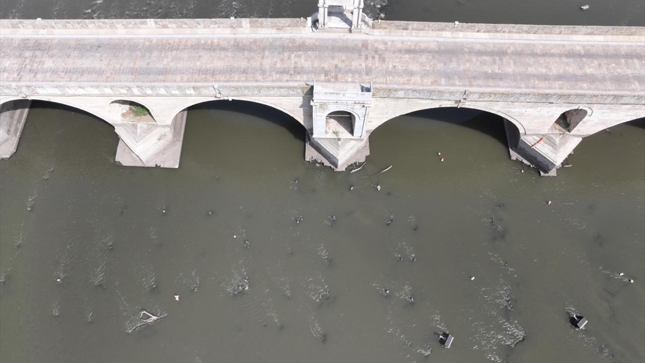 Edirne'de aşırı sıcaklara bağlı buharlaşma nedeniyle su seviyesi azalan Meriç Nehri'nde, asırlar öncesinden kalan ahşap köprünün ayakları görünür hale geldi.