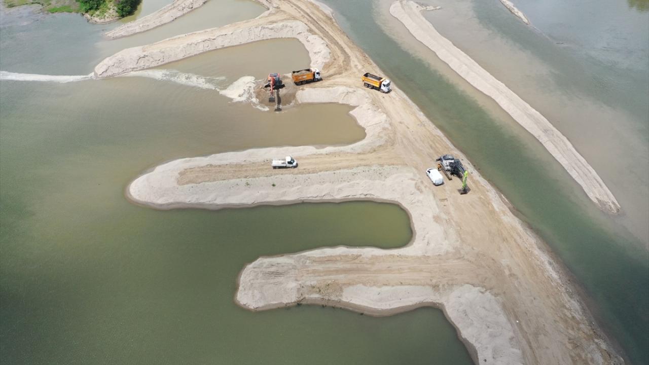 Devlet Su İşleri 11. Bölge Müdürlüğü ekipleri, Meriç Nehri`ndeki çalışmalar kapsamında Dr. Mehmet Müezzinoğlu Köprüsü ve Süvari Köprüsü arasındaki kesimde iş makineleriyle su akışını yavaşlatan kum öbeklerini temizliyor.