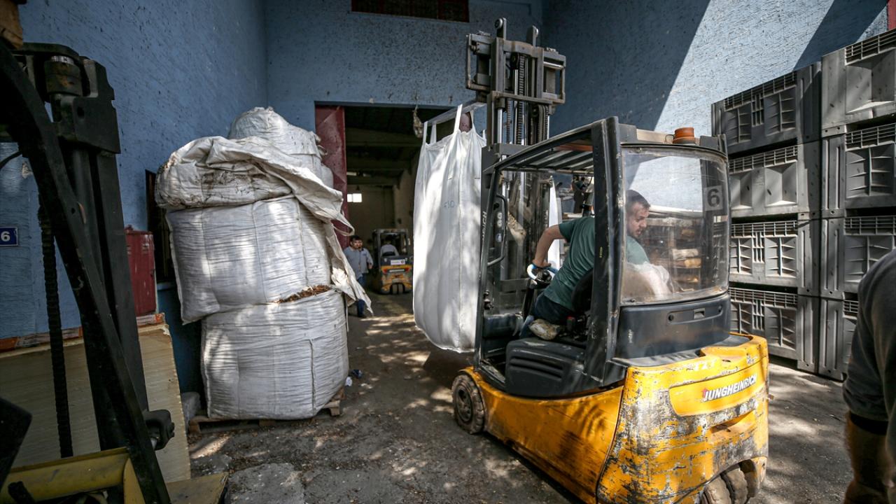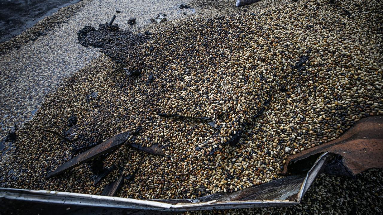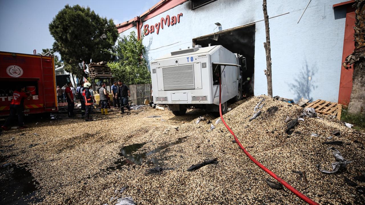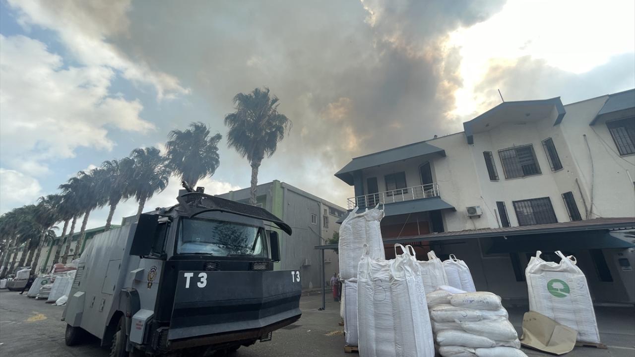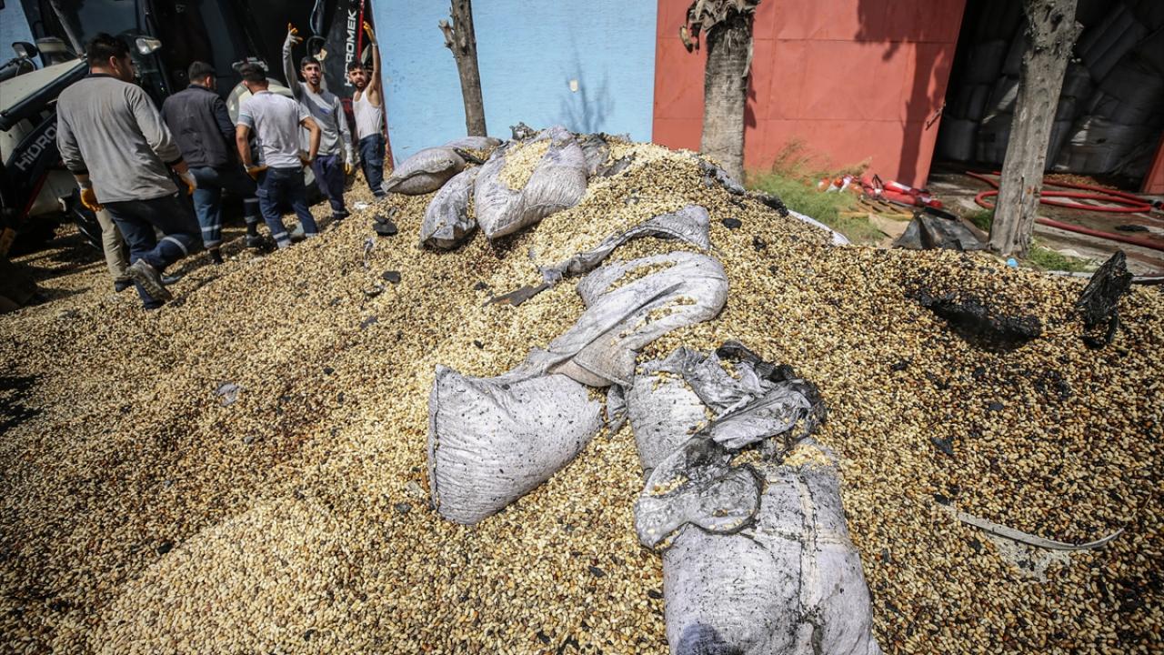 Firma çalışanları, alevlerin diğer alanlara sıçramasını önlemek için kuru yemiş çuvallarını iş makineleriyle depodan çıkardı.