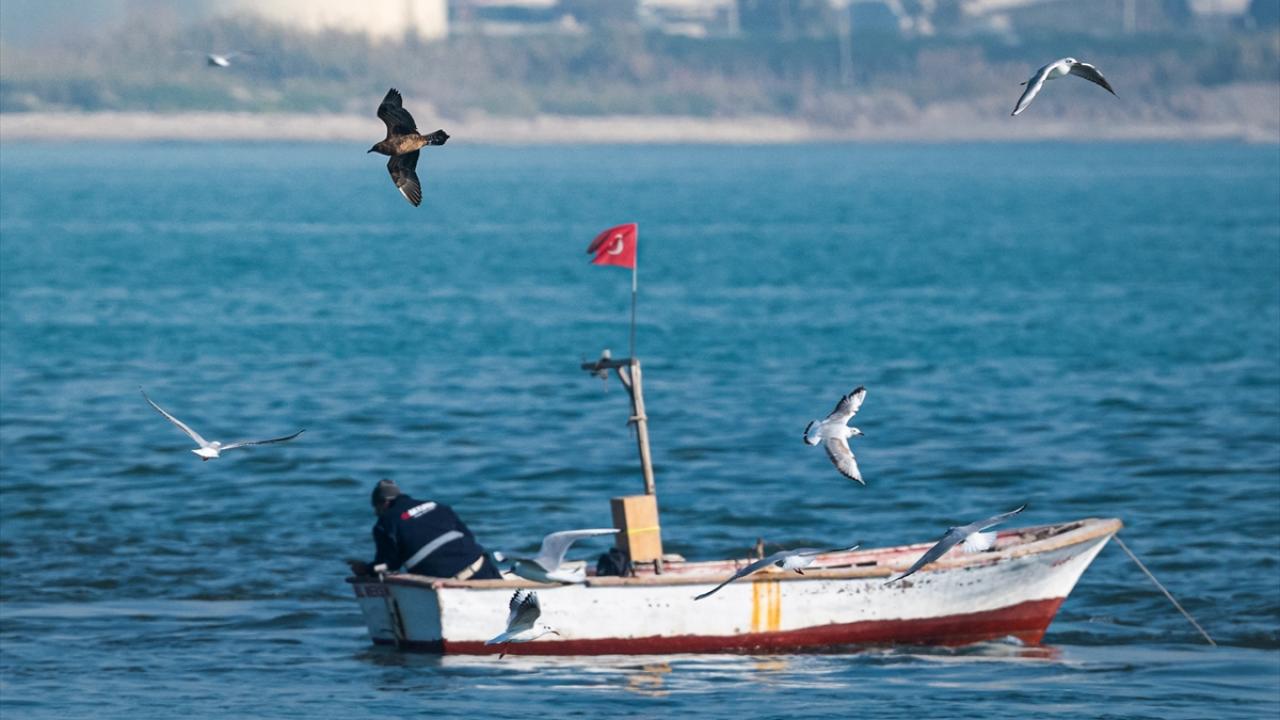 Mersin’de avdan dönen balıkçıların etrafını saran martılar, deniz üstünde avdan paylarını almak için mücadele etti.