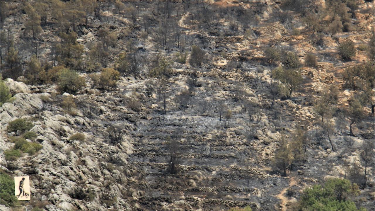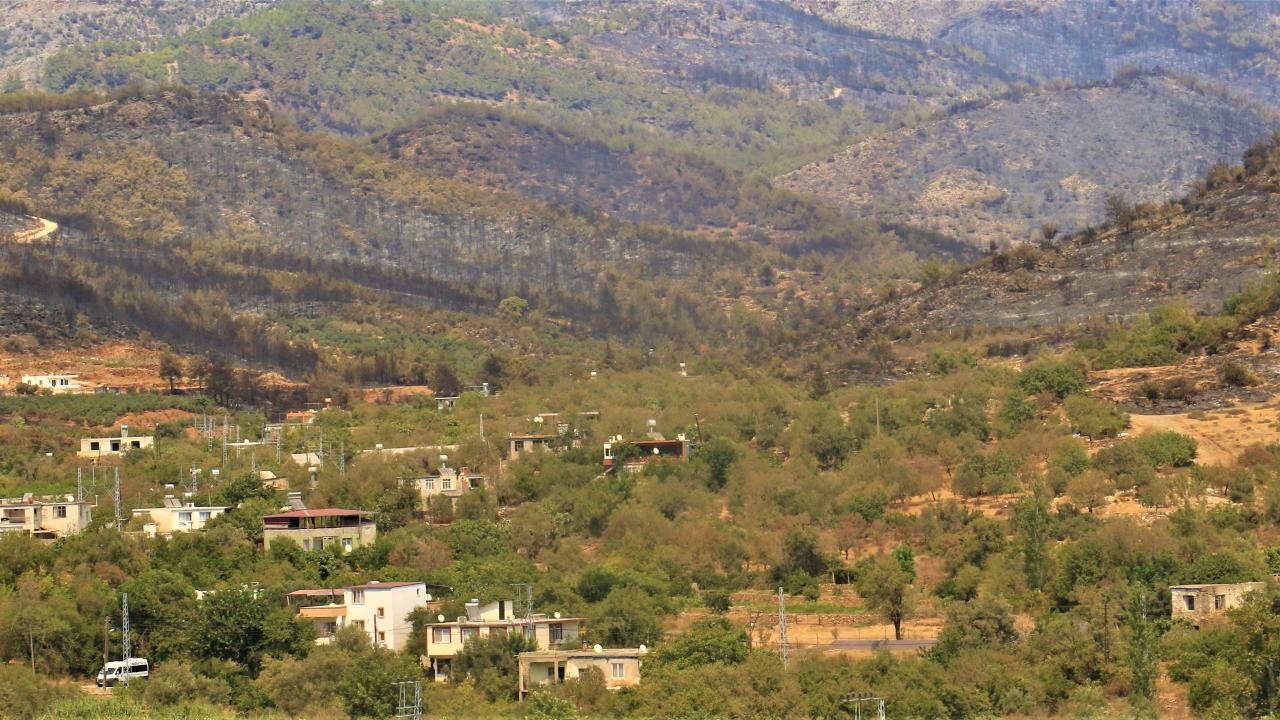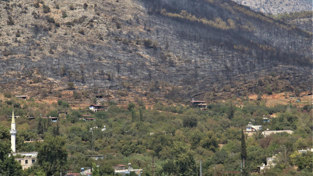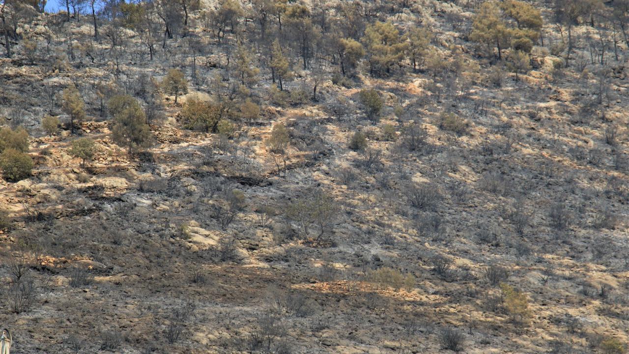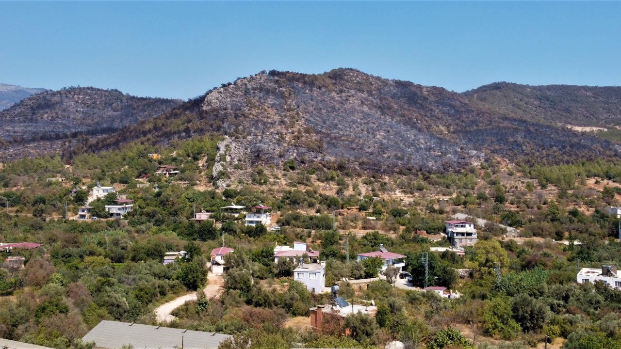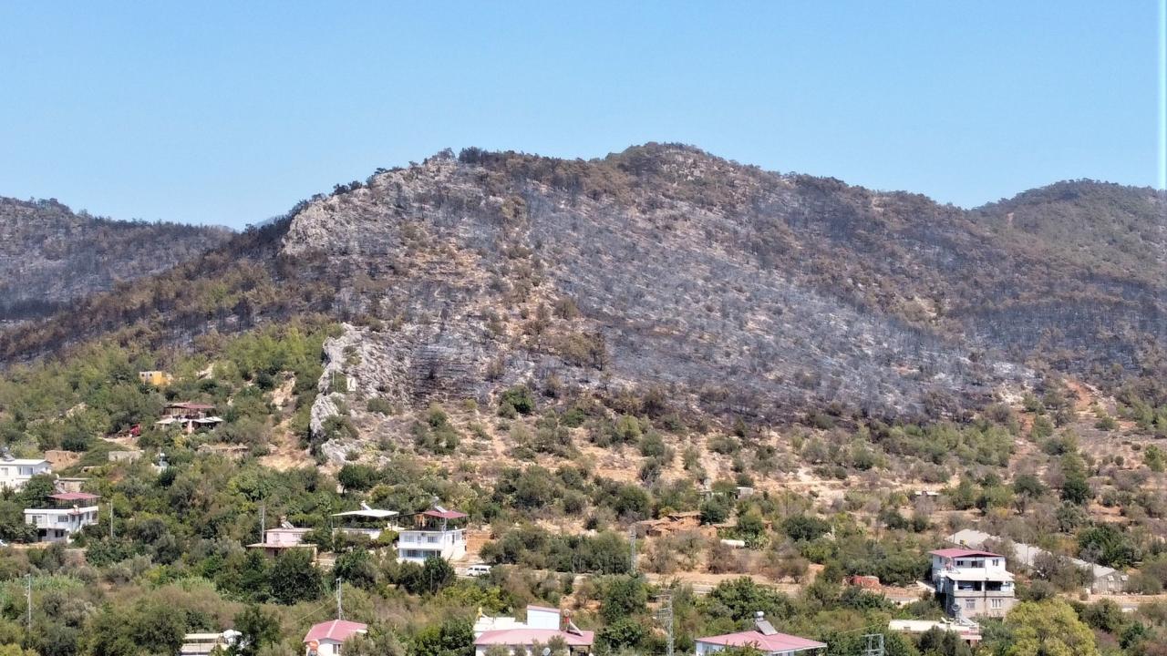 Mersin'de önceki gün çıkan havadan ve karadan süren 29 saat müdahalenin ardından kontrol altına alınıp söndürülen bin 500 hektar alanın zarar gördüğü yangın da küle dönen bölge havadan görüntülendi.