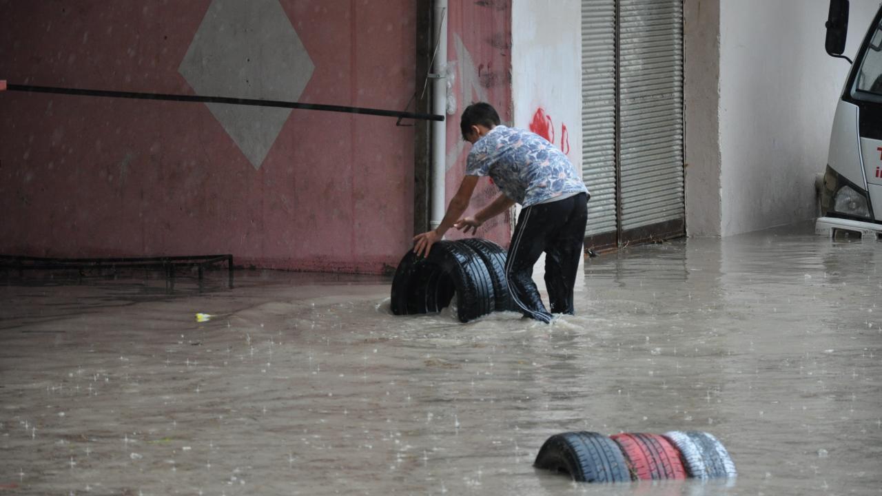 Bir iş yerinde bulunan araç lastikleri ise sel sularına kapıldı.
