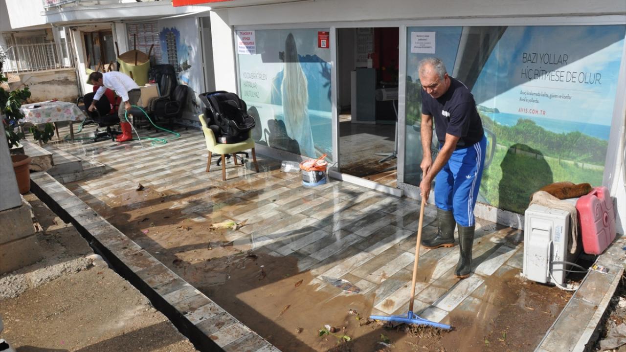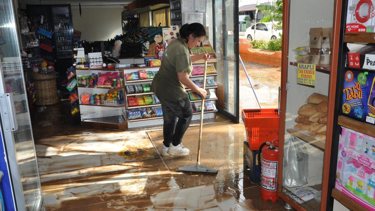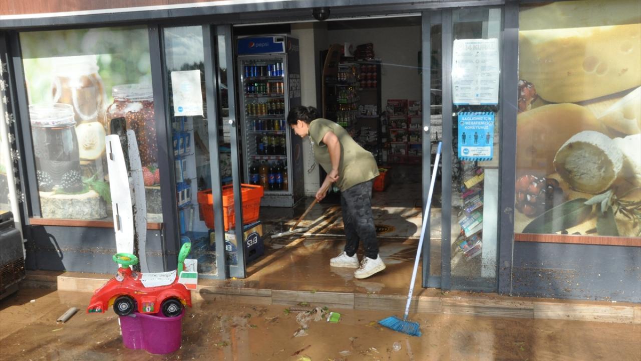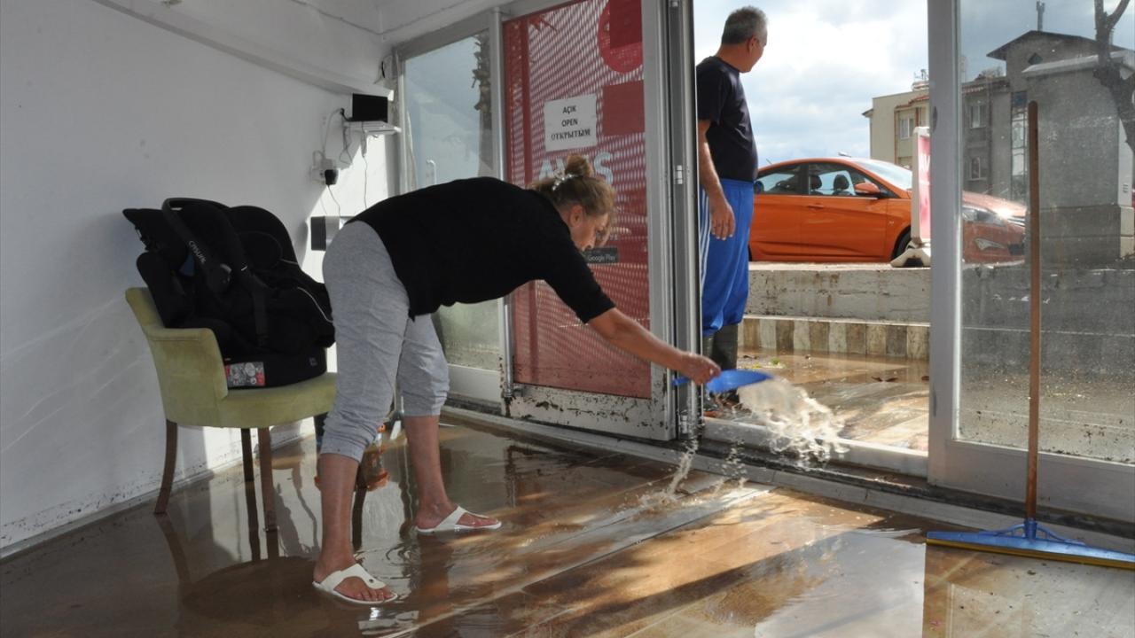 Yağmurun durmasının ardından iş yeri sahipleri ve çalışanları dükkanlarının içindeki suyu temizlemeye başladı.