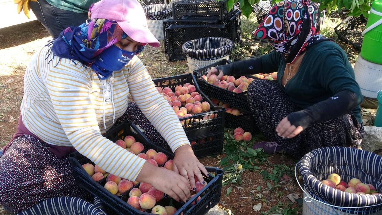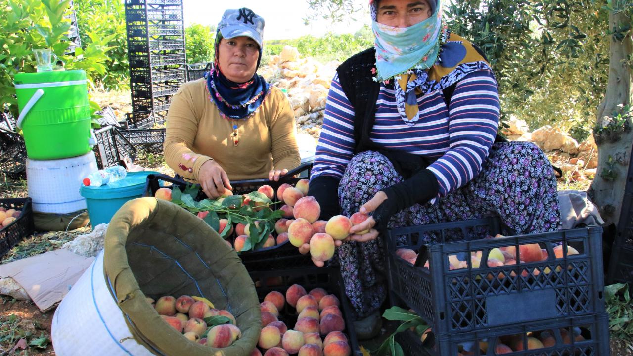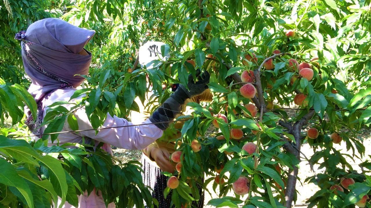 İşçilerin sabah erkenden başlayarak tek tek kopararak küfelere koyup taşıdığı şeftali, kadınların elinden kasalara özenle yerleştirilerek müşterilere gönderiliyor.