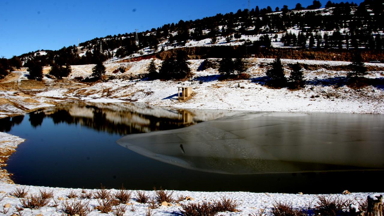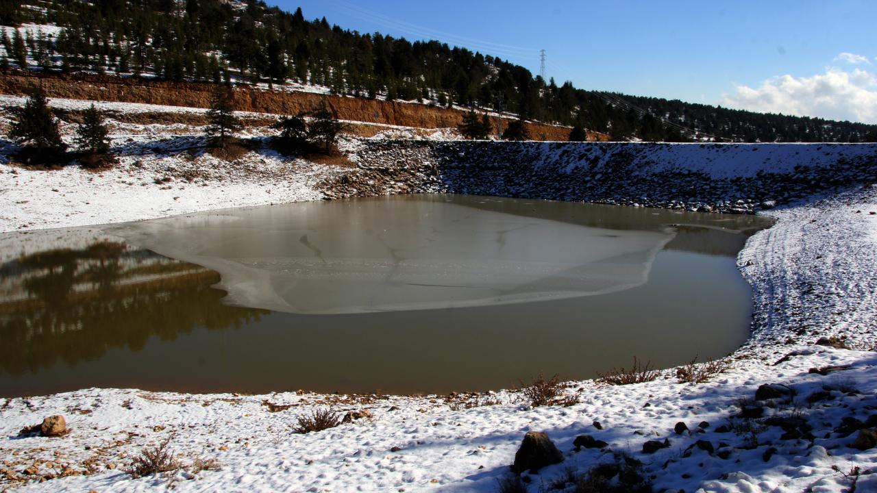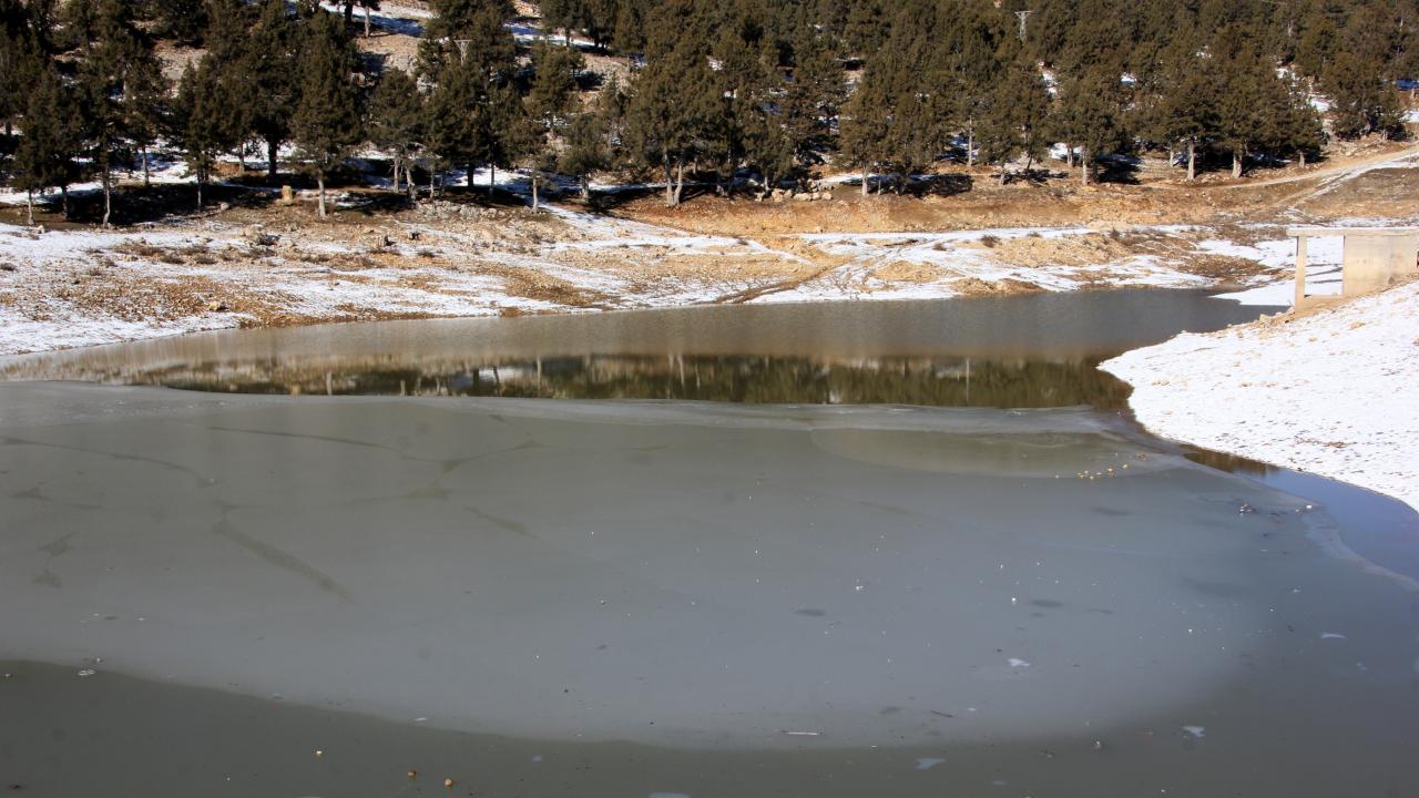 1500 metre yükseklikteki Tozlu Mahallesi`nde tarımsal sulamada kullanılan Tozlu Göleti`nin yüzeyi, soğuk hava nedeniyle buz tuttu.
