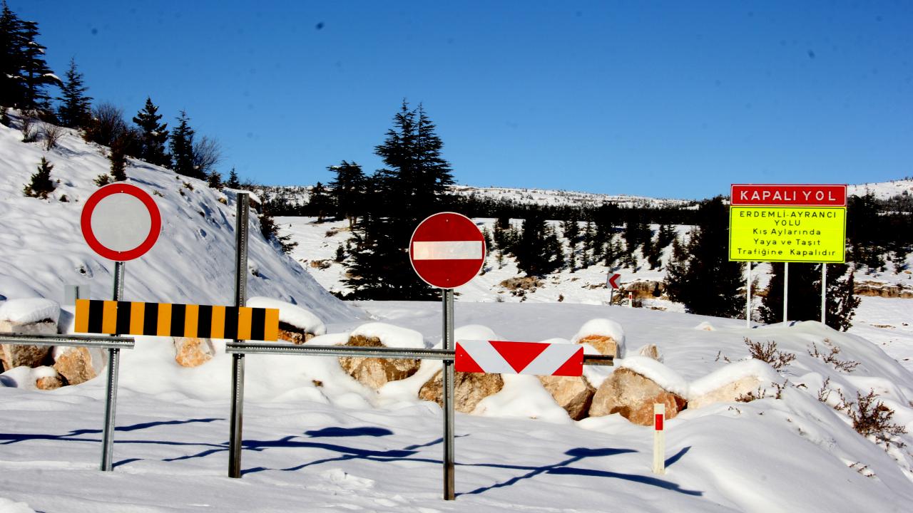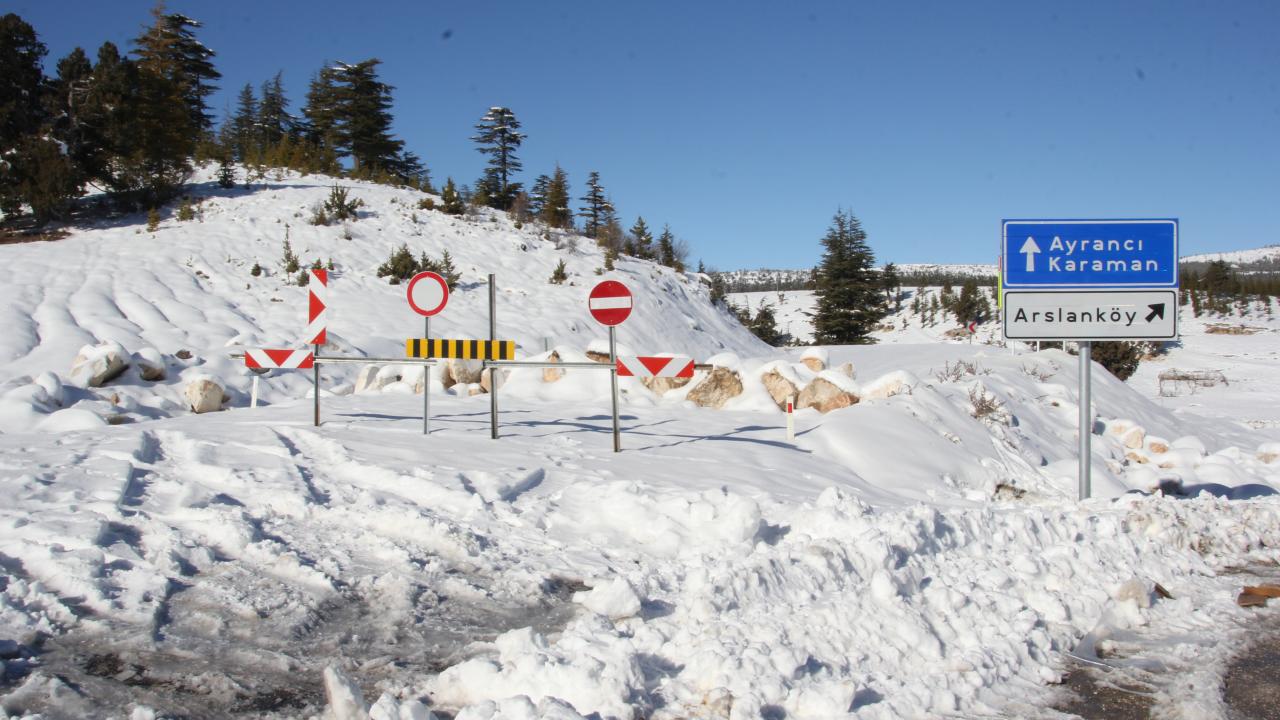 Erdemli`yi Karaman`ın Ayrancı ilçesine bağlayan karayolu, yoğun kar yağışı ve buzlanma nedeniyle karayolları ekiplerince trafiğe kapatıldı.