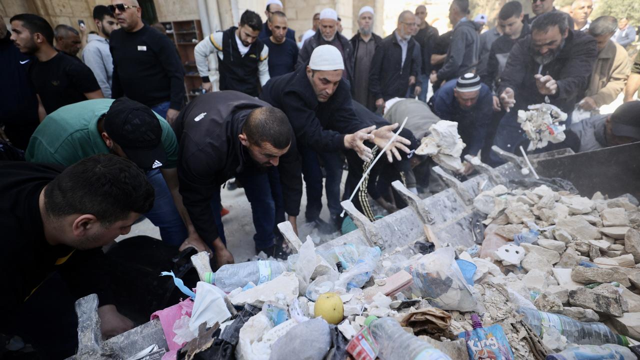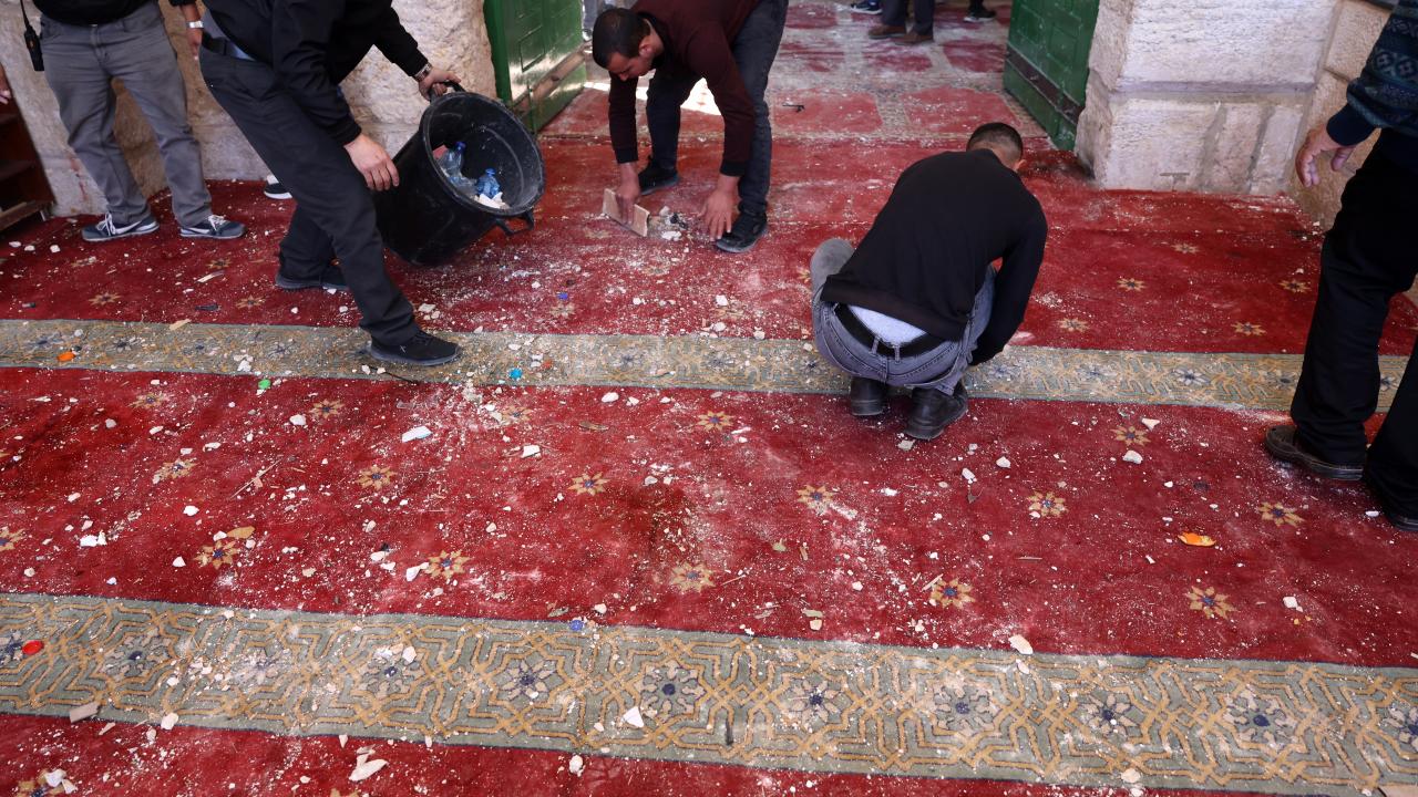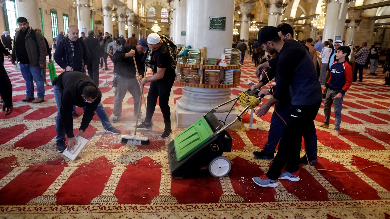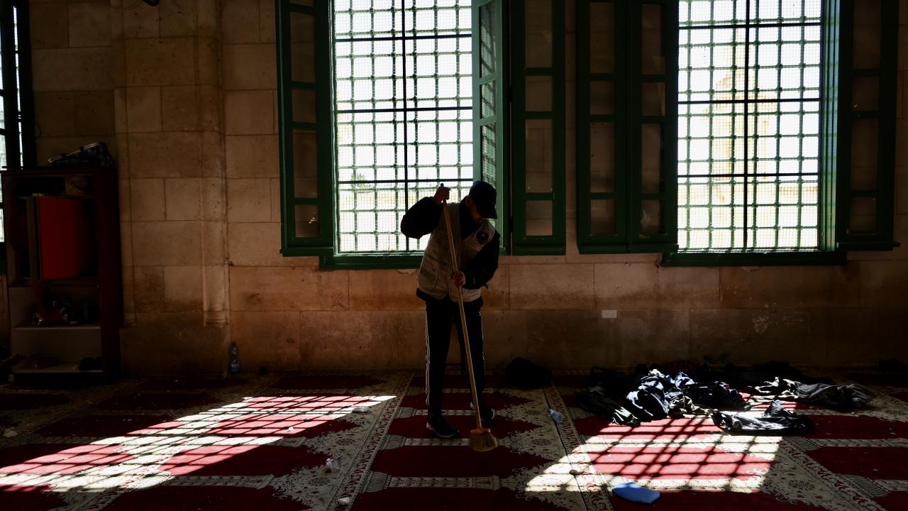 Filistinliler, yaşanan olayların ardından camide temizleme çalışması başlattılar.