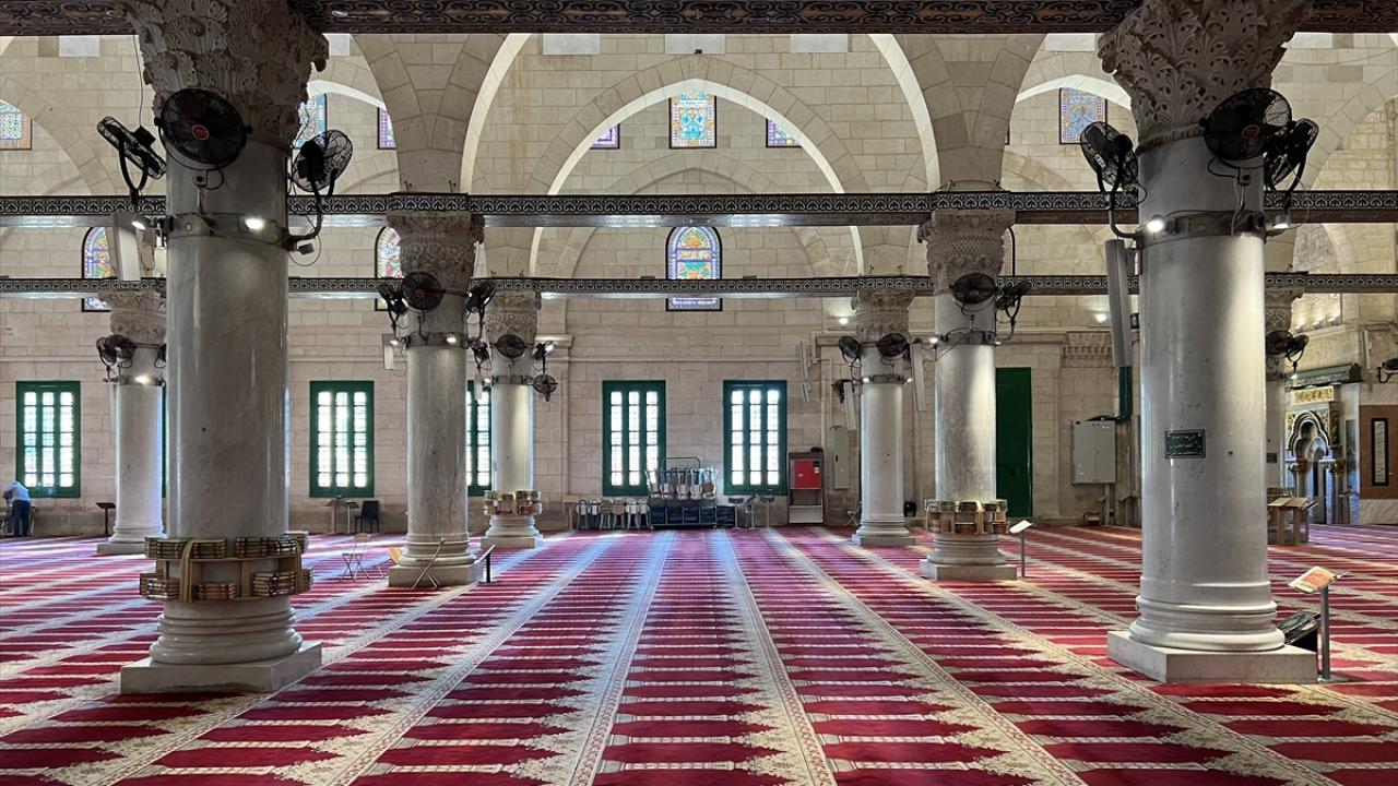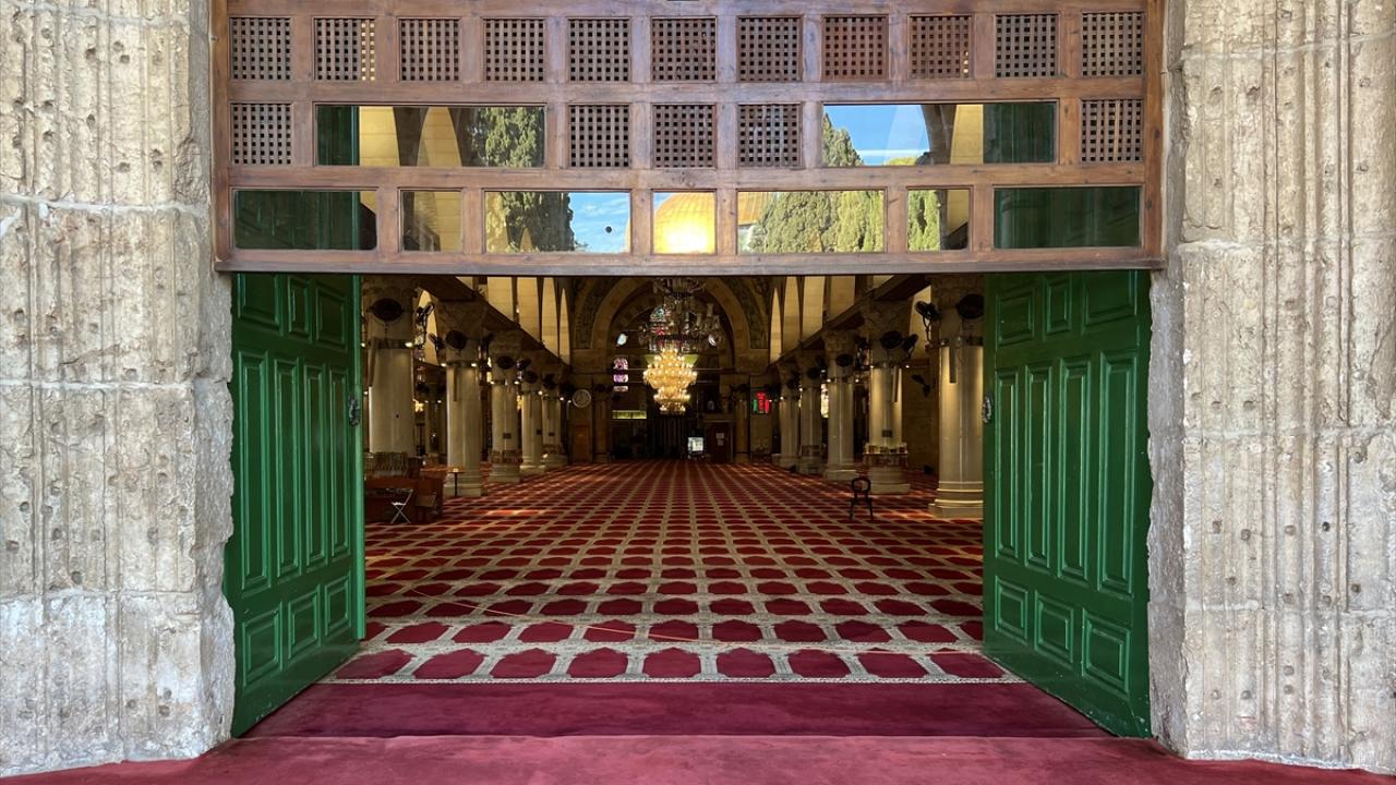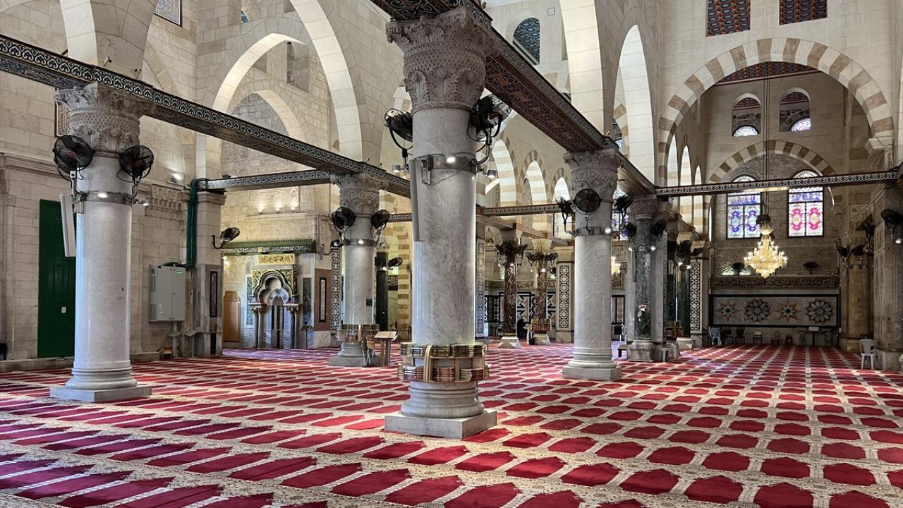İsrail kısıtlamaları nedeniyle Mescid-i Aksa haremi içerisi ve avlusu cuma namazı öncesi boş olduğu görüldü.