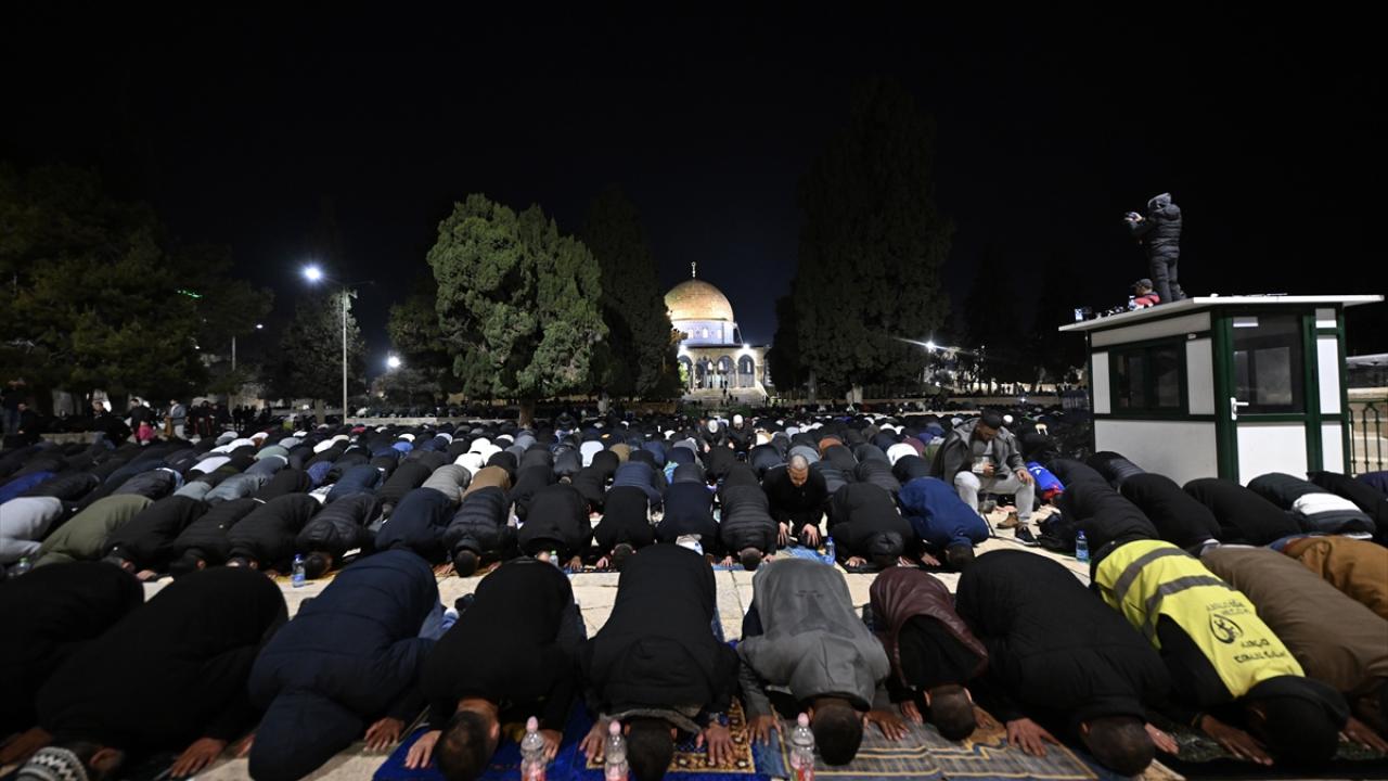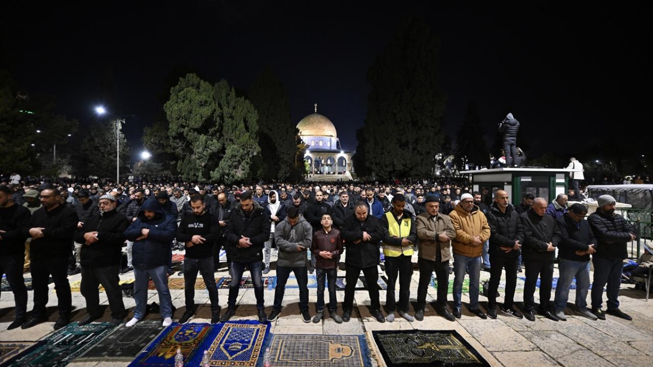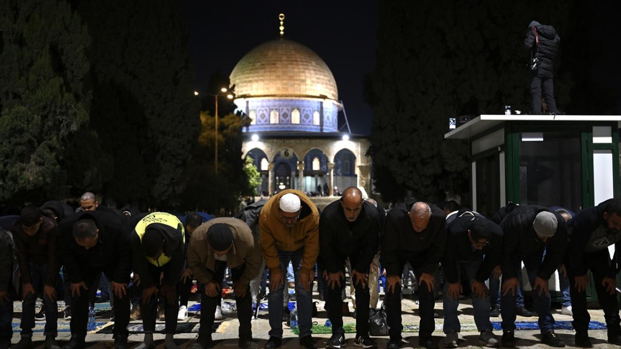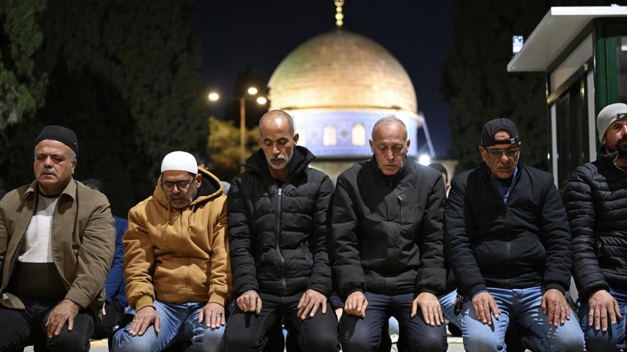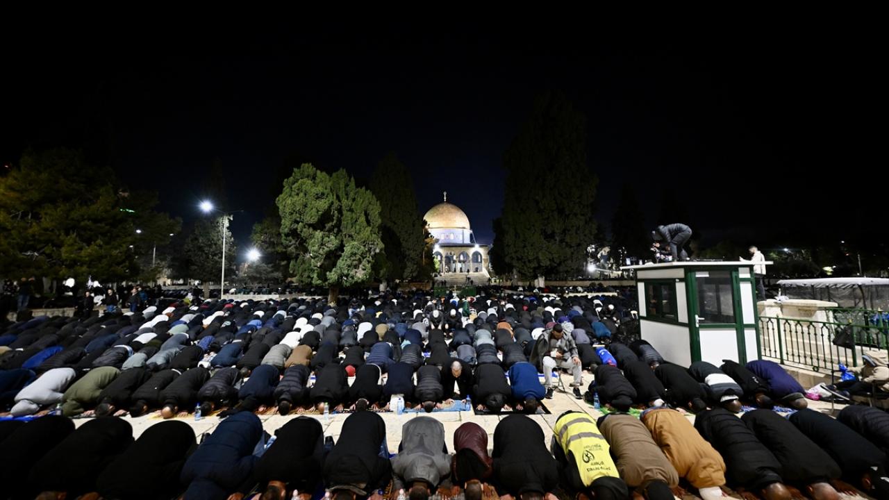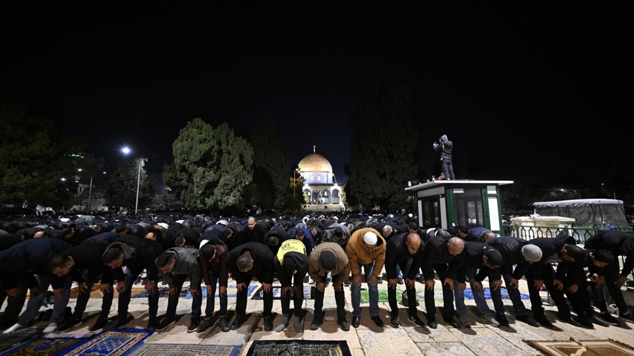 İsrail'in engellemelerine rağmen işgal altındaki Doğu Kudüs'te bulunan Mescid-i Aksa'ya girmeyi başaran Müslümanlar, yatsı ve teravih namazları için saf tuttu.