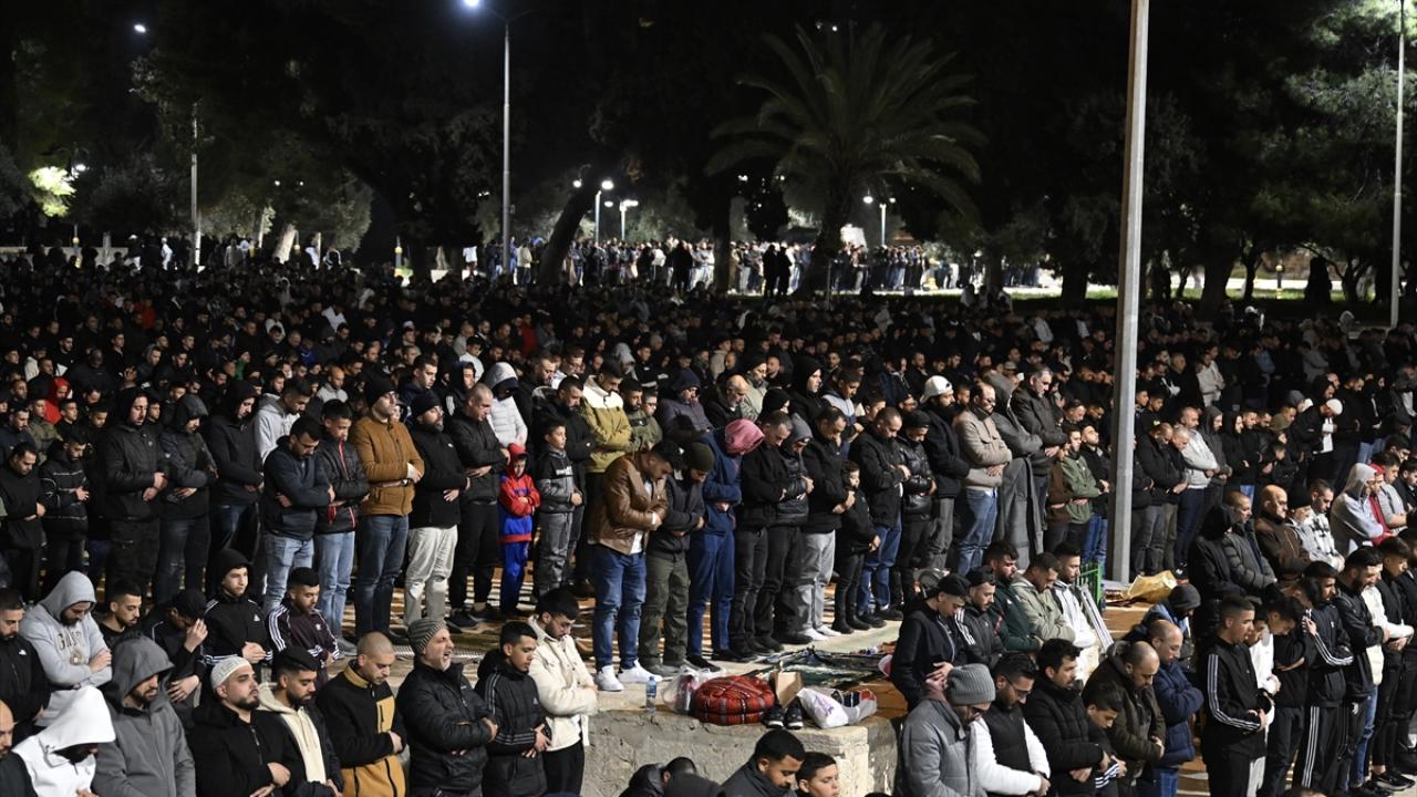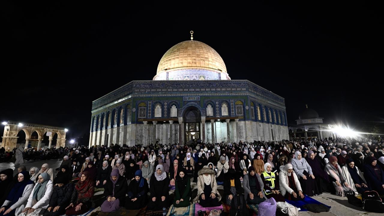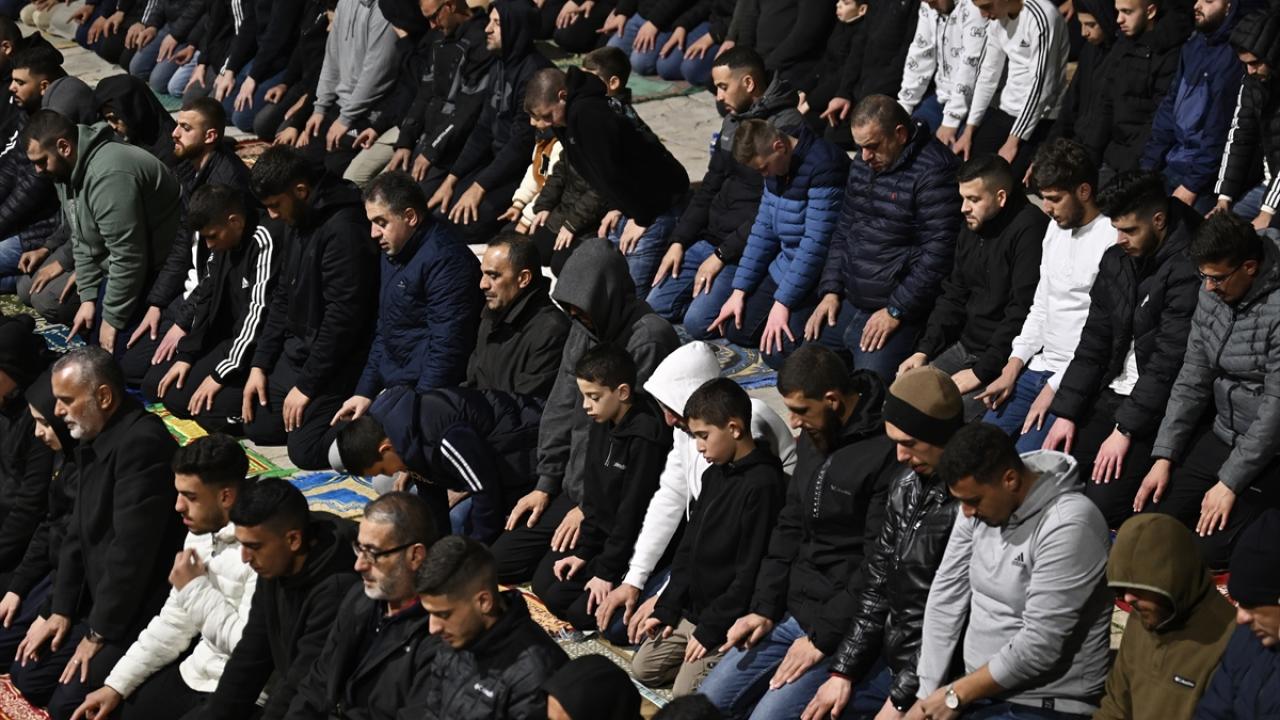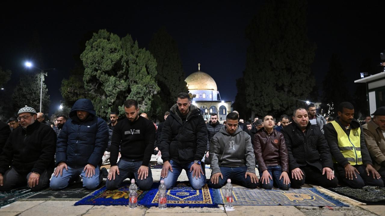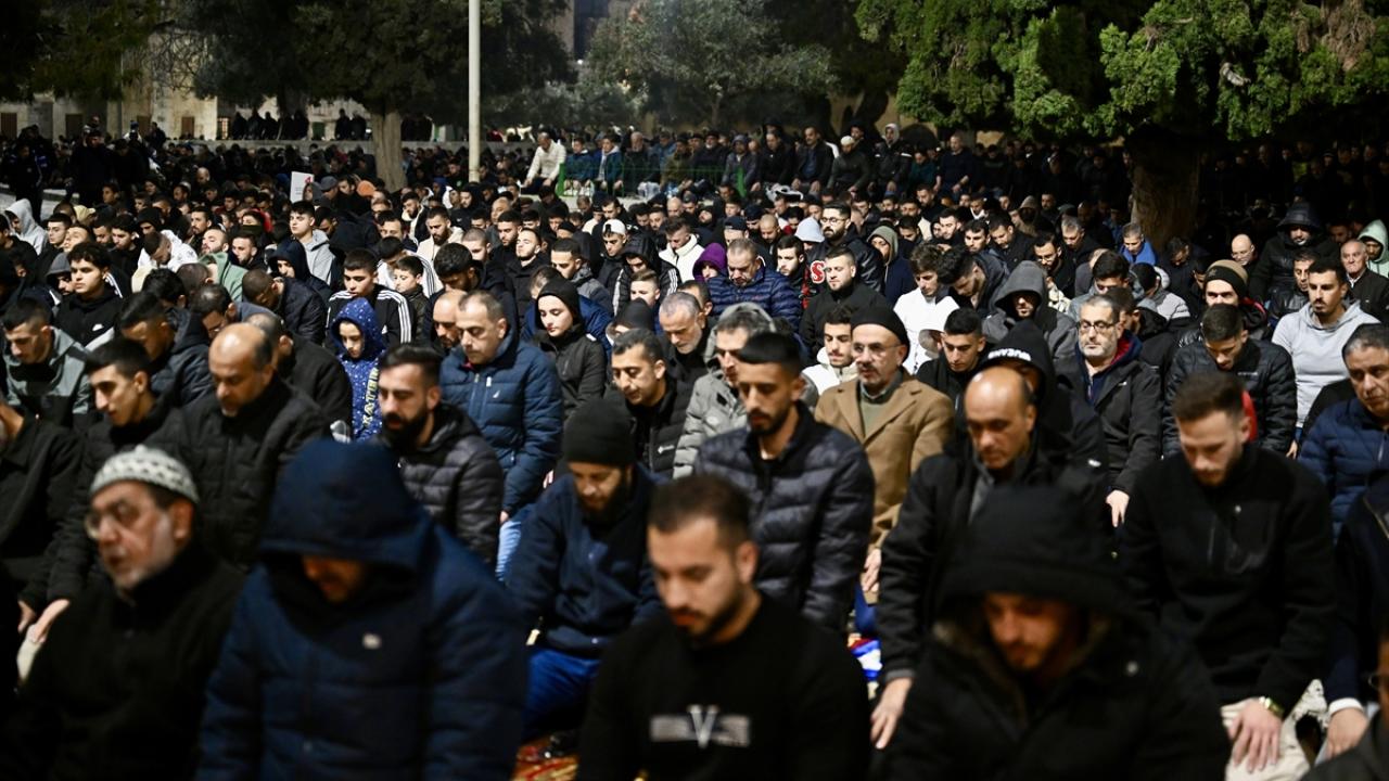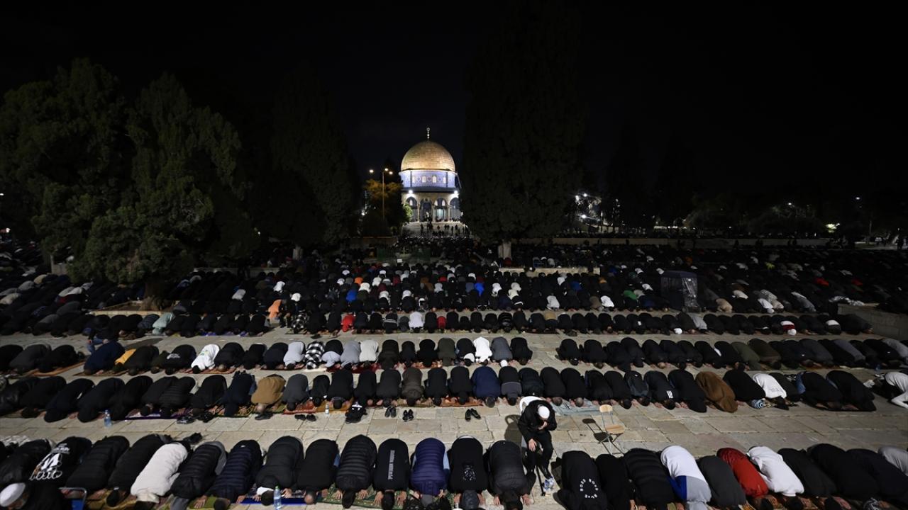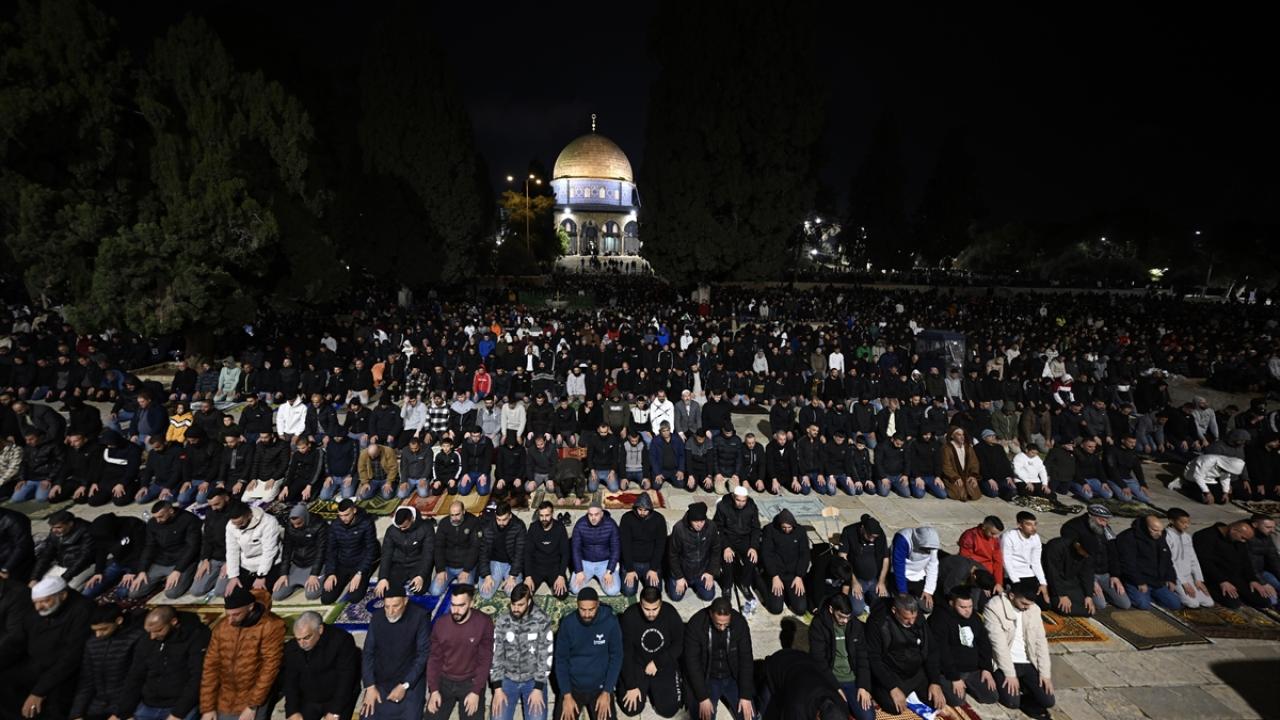 İsrail'in engellemelerine rağmen işgal altındaki Doğu Kudüs'te bulunan Mescid-i Aksa'ya girmeyi başaran Müslümanlar, yatsı ve teravih namazları için saf tuttu.