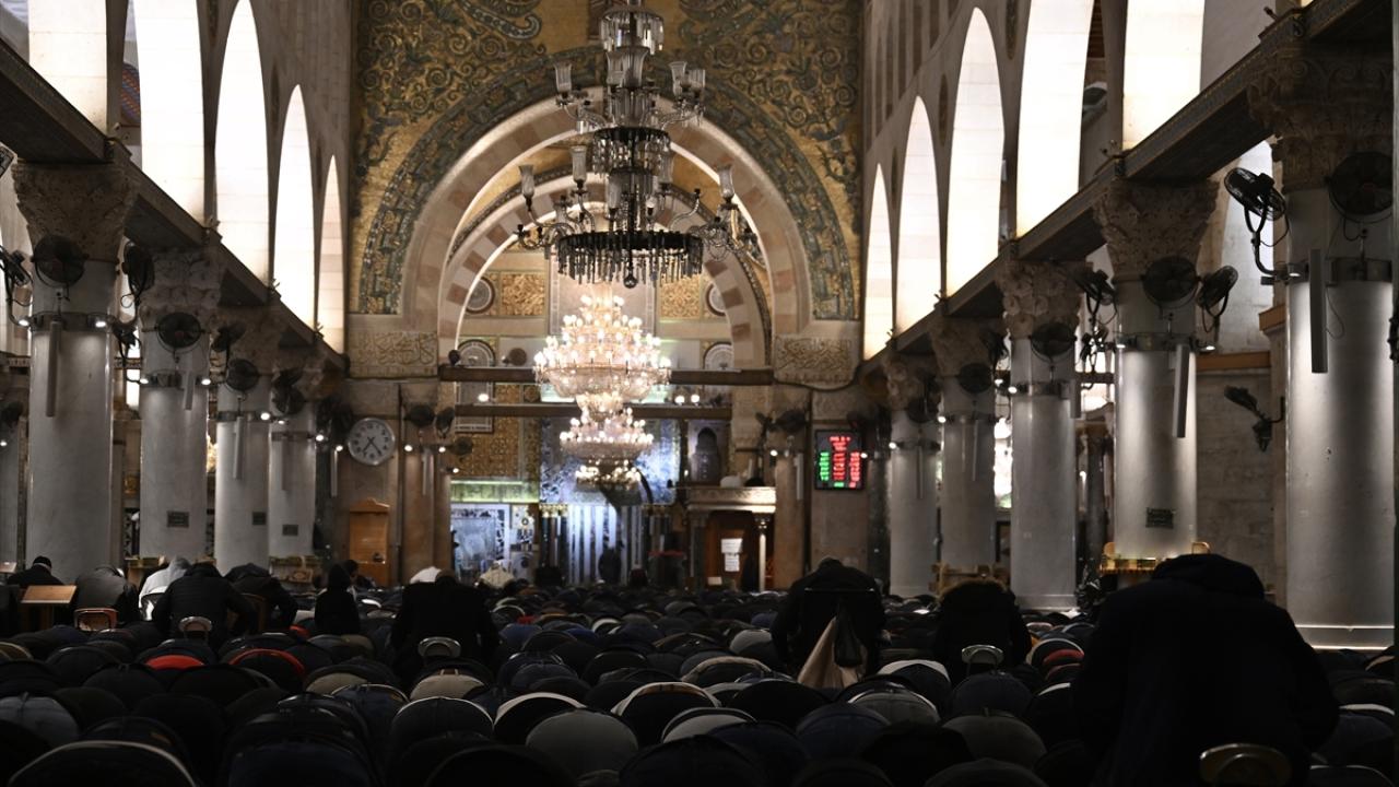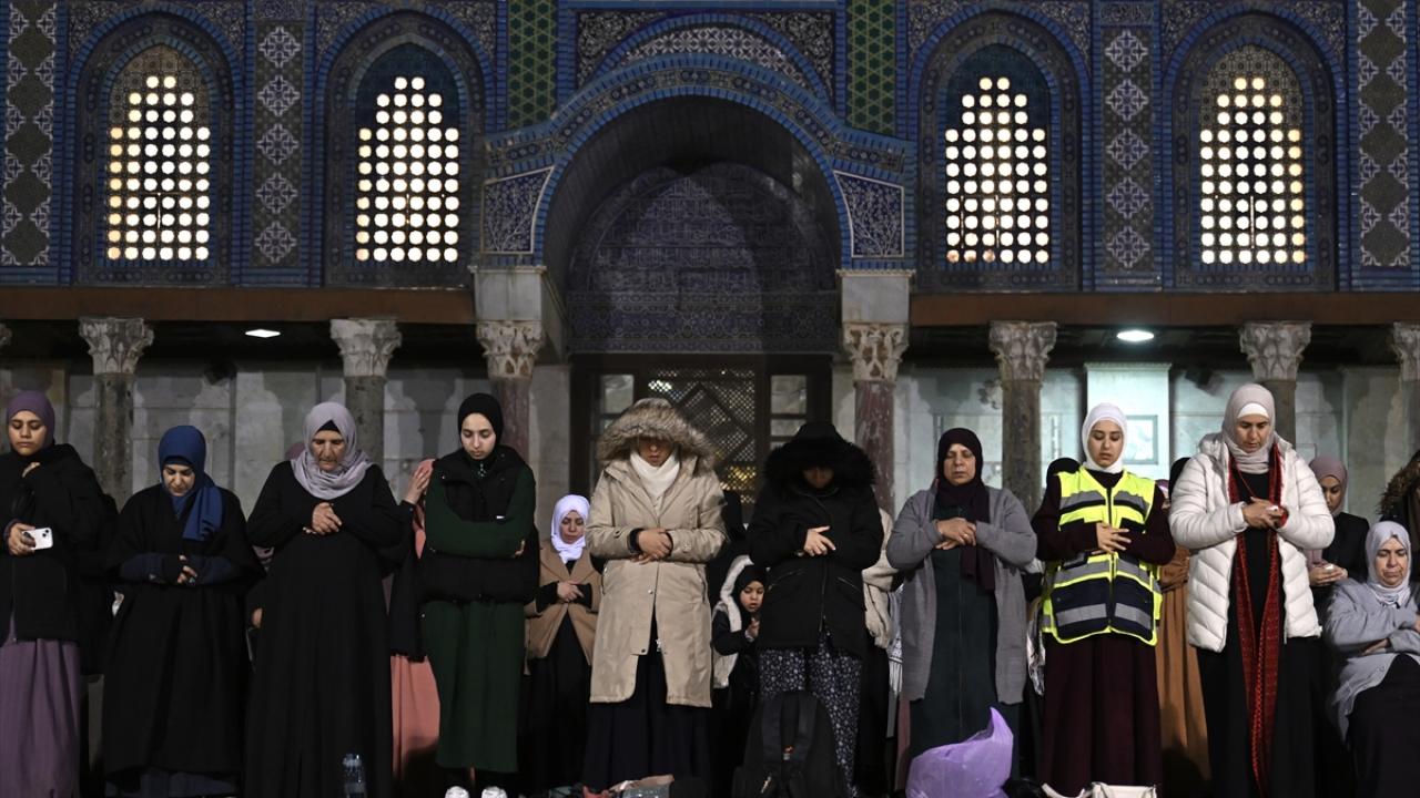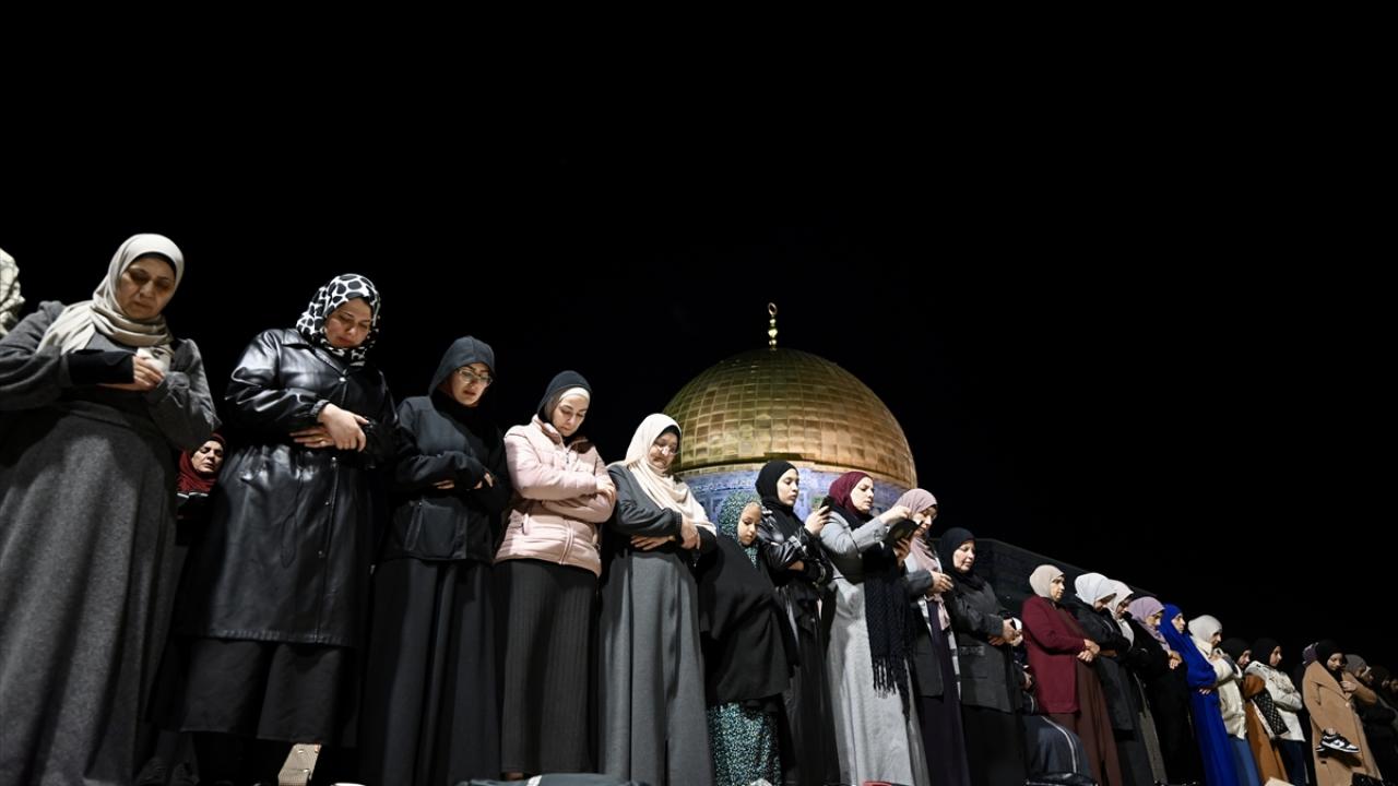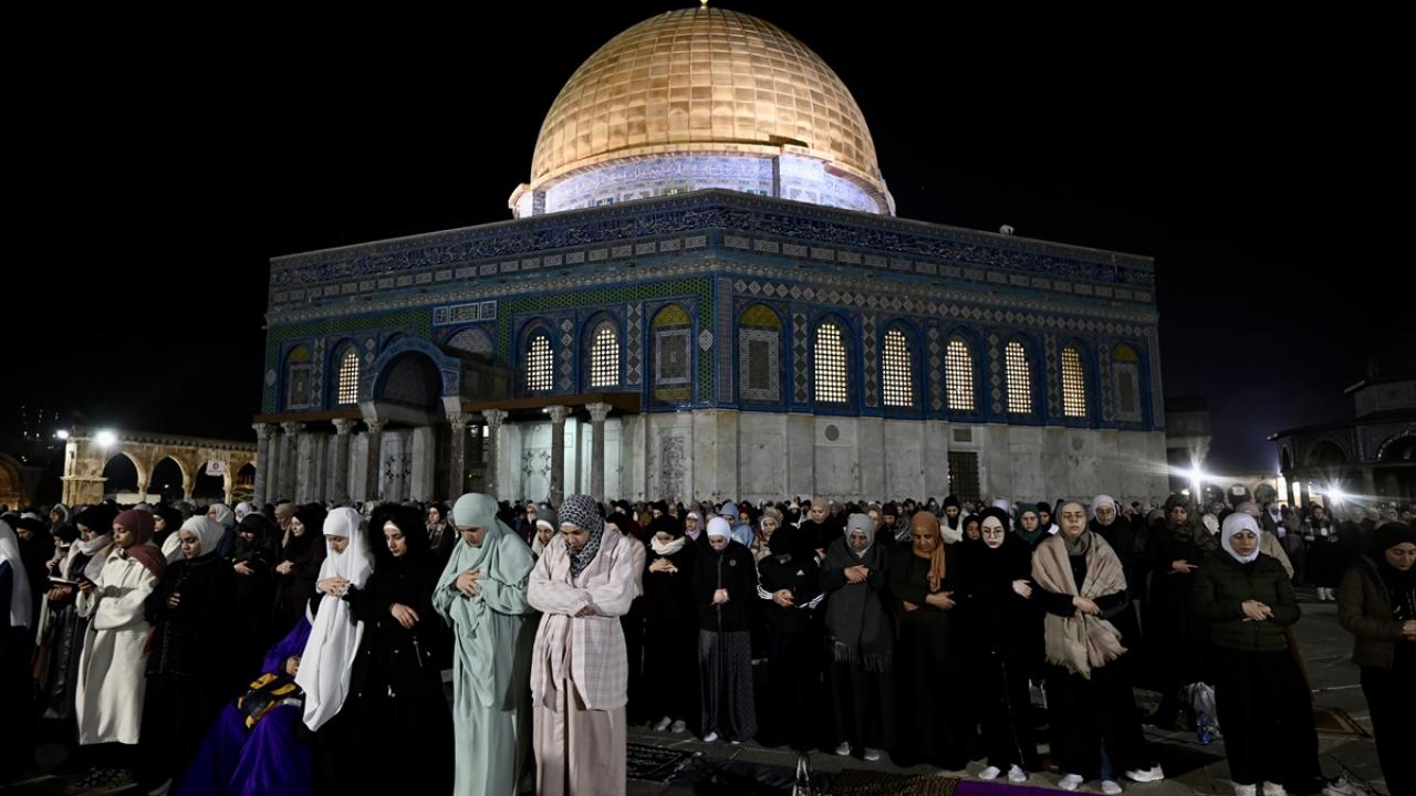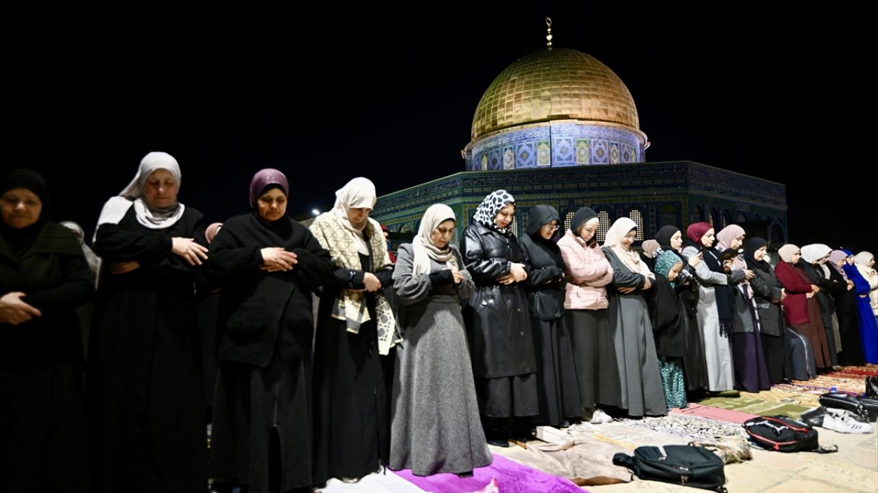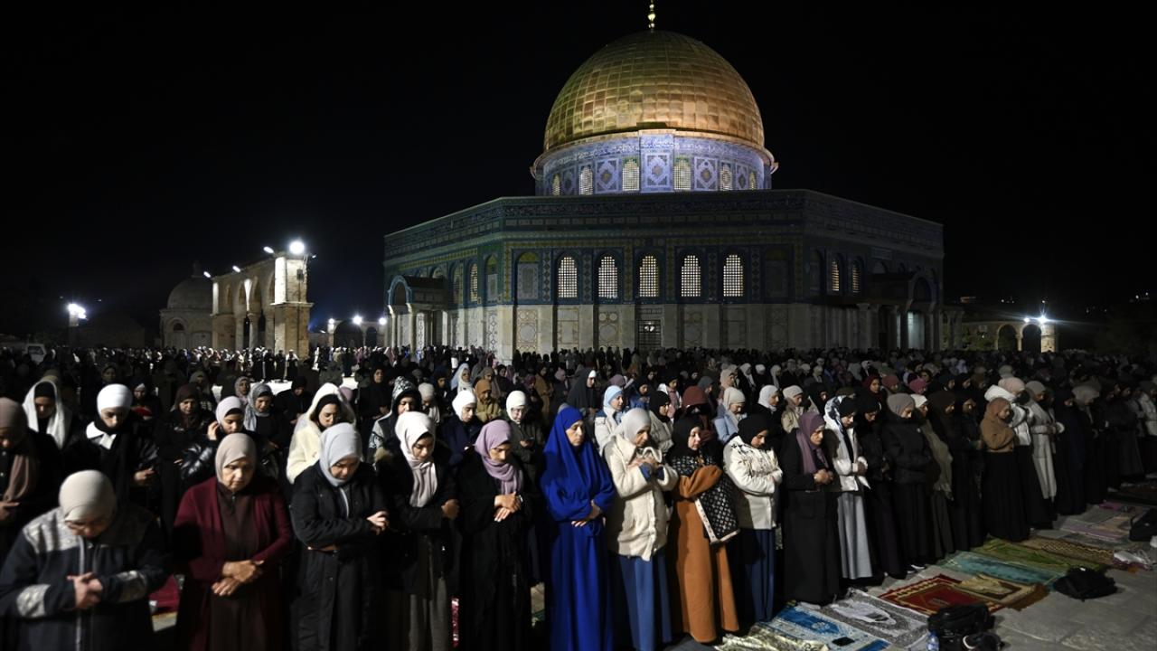 İsrail'in engellemelerine rağmen işgal altındaki Doğu Kudüs'te bulunan Mescid-i Aksa'ya girmeyi başaran Müslümanlar, yatsı ve teravih namazları için saf tuttu.