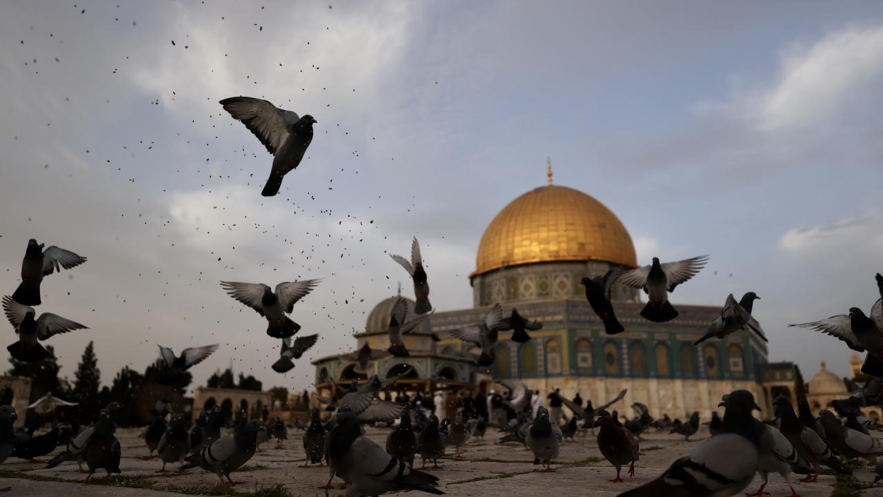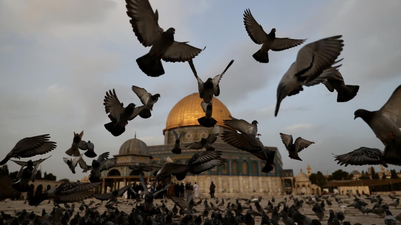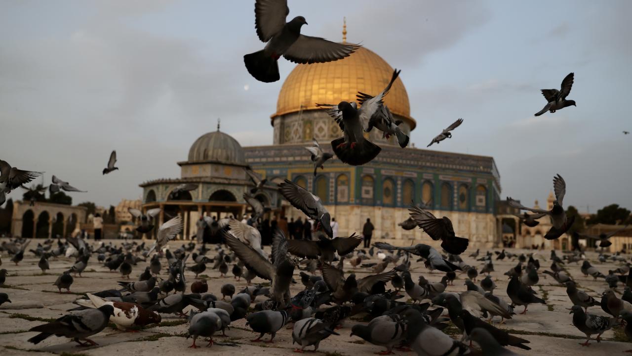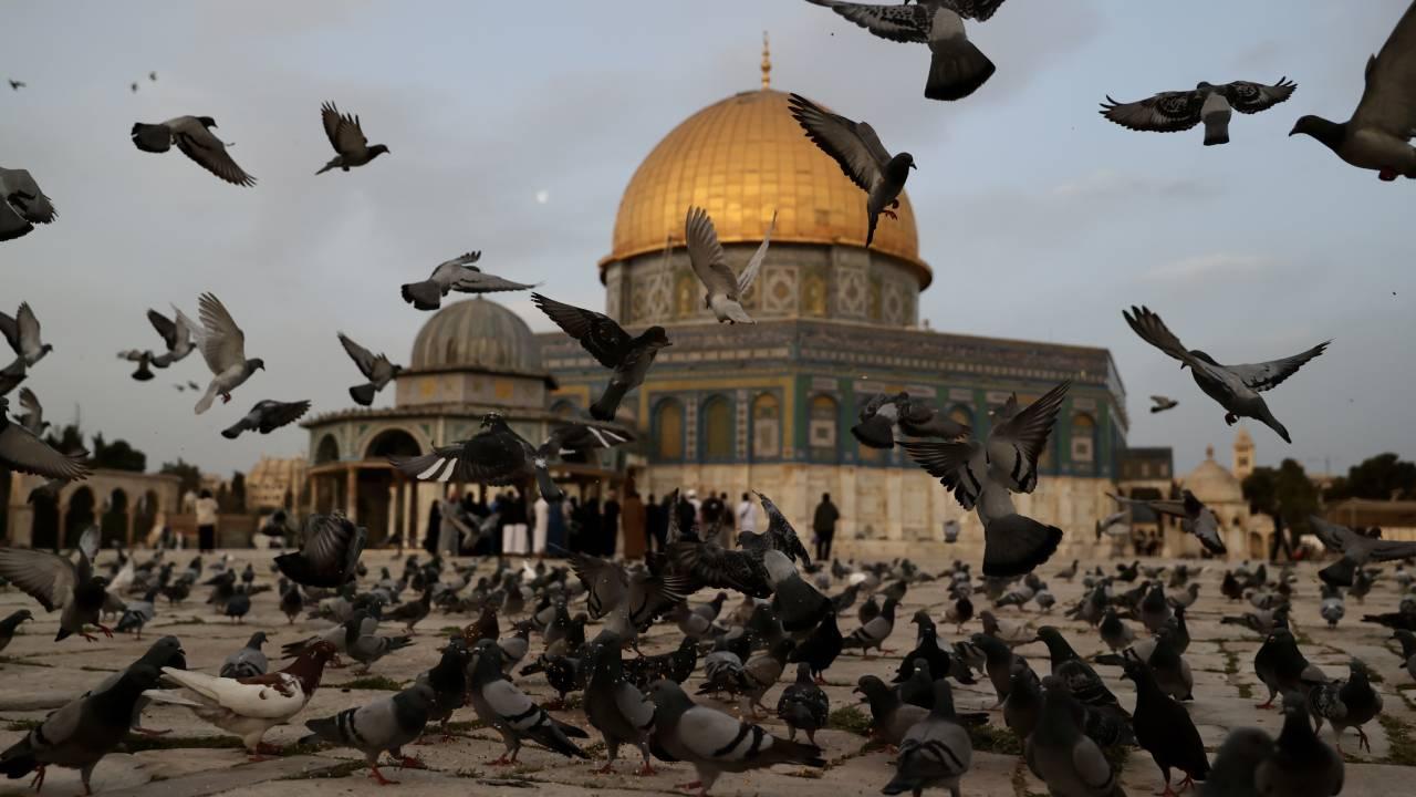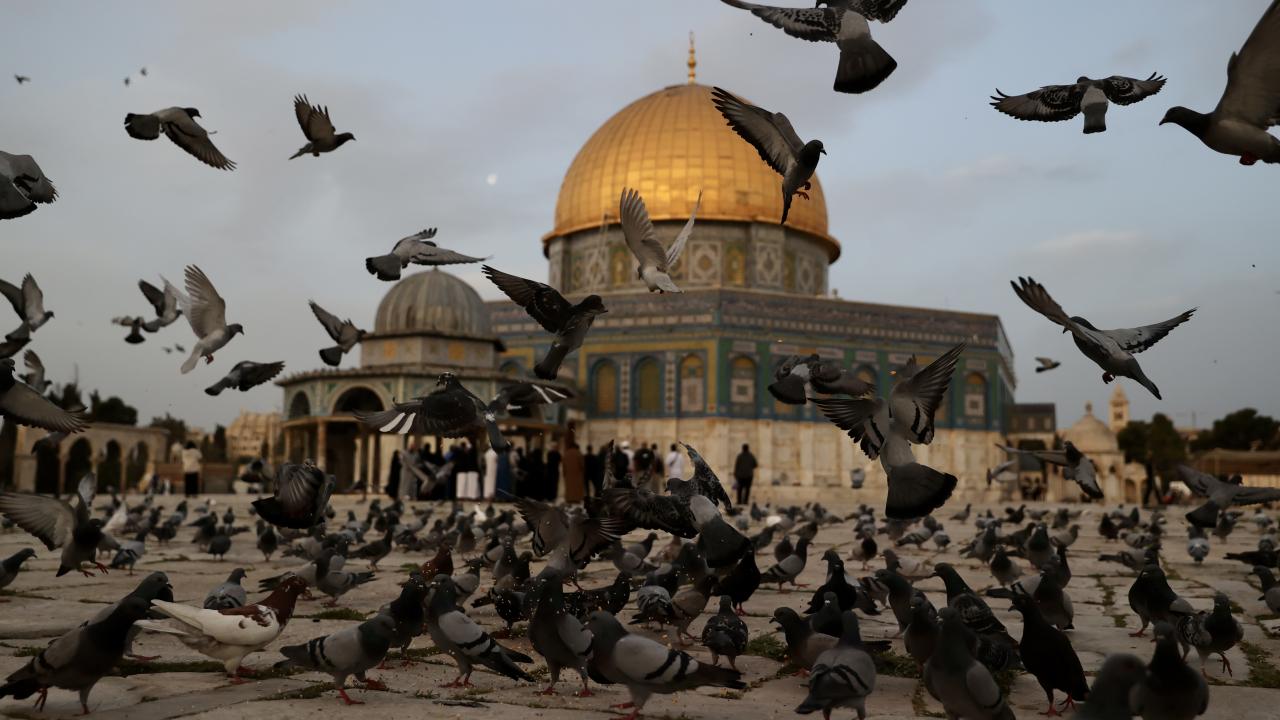 Kudüs'te Müslümanların ilk kıblesi olan Mescid-i Aksa içinde yer alan Kubbet'üs-Sahra Camii, sabah saatlerinde etrafında uçan güvercinlerle güzel görüntü oluşturdu.