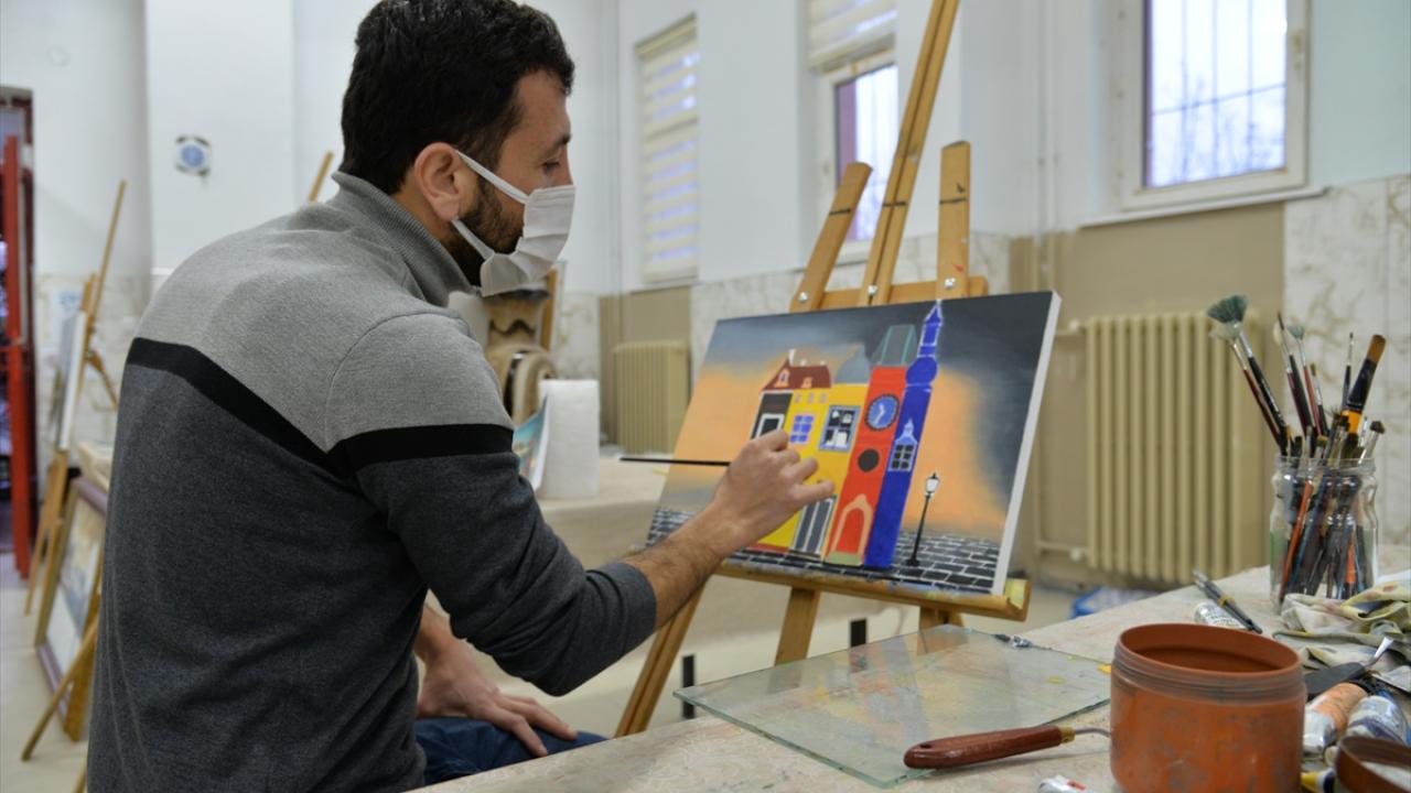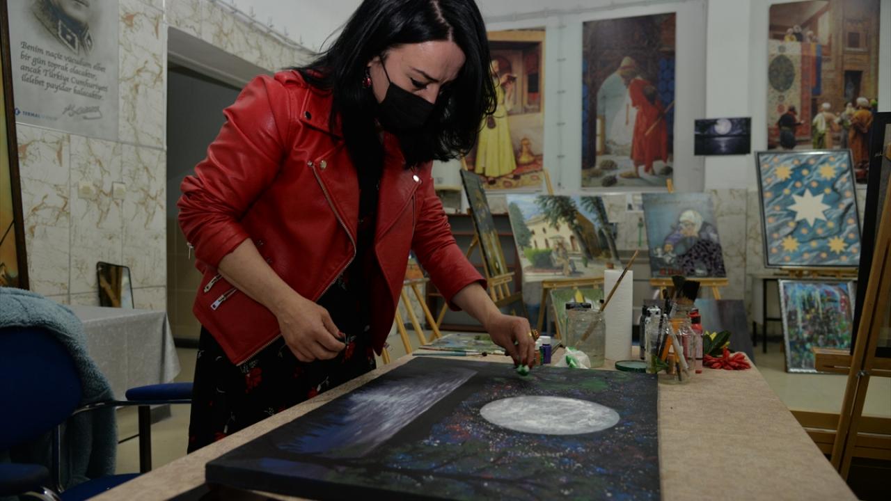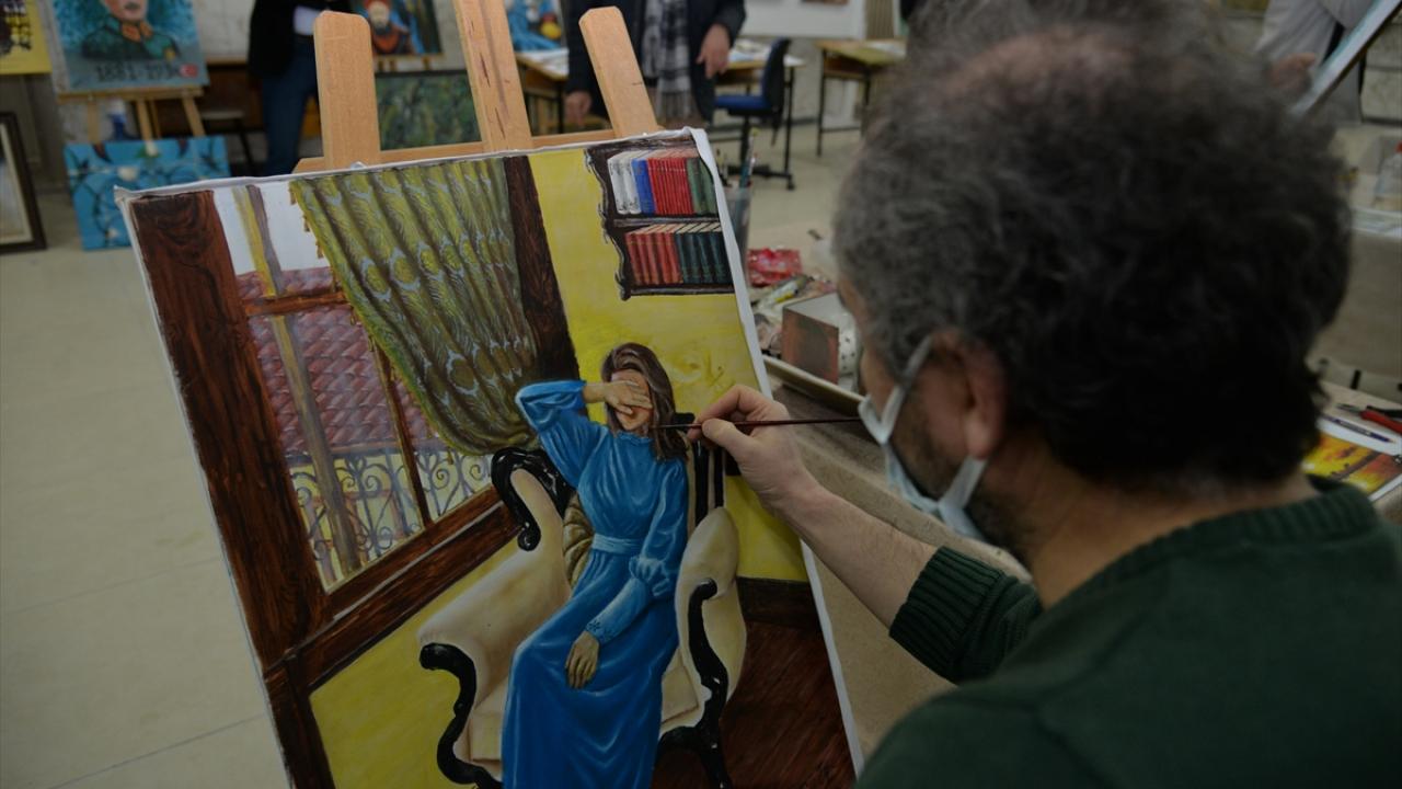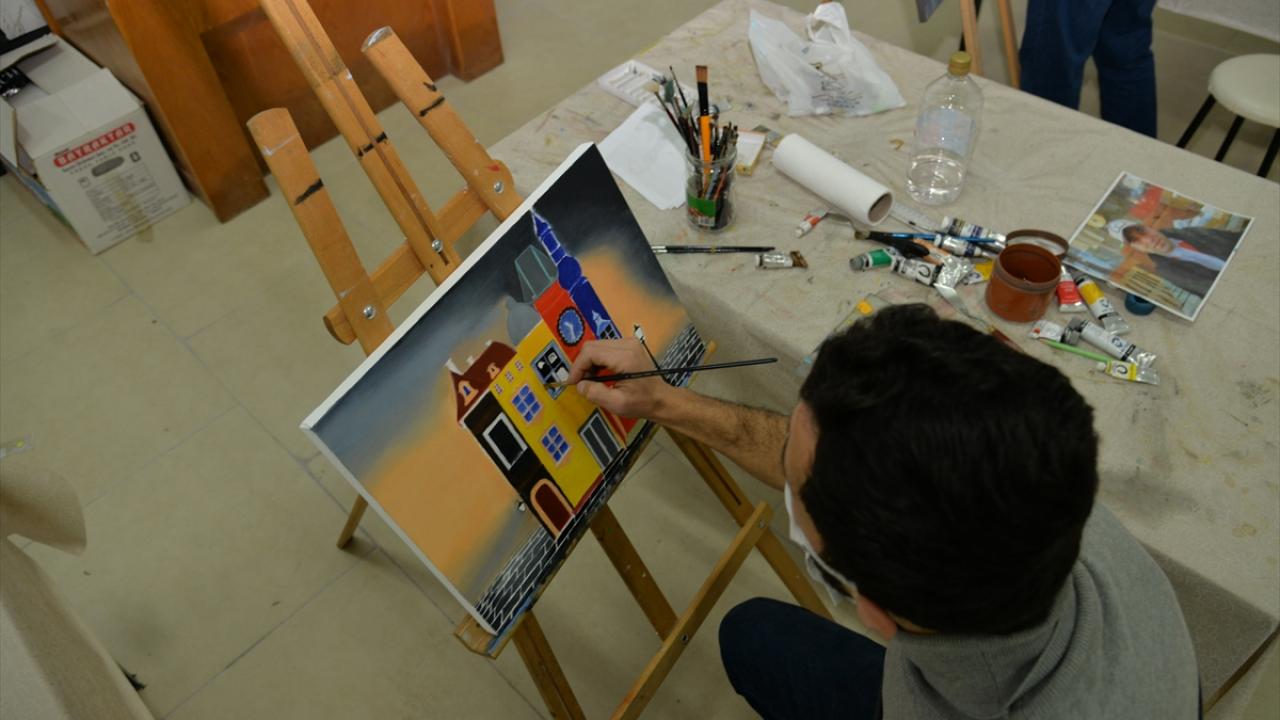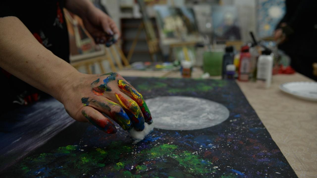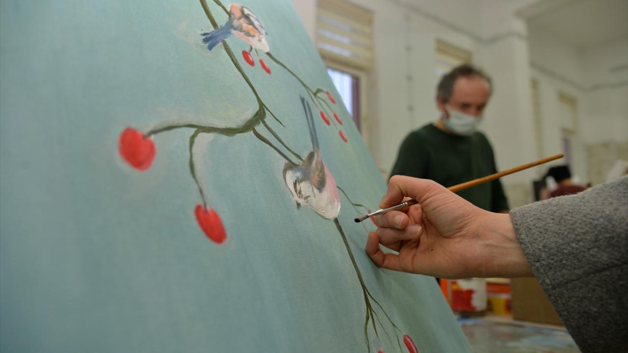 Sanat eğitmeni Musa Aydın öncülüğünde haftada iki gün toplam 10 saat eğitim alan kursiyerler, yağlı boya, sulu boya ve kara kalem gibi farklı tekniklerde resimler ortaya koyuyor.