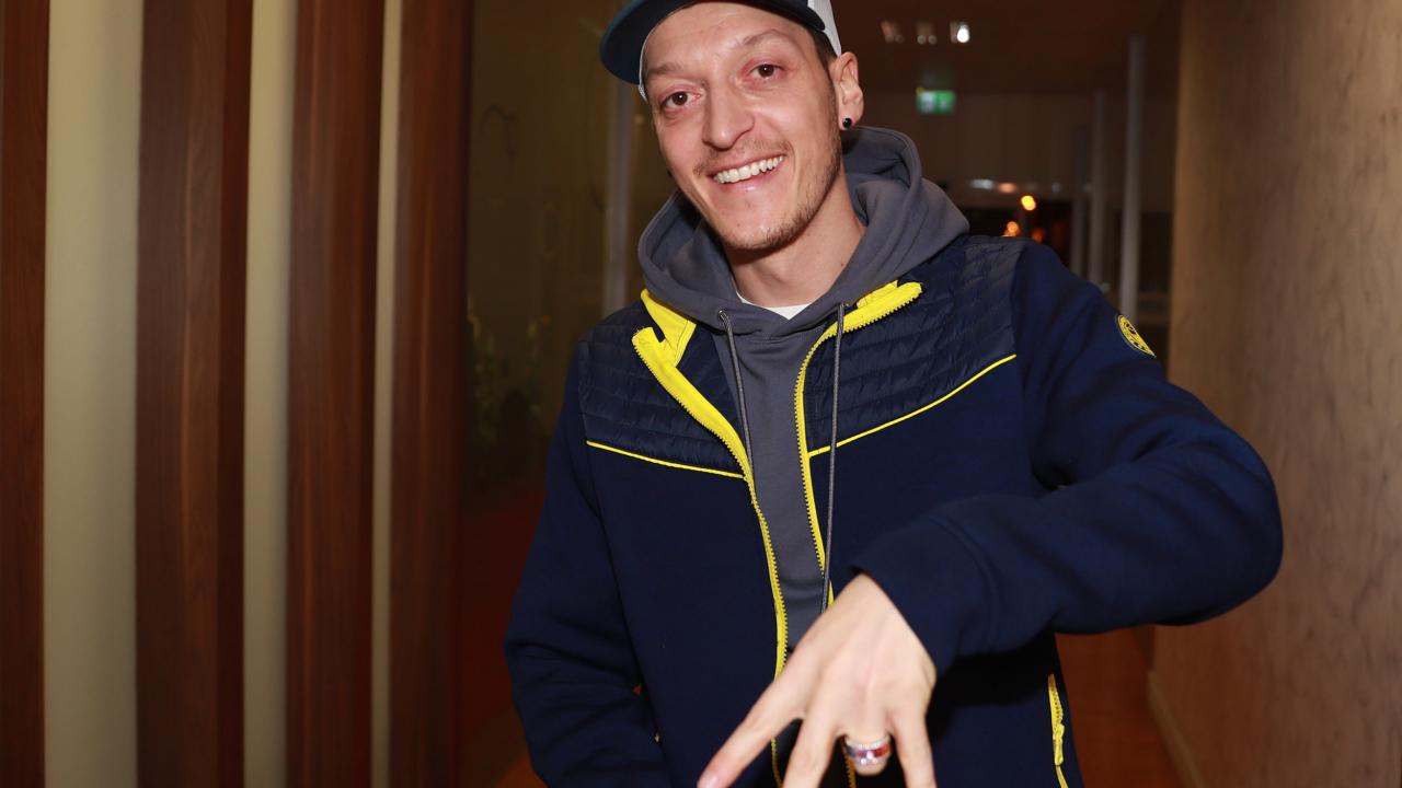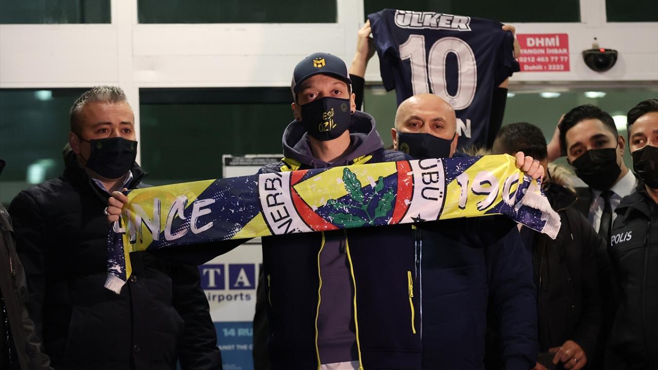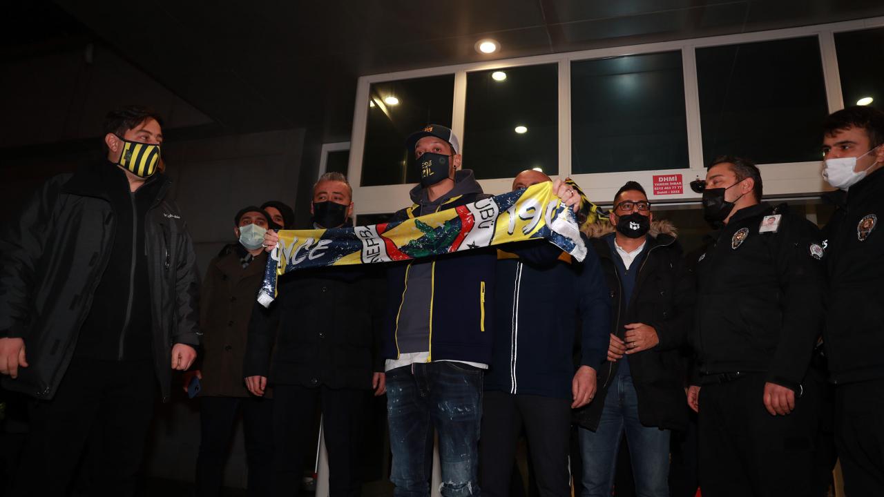 Mesut Özil terminalden çıkışı esnasında basın mensuplarına Fenerbahçe atkısıyla poz verdi.