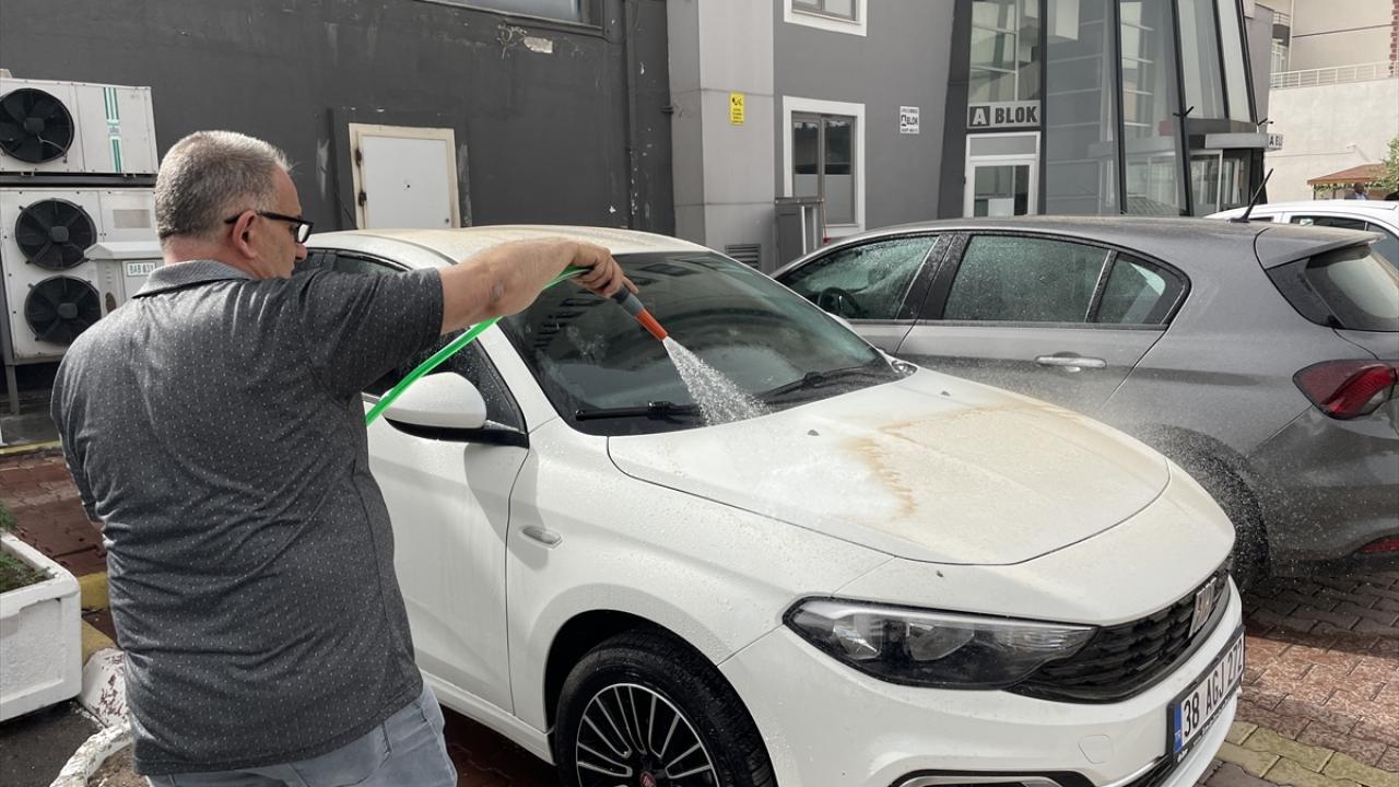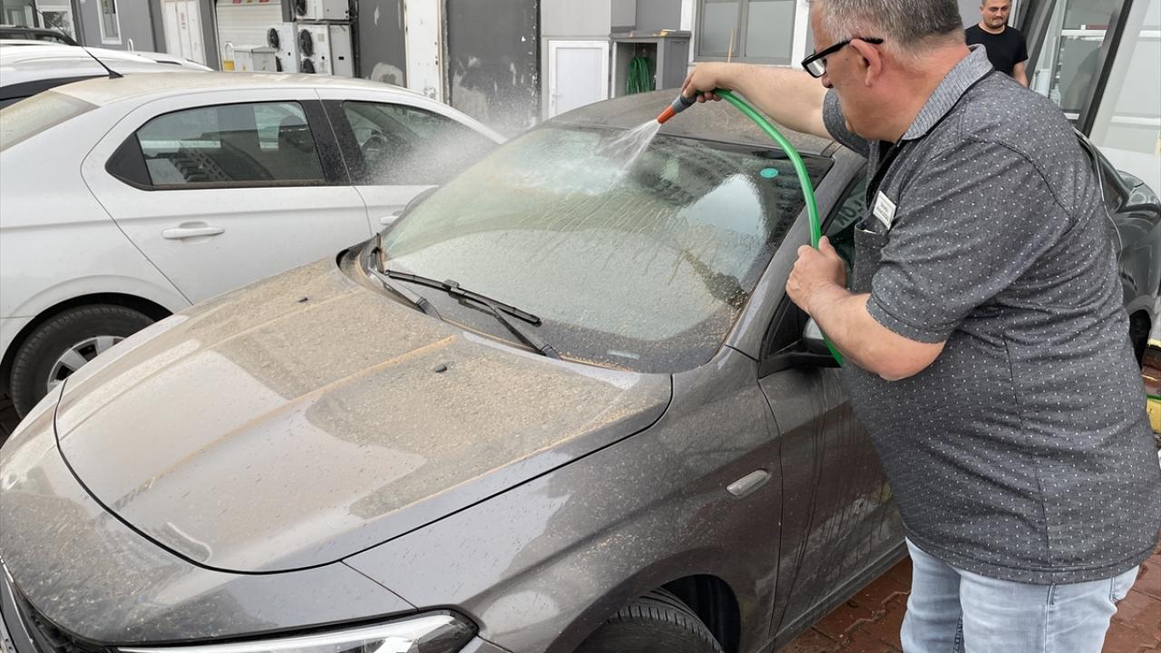 Toz taşınımı nedeniyle görüş mesafesinin düştüğü kentte vatandaşlar, tozla kaplanan araçlarını temizledi.