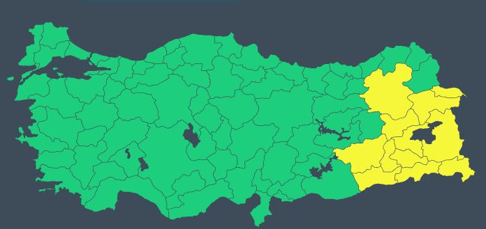 Meteoroloji Genel Müdürlüğü birçok ili "sarı" kodla uyardı. Doğu ve Güneydoğu'yu kapsayan 12 kentte fırtına ve sağanak bekleniyor. Yetkililer, sağanak ve fırtınayla birlikte sel, su baskını, heyelan, yıldırım, yağış anında kuvvetli rüzgar, ulaşımda aksamalar gibi olumsuzluklara karşı dikkatli ve tedbirli olunması konusunda uyardı.