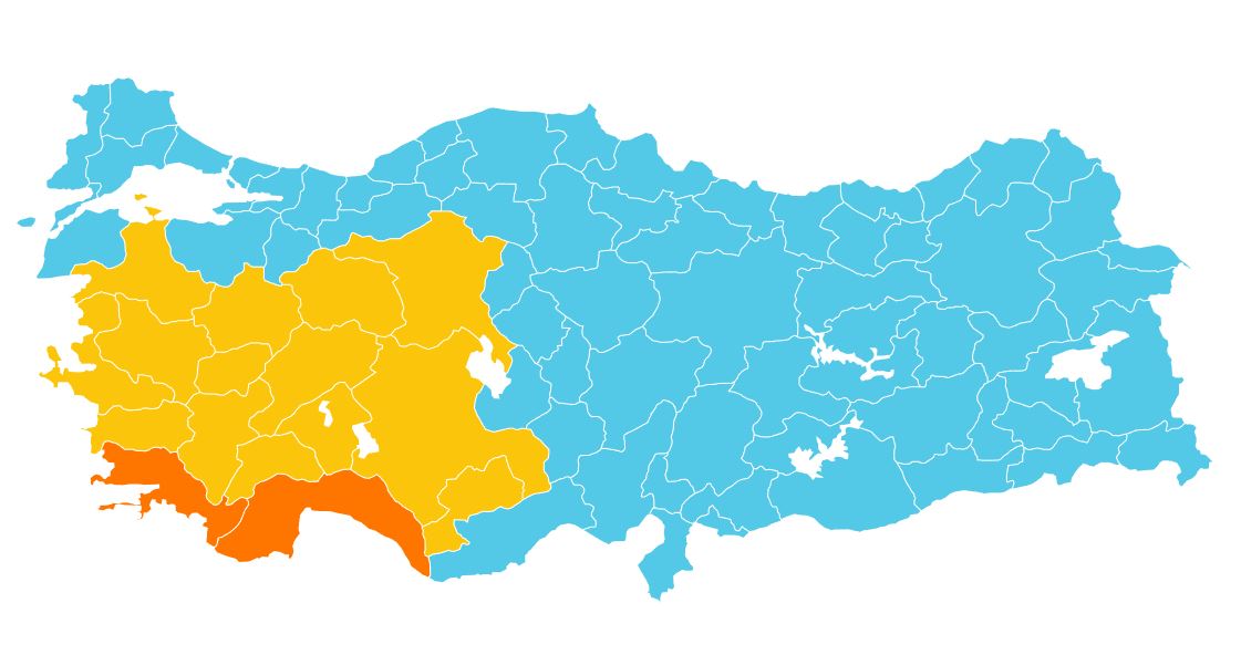 Hava durumu tehlikelidir: Tahmin edilen meteorolojik hadise sıklıkla görülmemektedir. Hasar ve kayıpların oluşması muhtemeldir. Çok tedbirli olmalı, güncel meteorolojik koşullar ve tahminler takip edilmelidir.